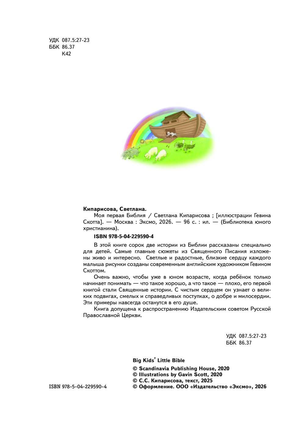 В этой книге сорок две истории из Библии рассказаны специально для детей. Самые главные сюжеты из Священного Писания изложены живо и интересно. Светлые и радостные, близкие сердцу каждого малыша рисунки созданы современным английским художником Гевином Скоттом.