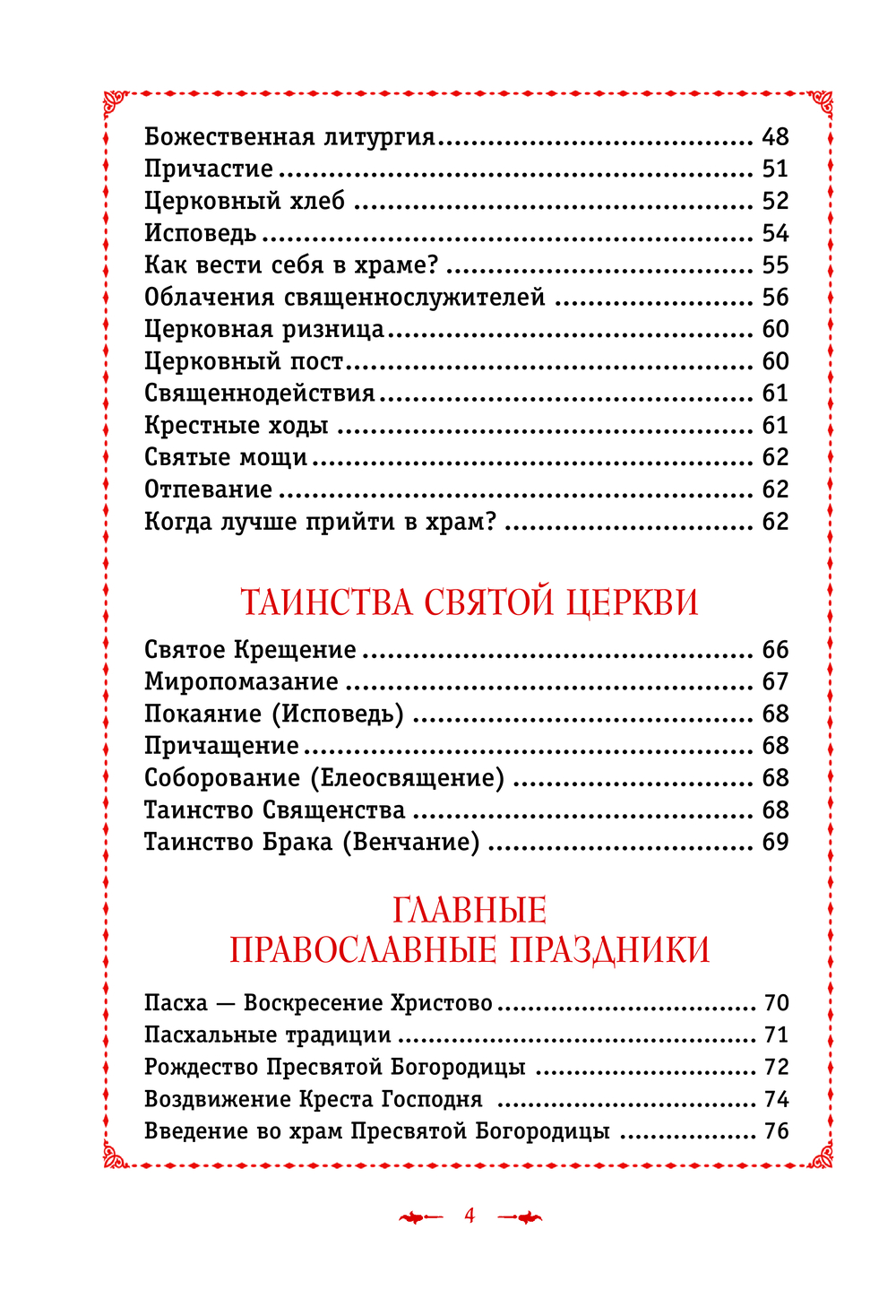 В книге вы найдете советы о том, как покрестить ребёнка, как подготовиться к исповеди и причастию; узнаете об особо почитаемых иконах, устройстве алтаря, богослужениях и о многом другом. В конце издания есть краткий словарь церковных терминов и собраны самые главные молитвы.
