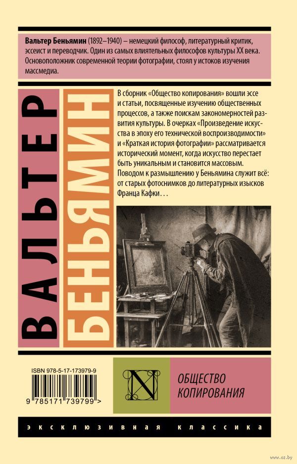 В сборник "Общество копирования" вошли эссе и статьи, посвященные изучению общественных процессов, а также поискам закономерностей развития культуры. В очерках "Произведение искусства в эпоху его технической воспроизводимости" и "Краткая история фотографии" рассматривается исторический момент, когда искусство перестает быть уникальным и становится массовым. Поводом к размышлению у Беньямина служит всё: от старых фотоснимков до литературных изысков Франца Кафки…