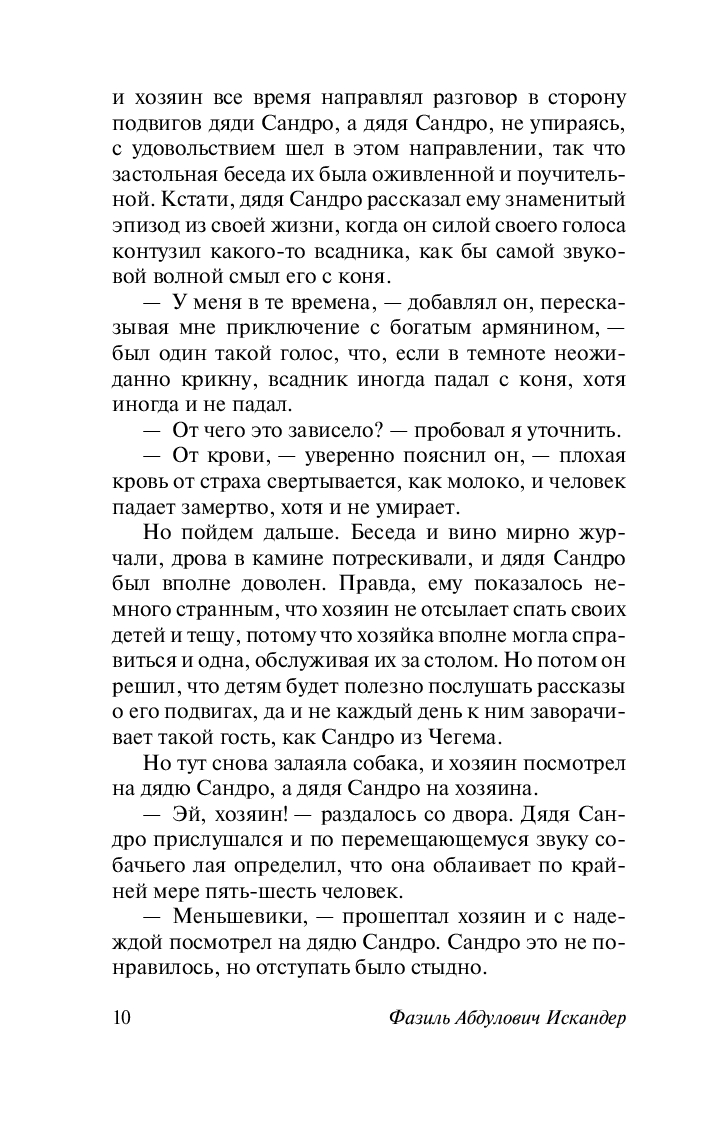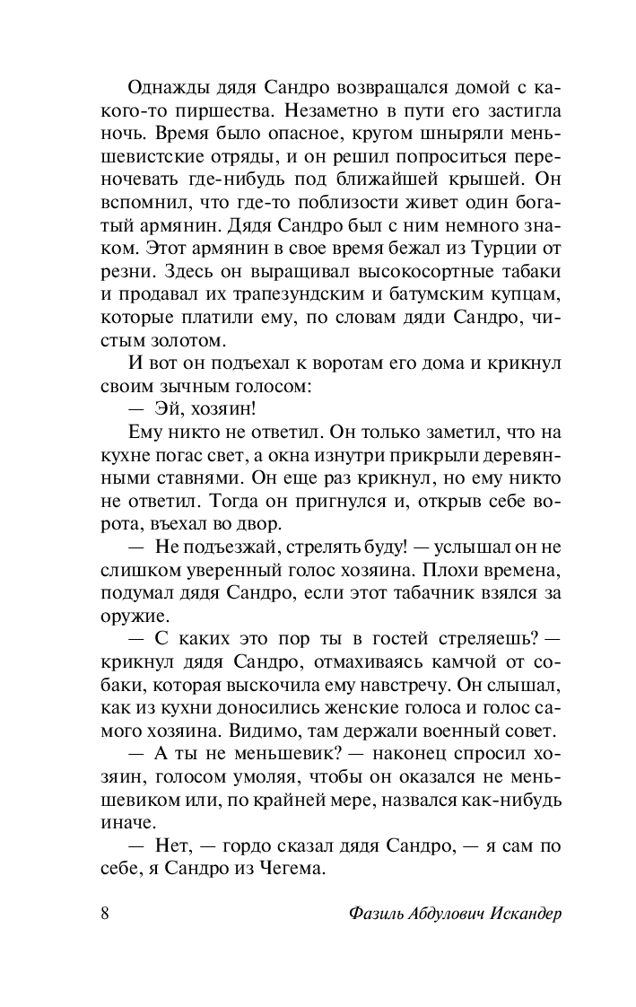 Цикл "Сандро из Чегема" Фазиль Искандер писал в течение тридцати лет. Все рассказы в нем объединяют два общих персонажа: дядя Сандро – настоящий народный герой, хитрец и плут, который находит выход из любой проблемной ситуации и "за большими общественными делами не забывает о маленьких личных удовольствиях", и молодой журналист, который записывает отдельные эпизоды из жизни своего знакомого.