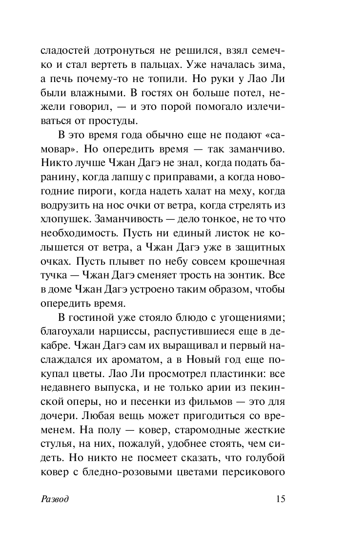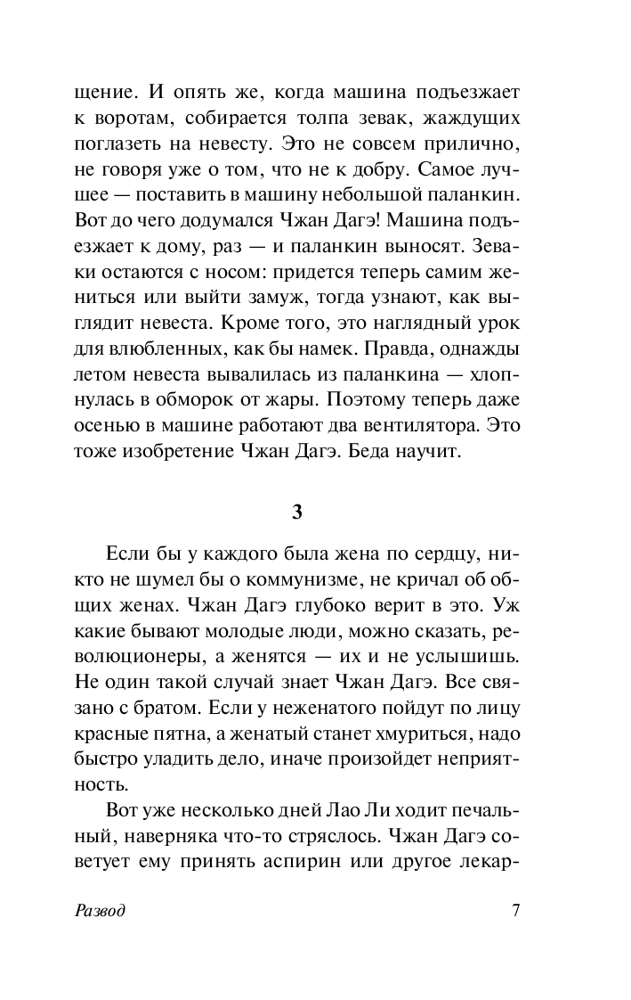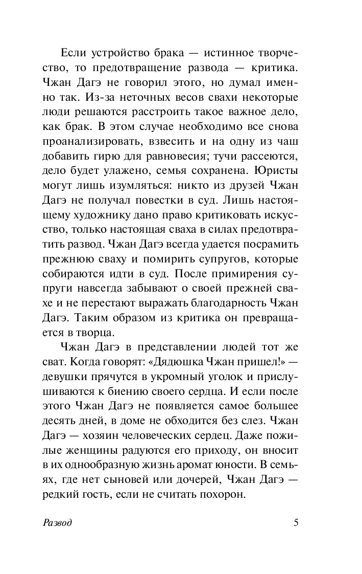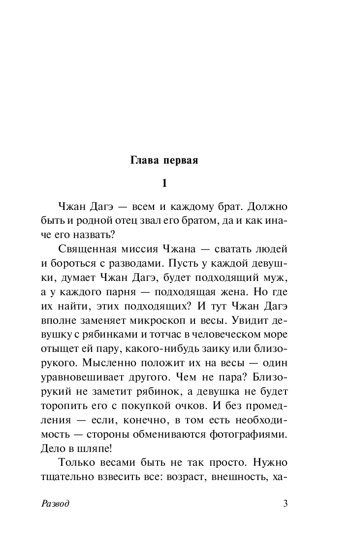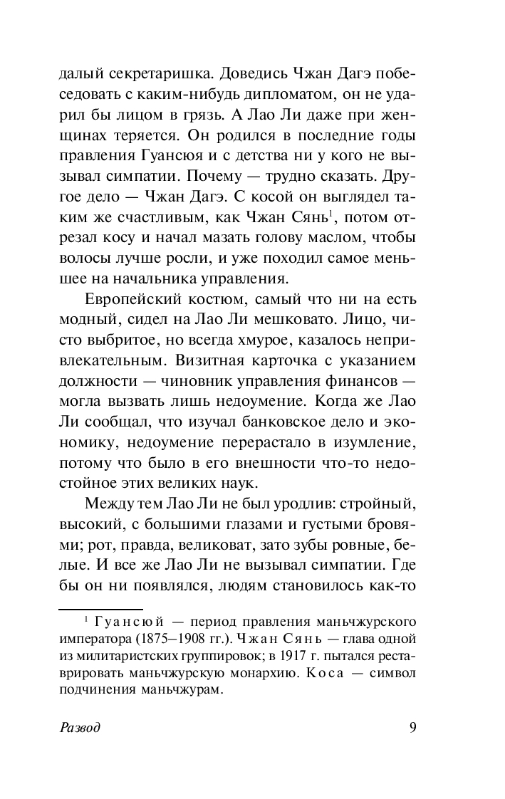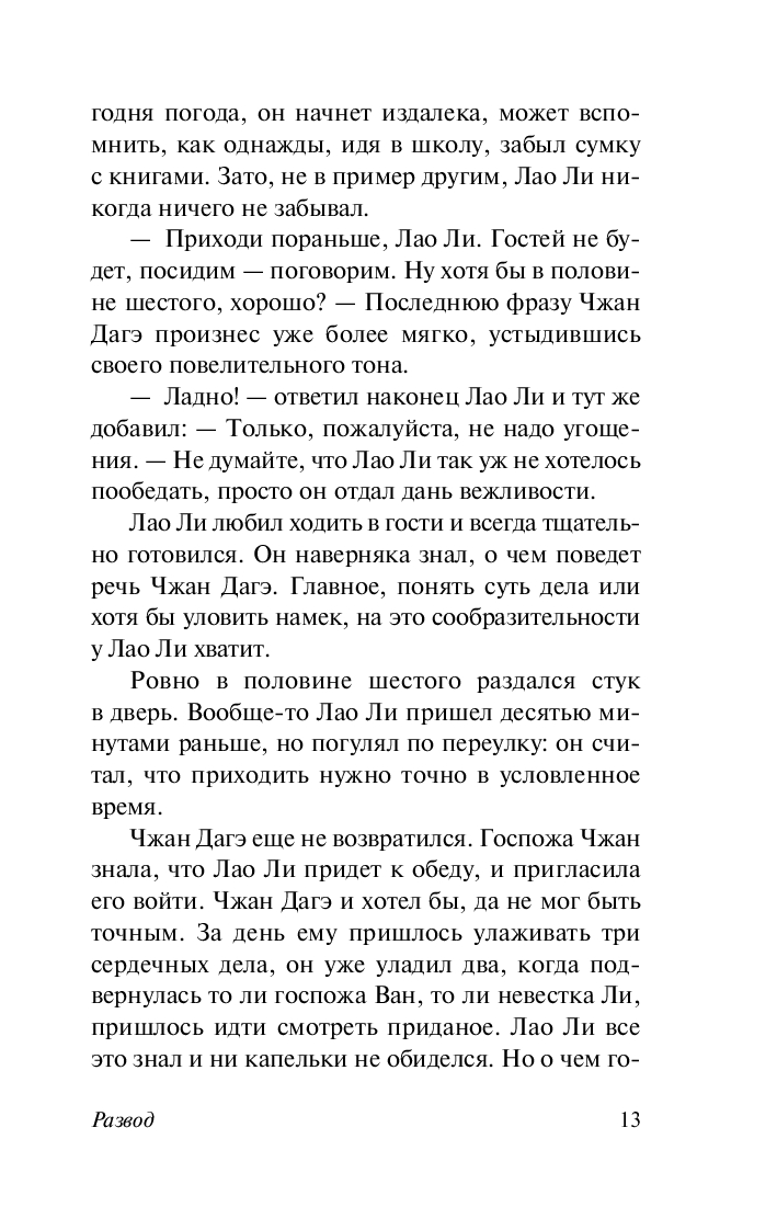 "Развод" – социально-психологический роман о пекинских чиновниках с их заботами и страстями, об их серых буднях с нелюбимыми женами и робких мечтах о лучшей жизни. Лао Шэ с иронией описывает финансовое управление, в котором работают одни мужчины, где царит атмосфера слухов и интриг, а его работники, "маленькие люди", мнят себя важными персонами.
