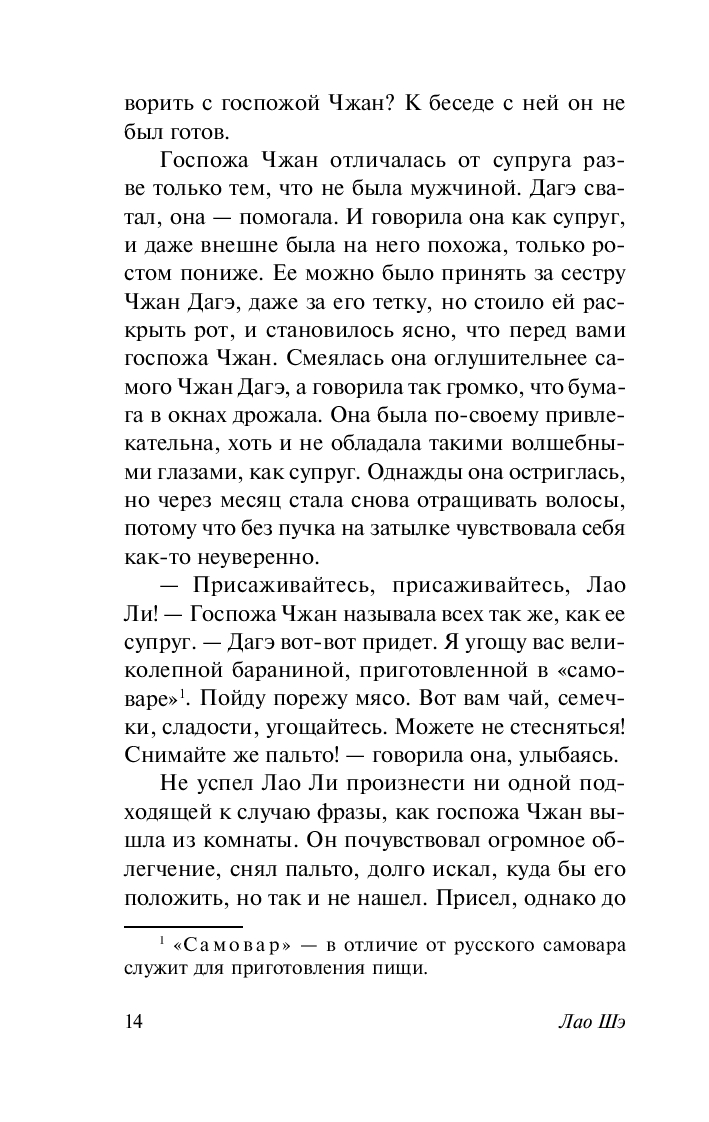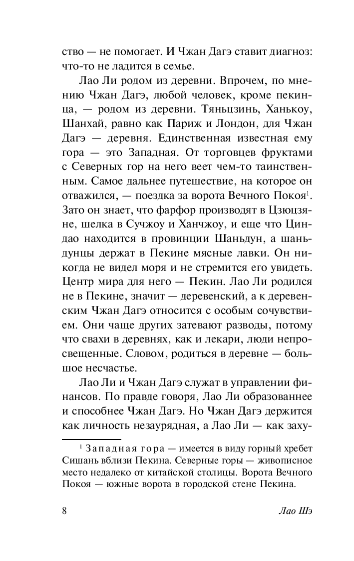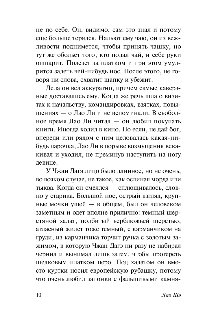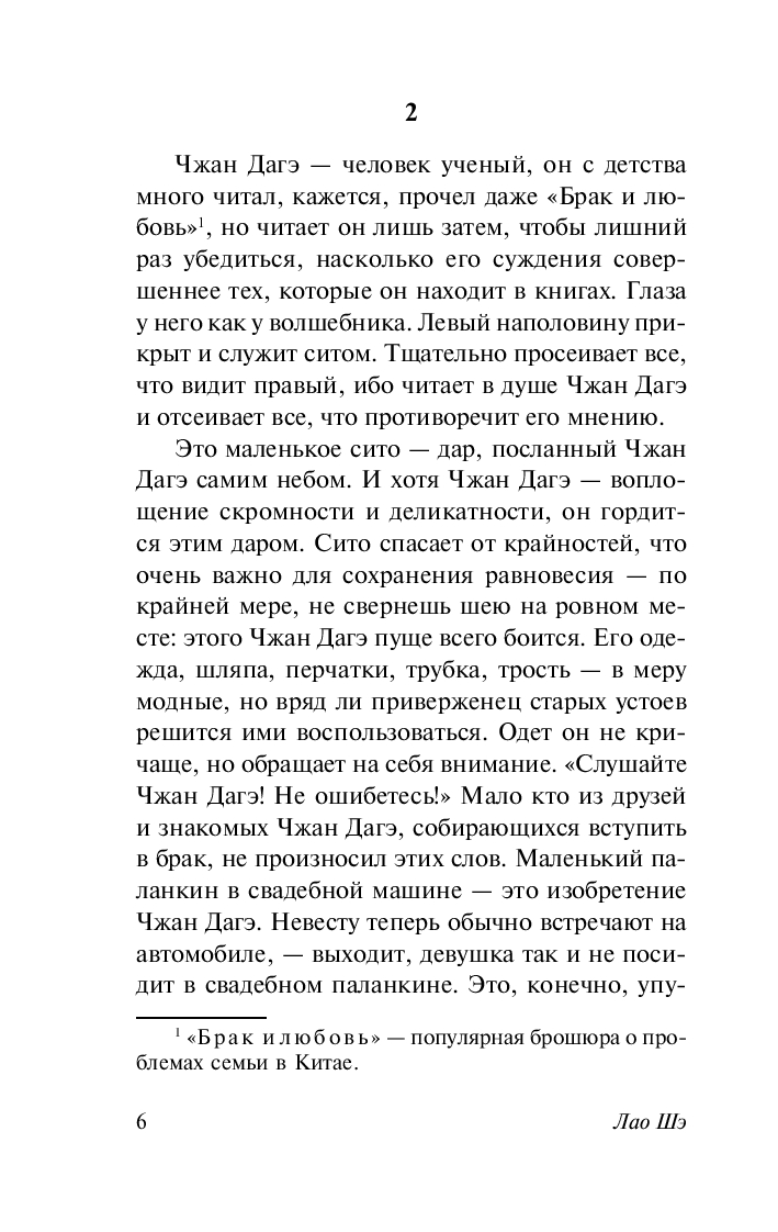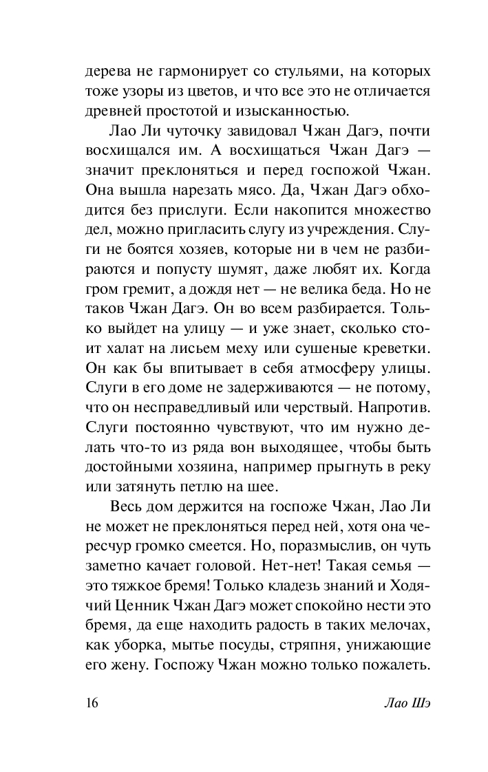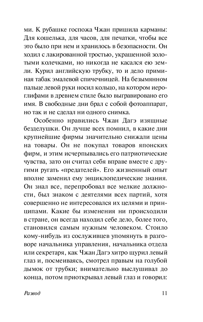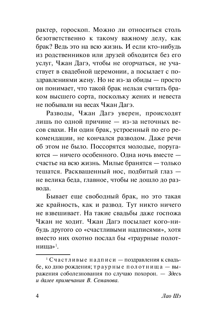 "Развод" – социально-психологический роман о пекинских чиновниках с их заботами и страстями, об их серых буднях с нелюбимыми женами и робких мечтах о лучшей жизни. Лао Шэ с иронией описывает финансовое управление, в котором работают одни мужчины, где царит атмосфера слухов и интриг, а его работники, "маленькие люди", мнят себя важными персонами.