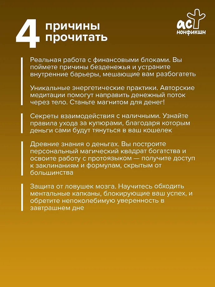 Практическое руководство по обращению с деньгами и самопрограммированию на богатство. Автор предлагает трансформировать свое денежное мышление и перестроить восприятие для того, чтобы достичь материального комфорта и уверенности в завтрашнем дне.