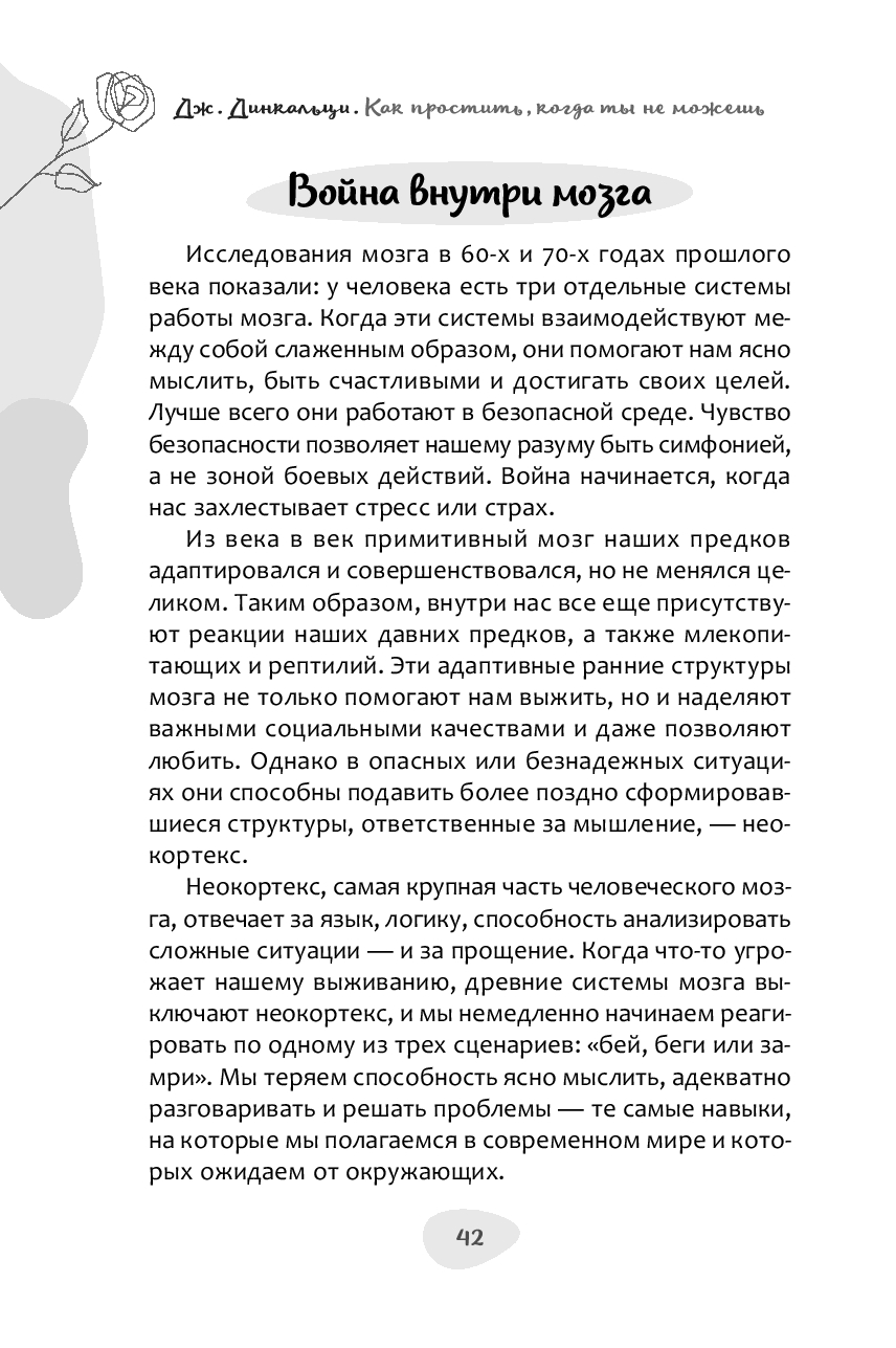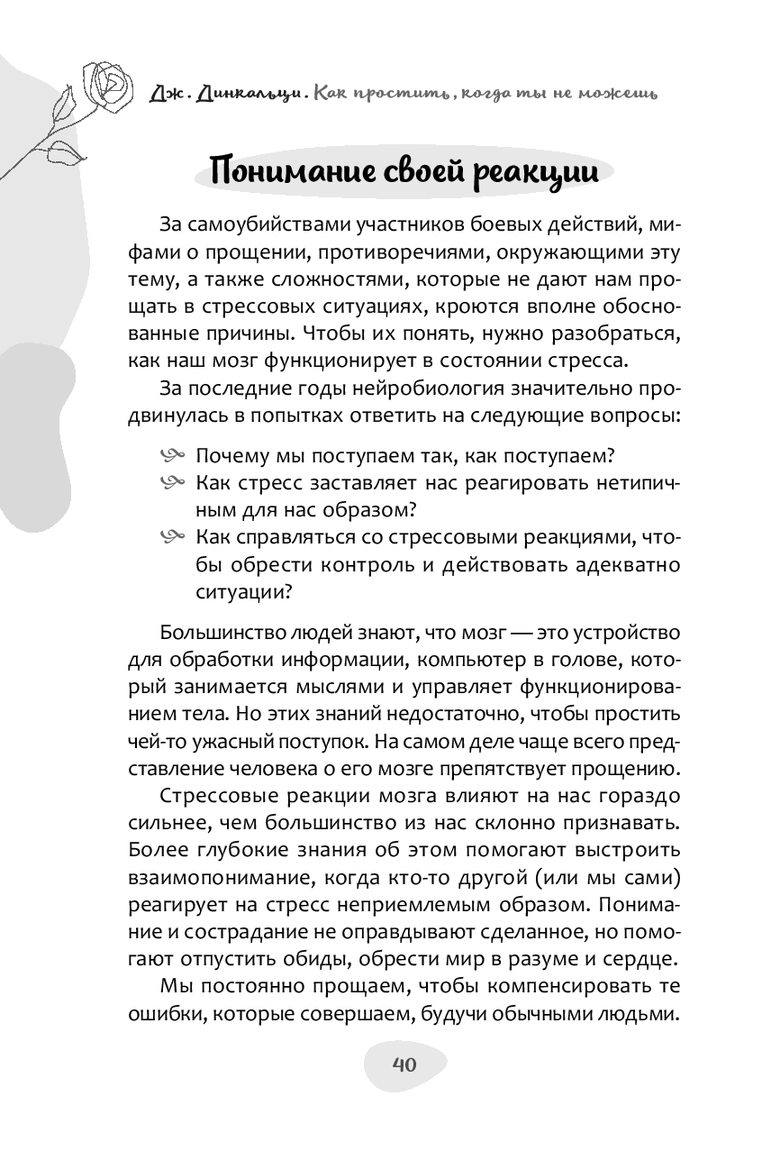 Книга доктора Джима Динкальци – о том, как научиться прощать благодаря проверенным методам из психологии и духовным практикам, в ней представлены взгляды и теории, которые позволяют преодолеть эмоциональные препятствия, мешающие прощению. С ее помощью вы сможете изучить шаблоны в работе мозга и эмоциональные защиты, чтобы лучше понять, почему прощать так трудно и как облегчить этот процесс. Вы перестанете копить в себе негатив, обретете покой и начнете вновь испытывать радость от общения с людьми, даже если в прошлом они причинили вам боль.