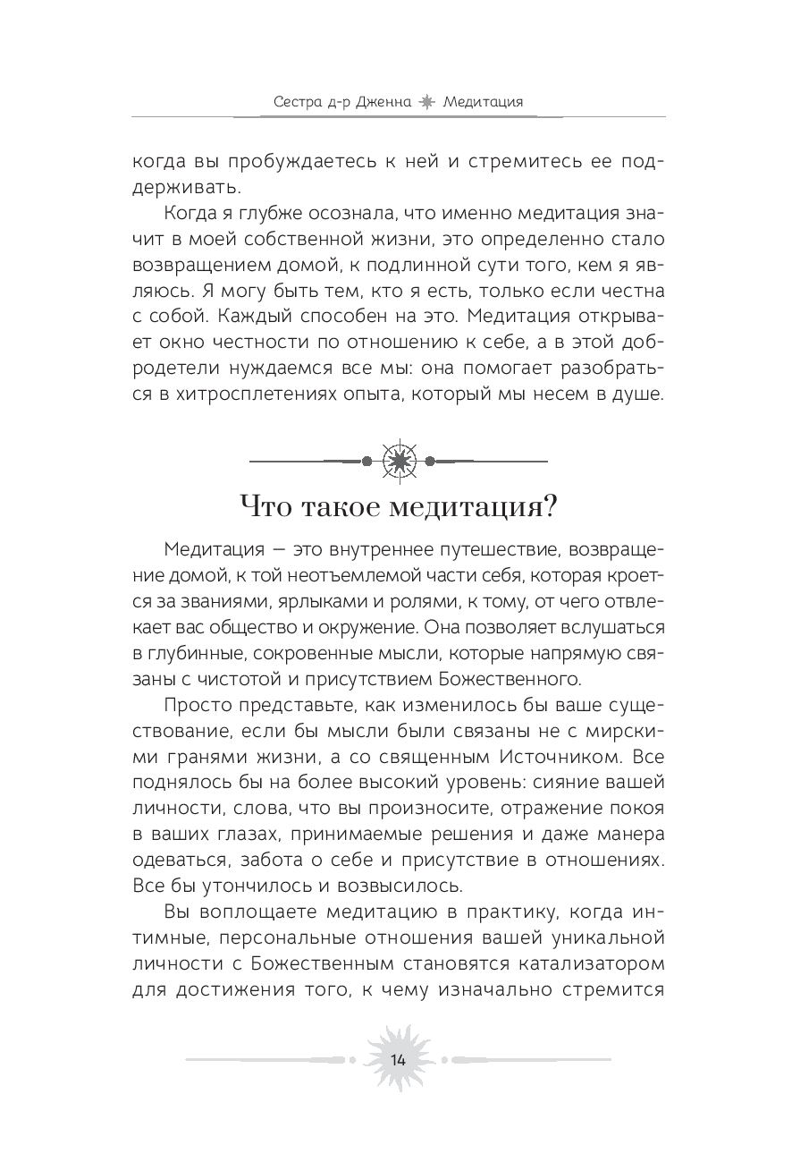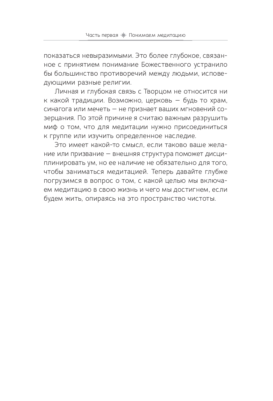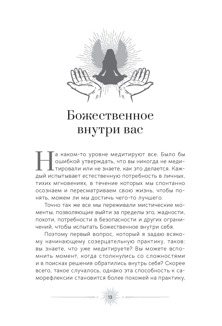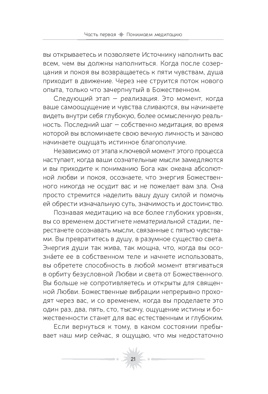 Медитация – это удивительное искусство видеть и чувствовать божественную энергию в каждом живом существе. Цель этой книги – позволить вам погрузиться внутрь себя, научиться вслушиваться в собственные мысли и понимать, откуда они исходят. Ведь если в их основе лежит чистота души, то мир вокруг начинает сиять новыми красками.