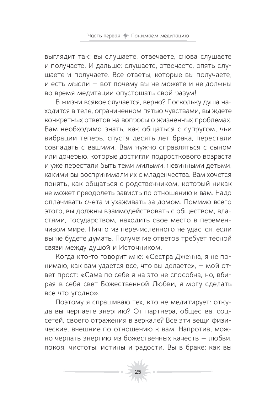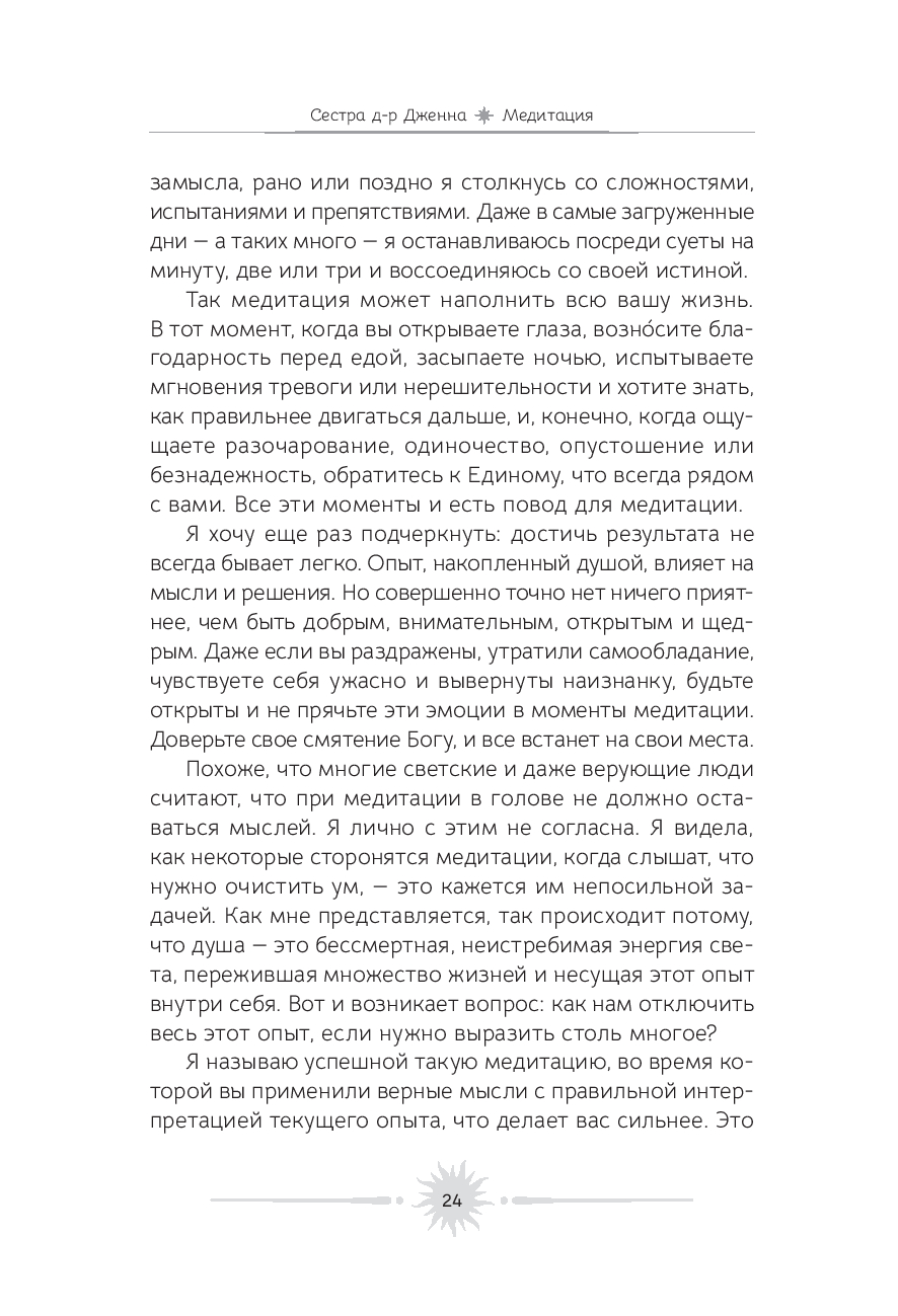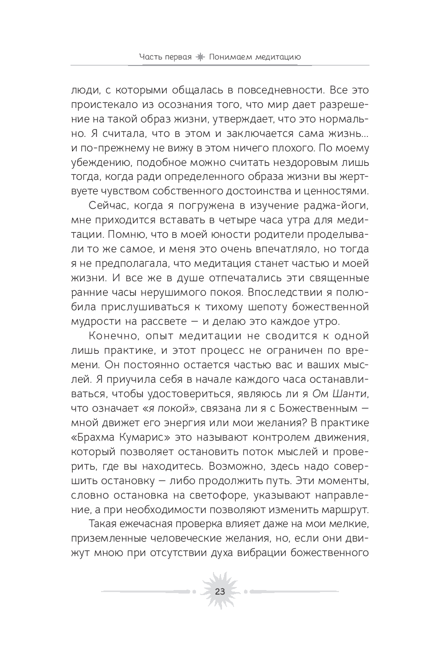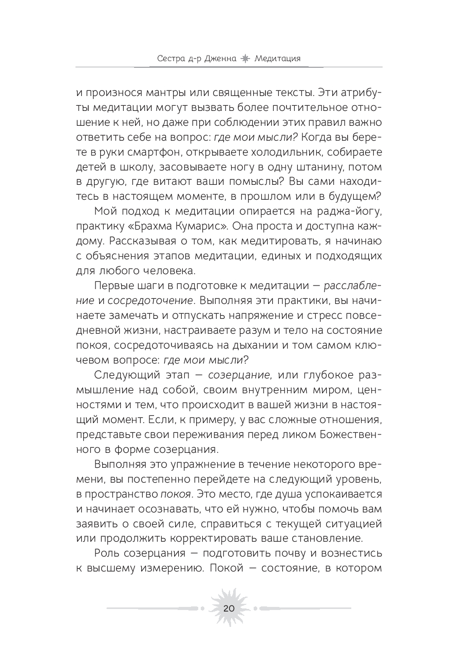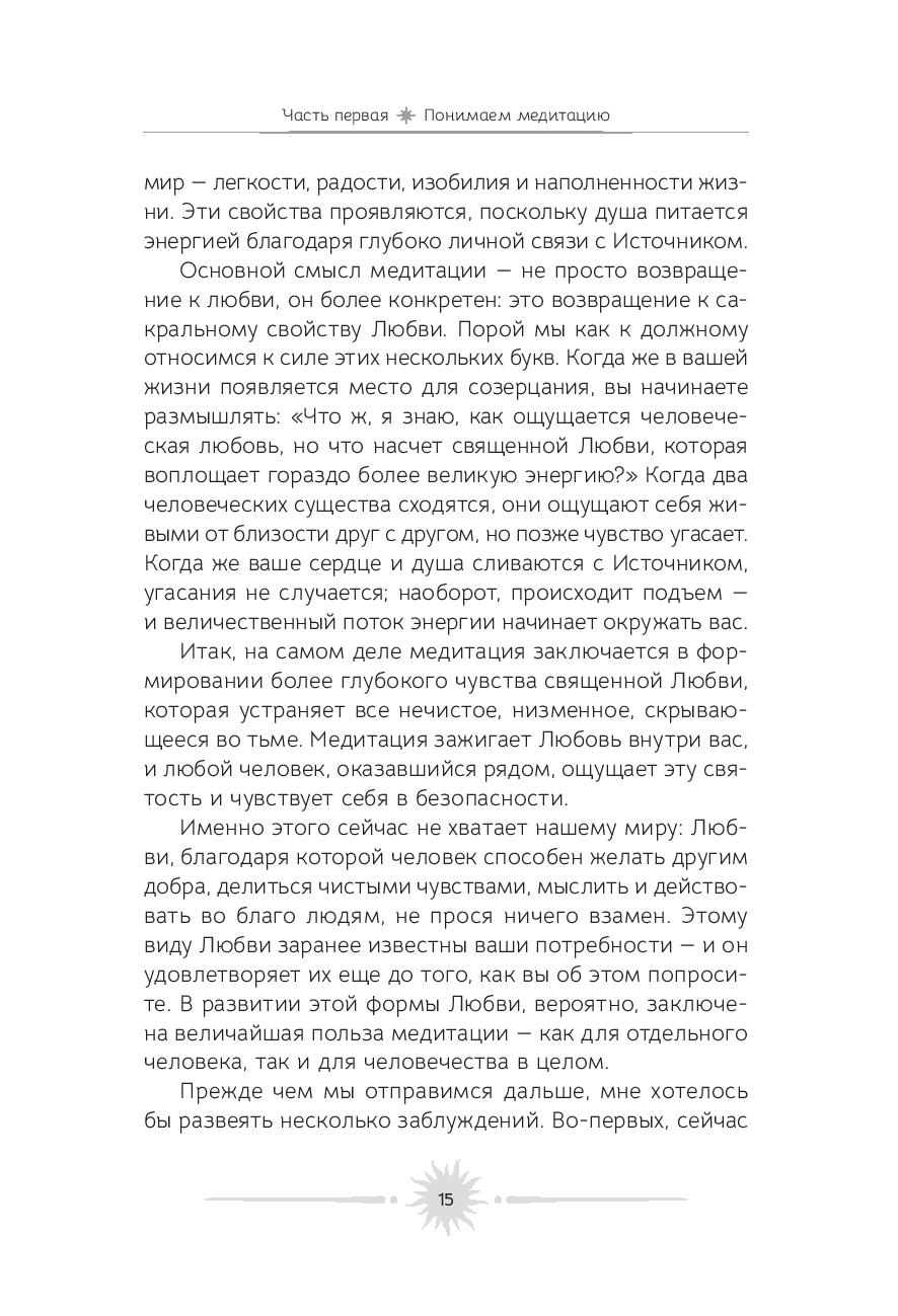 Медитация – это удивительное искусство видеть и чувствовать божественную энергию в каждом живом существе. Цель этой книги – позволить вам погрузиться внутрь себя, научиться вслушиваться в собственные мысли и понимать, откуда они исходят. Ведь если в их основе лежит чистота души, то мир вокруг начинает сиять новыми красками.