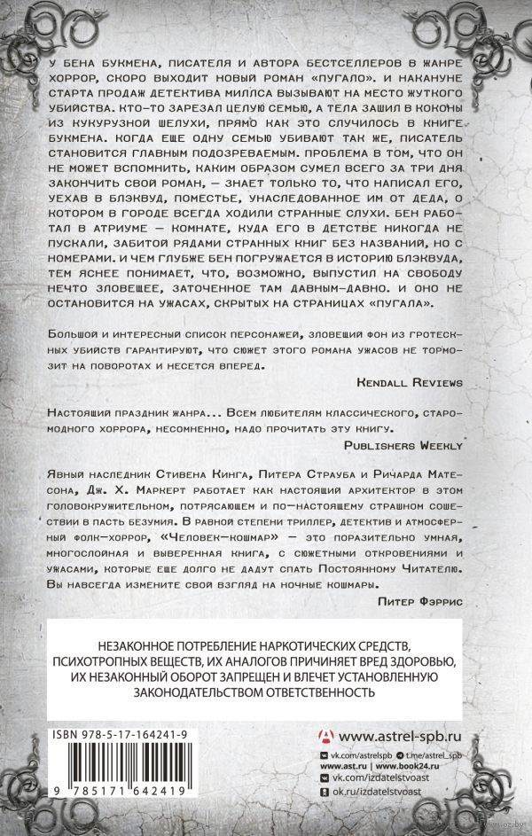 У Бена Букмена, писателя и автора бестселлеров в жанре хоррор, скоро выходит новый роман "Пугало". И накануне старта продаж детектива Миллса вызывают на место жуткого убийства. Кто-то зарезал целую семью, а тела зашил в коконы из кукурузной шелухи, прямо как это случилось в книге Букмена. Когда еще одну семью убивают так же, писатель становится главным подозреваемым. Проблема в том, что он не может вспомнить, каким образом сумел всего за три дня закончить свой роман, – знает только то, что написал его, уехав в Блэквуд, поместье, унаследованное им от деда, о котором в городе всегда ходили странные слухи. Бен работал в атриуме – комнате, куда его в детстве никогда не пускали, забитой рядами странных книг без названий, но с номерами. И чем глубже Бен погружается в историю Блэквуда, тем яснее понимает, что, возможно, выпустил на свободу нечто зловещее, заточенное там давным-давно. И оно не остановится на ужасах, скрытых на страницах "Пугала".