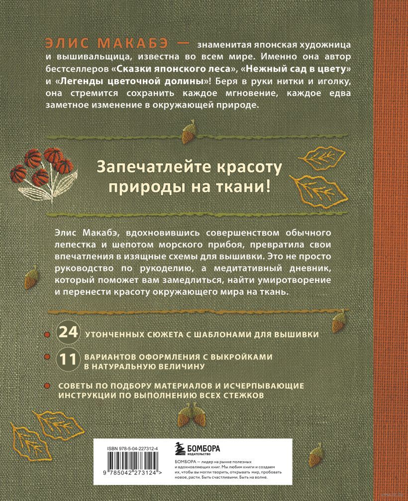 Элис Макабэ, вдохновившись совершенством каждого лепестка и шепотом морского прибоя, превратила свои впечатления в изящные схемы для вышивки. Это не просто руководство по рукоделию, а медитативный дневник, который поможет вам замедлиться, найти умиротворение и перенести красоту окружающего мира на ткань.