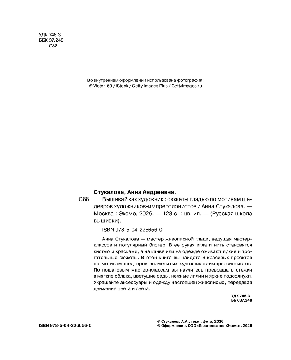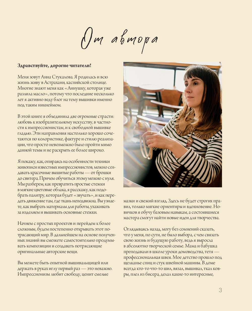 Анна Стукалова – мастер живописной глади. Она разработала 8 красивейших проектов по мотивам шедевров знаменитых художников-импрессионистов. Превратите стежки в мягкие облака, цветущие сады, нежные лилии и яркие подсолнухи! По пошаговым мастер-классам научитесь передавать движение цвета и света и изучите все тонкости вышивки по разным тканям, сделав особенными любые аксессуары и одежду.