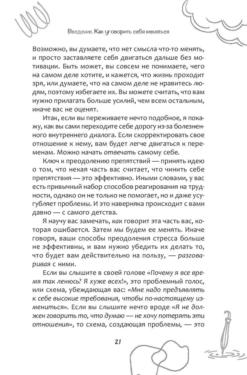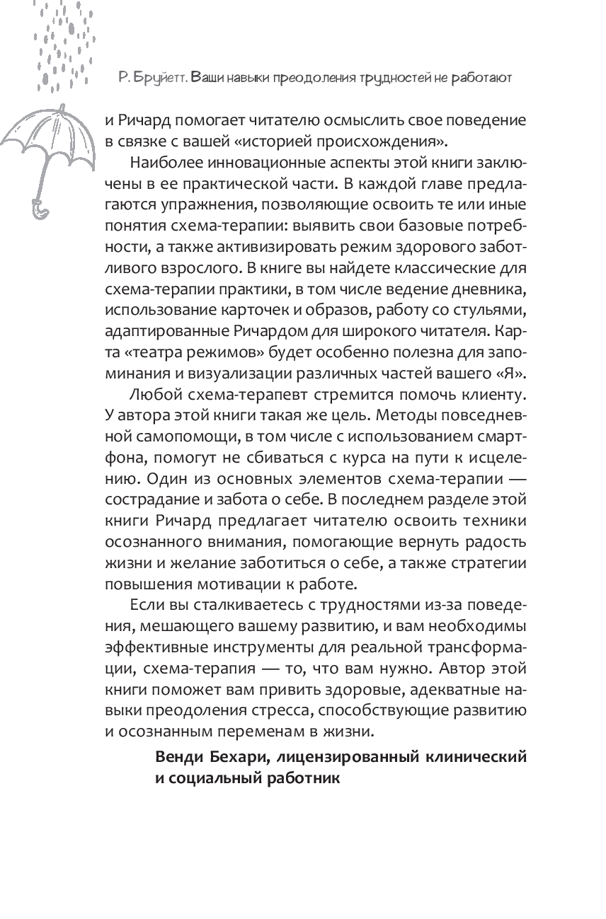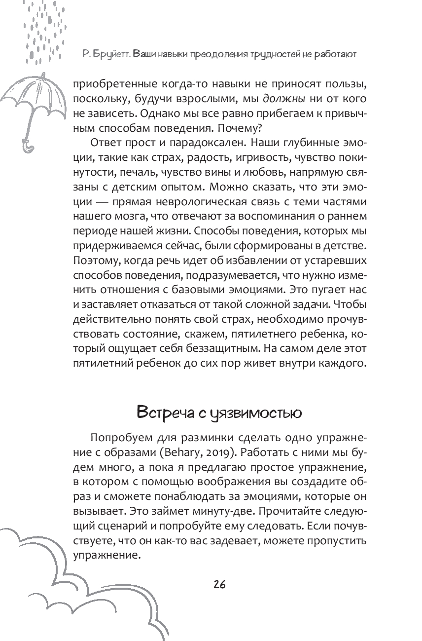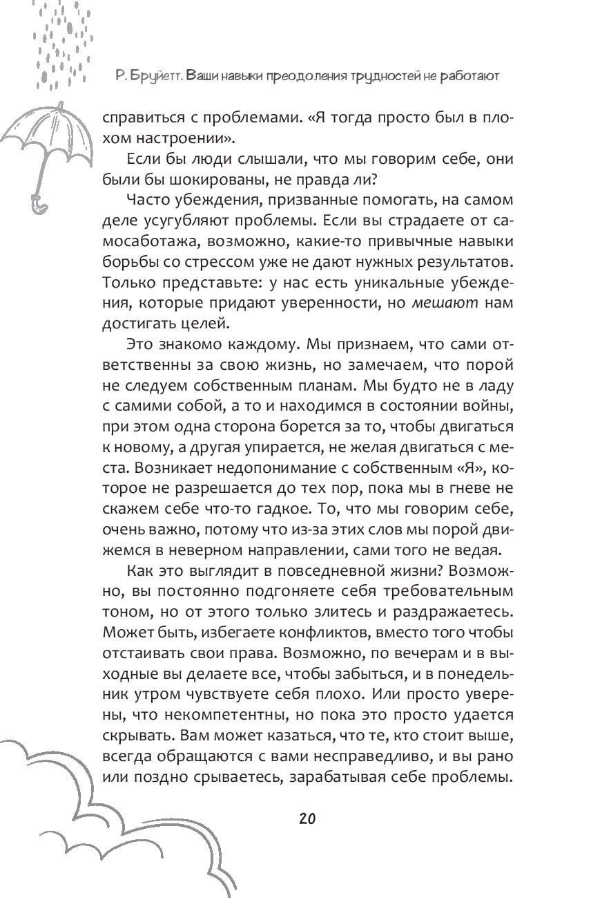 Книга "Ваши навыки преодоления трудностей не работают" поможет вам осознать, как вырваться из порочного круга устоявшихся привычек, признать, что у вас есть проблемы, которые нужно решить здесь и сейчас. Автор предлагает большое количество техник, которые помогут вам исцелить внутреннего ребенка, а также справиться со стрессами современной жизни. Вы научитесь проживать свои чувства, используя письменные практики, дыхательные упражнения, а также рескриптинг – т.е. проигрывание болезненной ситуации в своем воображении таким образом, чтобы она потеряла свои краски и стала нейтральной.