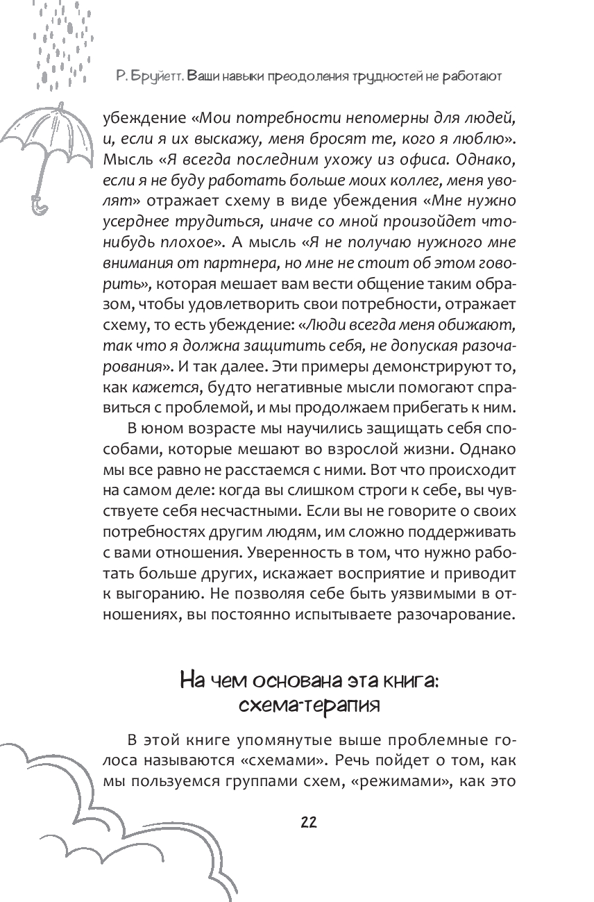 Как считает схема-терапевт Ричард Бруйетт, все эти деструктивные навыки самопомощи мы освоили еще в глубоком детстве. Когда-то они действительно помогали нам справляться с болью, избегать ее, однако сейчас, во взрослом возрасте, они лишь усугубляют наши проблемы.