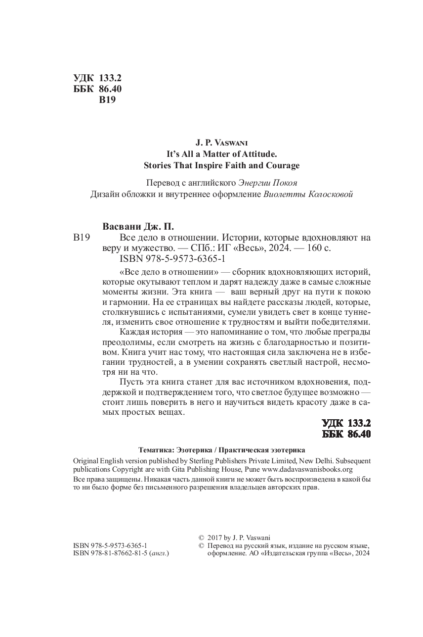 "Все дело в отношении" – сборник вдохновляющих историй, которые окутывают теплом и дарят надежду даже в самые сложные моменты жизни. Эта книга – ваш верный спутник на пути к покою и гармонии. На ее страницах вы найдете рассказы людей, которые, столкнувшись с испытаниями, сумели увидеть свет в конце туннеля, изменить своё отношение к трудностям и выйти победителями.