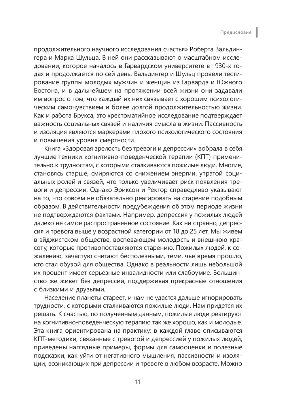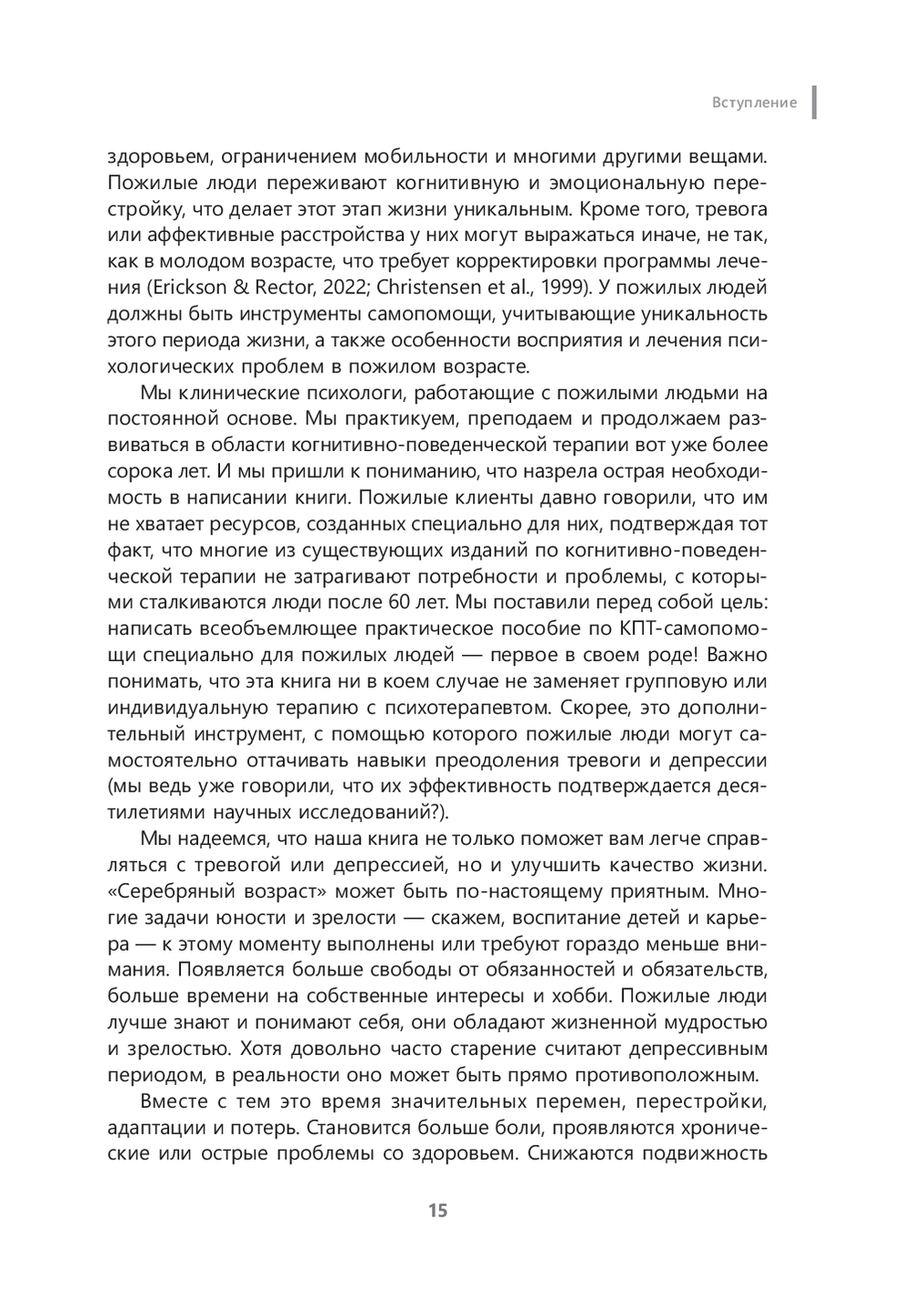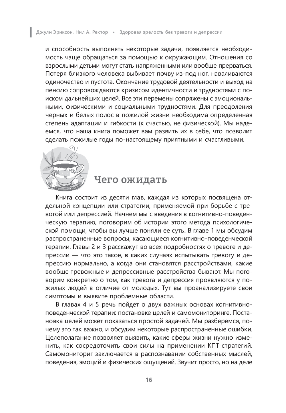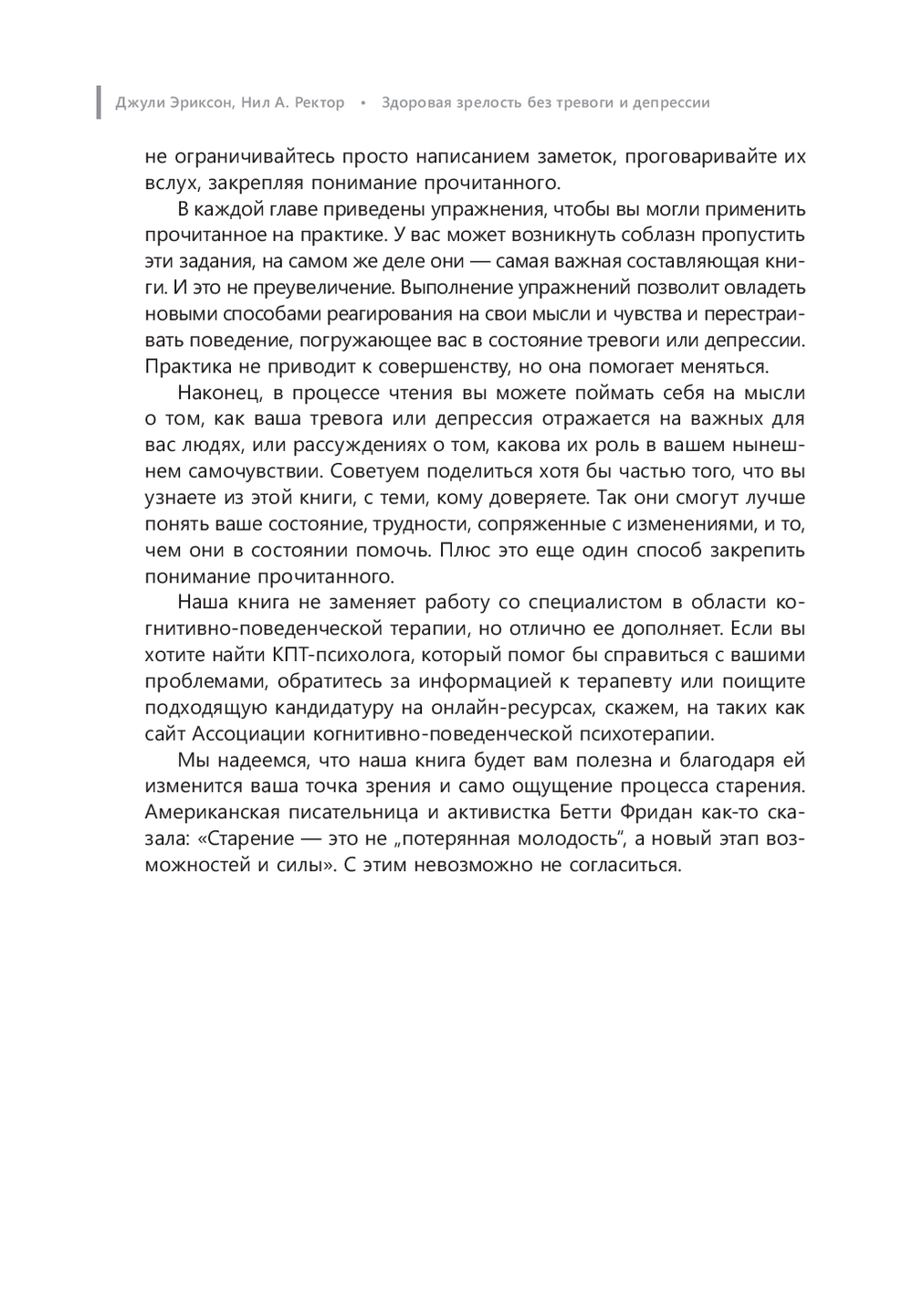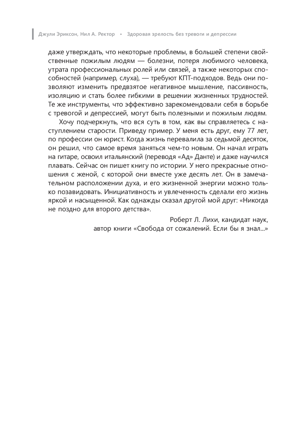 Как говорят Джули Эриксон и Ректор А. Нил: "Население планеты стареет, и нам не удастся дальше игнорировать трудности, с которыми сталкиваются пожилые люди. Нам придется их решать. К счастью, по полученным данным, пожилые люди реагируют на когнитивно-поведенческую терапию так же хорошо, как и молодые. Наша книга ориентирована на практику: в каждой главе описываются эффективные КПТ-методики, приведены наглядные примеры и полезные подсказки, как жить яркую и активную жизнь в любом возрасте".