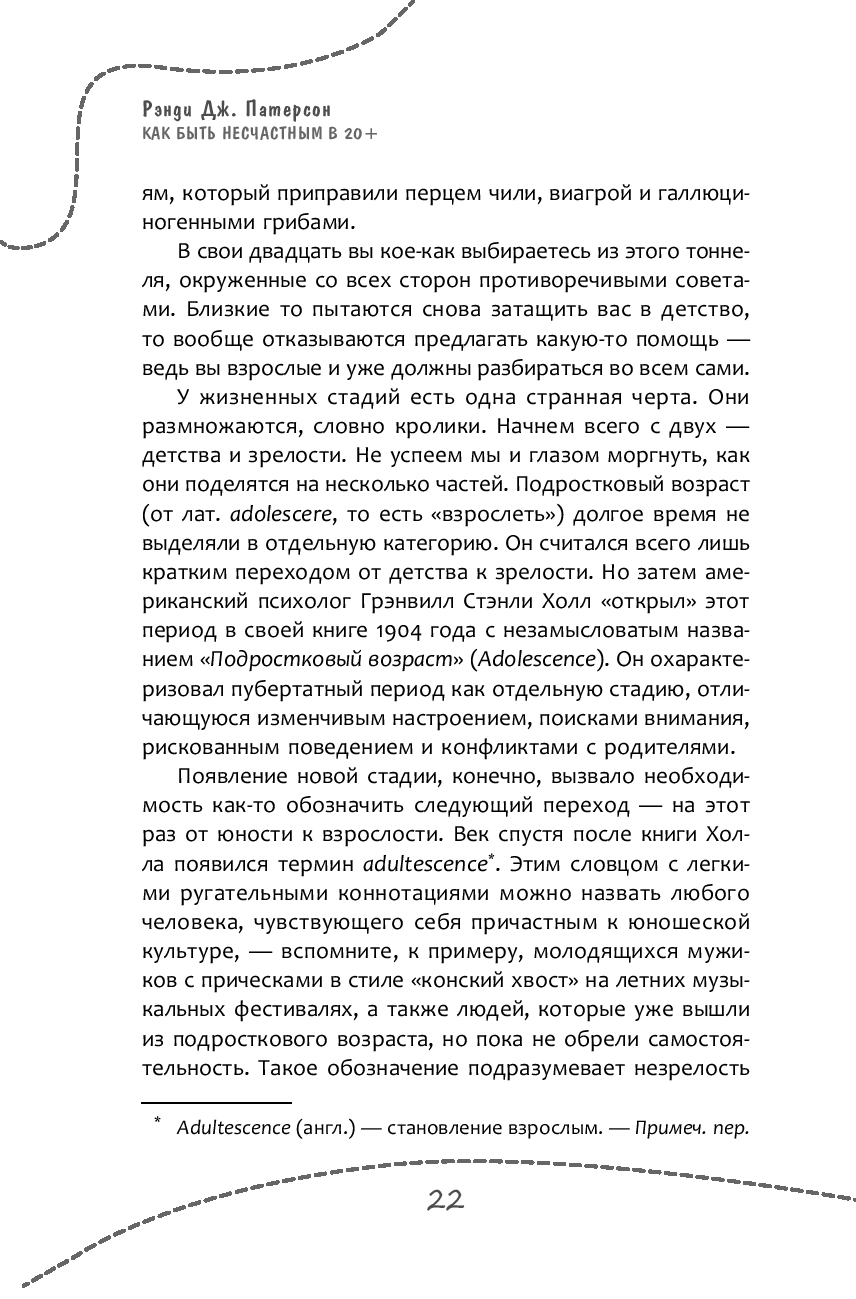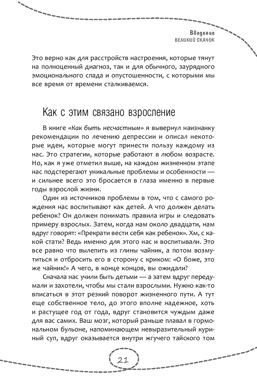Быть несчастным можно в любом возрасте, но именно переход к взрослой жизни предлагает множество уникальных способов пустить свою жизнь под откос. Никак не можете покинуть родительский дом и перекладываете все решения на окружающих? Сидите на диване и ждете, пока вам откроется истинное предназначение? Подчиняете свои цели и поведение расхожим стандартам и ярлыкам? Так держать! К несчастью ведет множество путей – вы всегда сможете найти тот, что придется по душе именно вам.