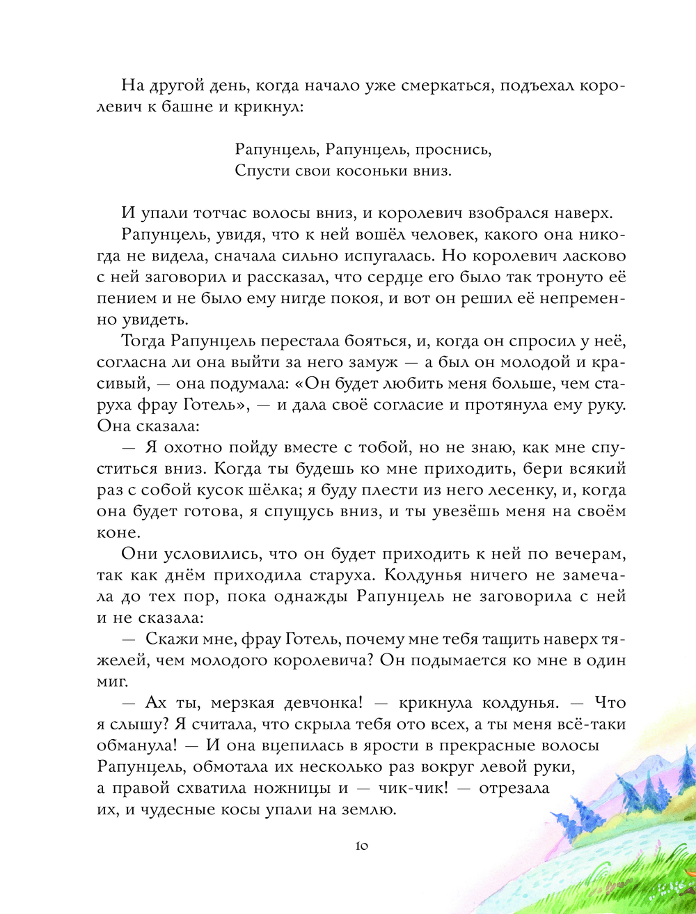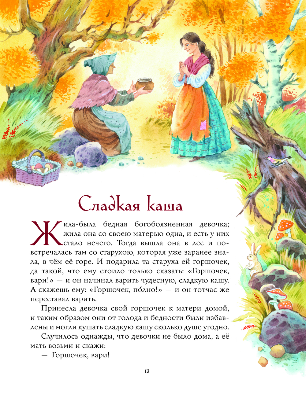 В книгу вошли 16 волшебных историй, собранных величайшими сказочниками мира: братьями Якобом и Вильгельмом Гриммами и Шарлем Перро. В их числе как произведения для самых юных читателей ("Красная Шапочка", "Сладкая каша", "Бременские музыканты", "Кот в сапогах"), так и истории для читателей постарше ("Госпожа Метелица", "Золушка", "Гензель и Гретель", "Спящая красавица").