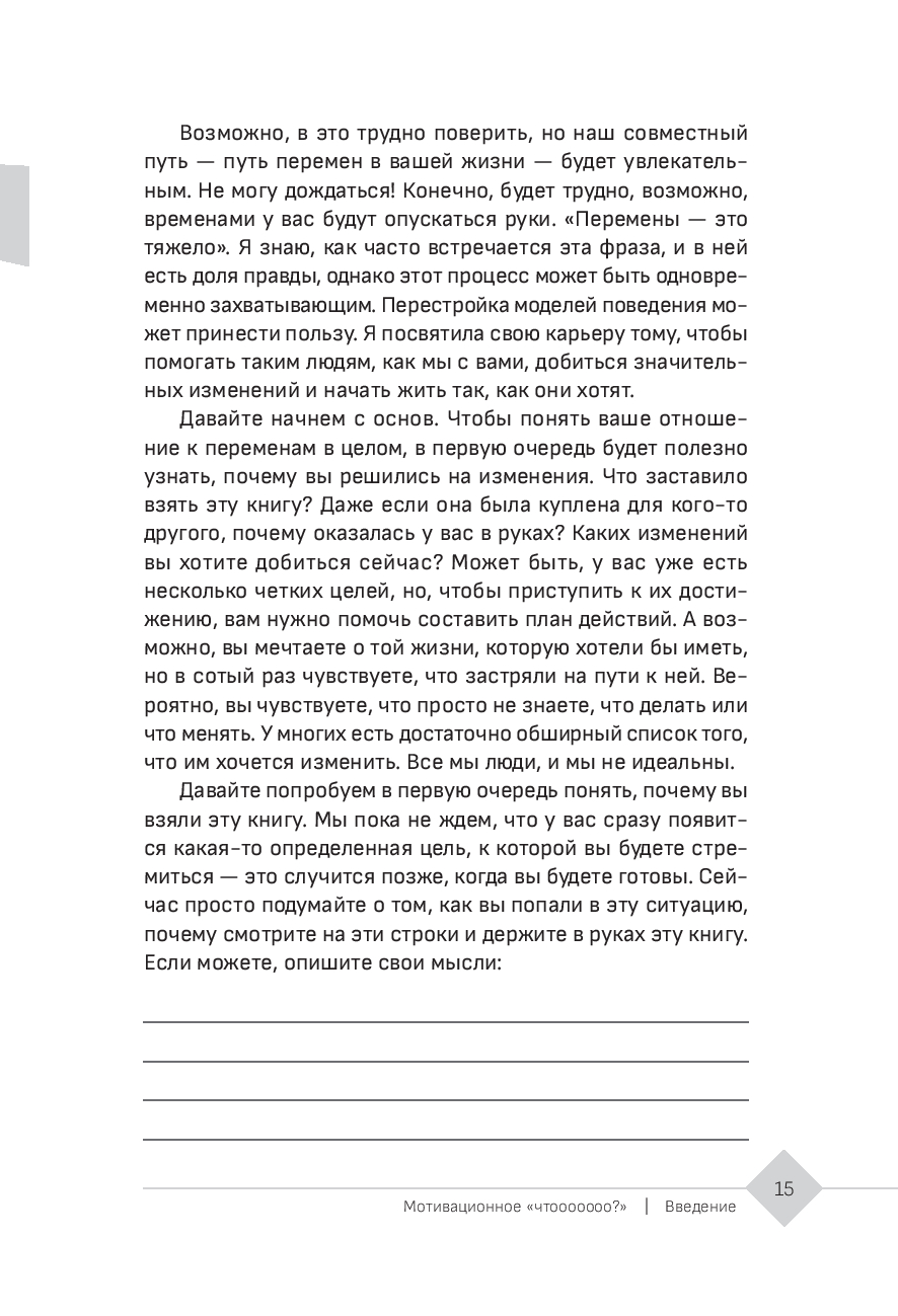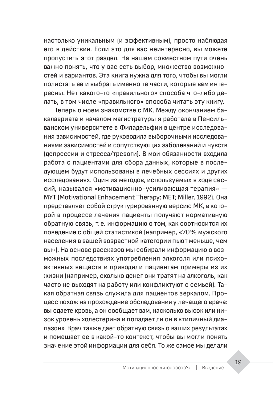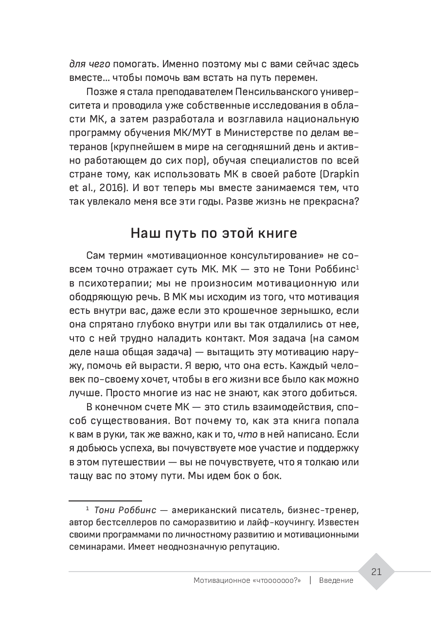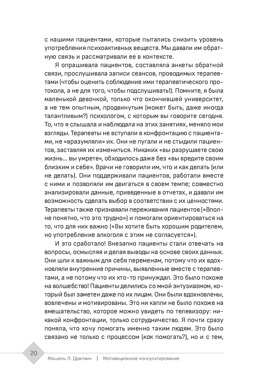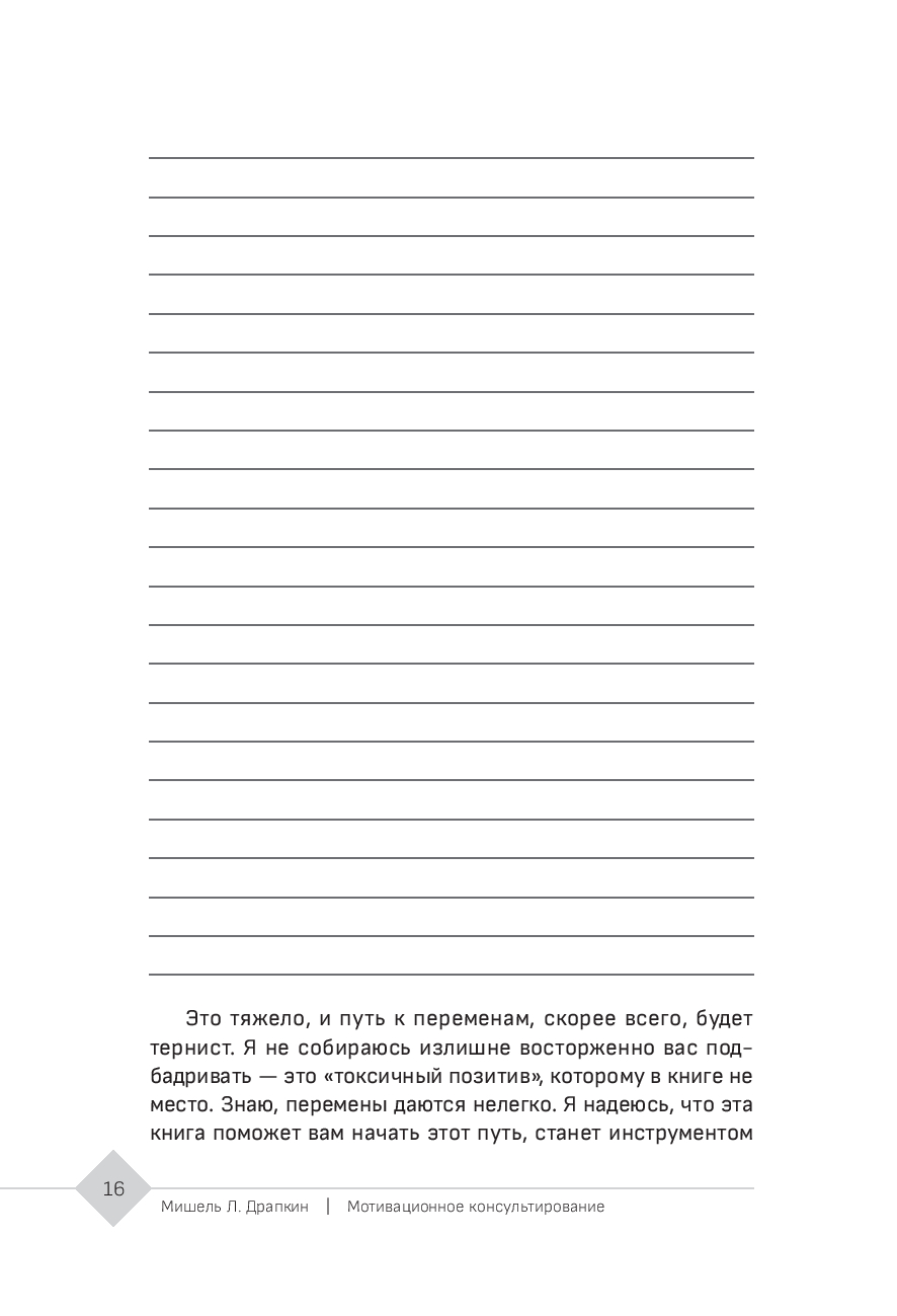 Книга написана с пониманием того, что менять жизнь к лучшему бывает непросто. Автор пишет о сложных вещах лаконично и понятно, рассказывает о своем опыте искренне и с юмором. Как говорит сама Мишель Л. Драпкин "Смысл мотивационного консультирования заключается в том, чтобы мы шли к переменам, устанавливали связи с ценностями и создавали жизнь вышей мечты".