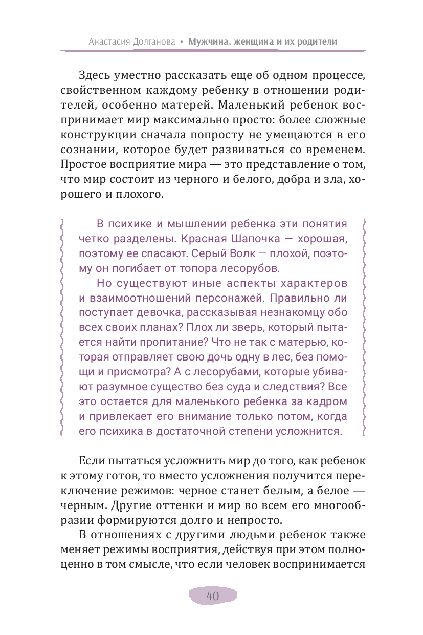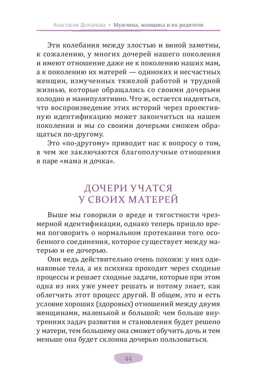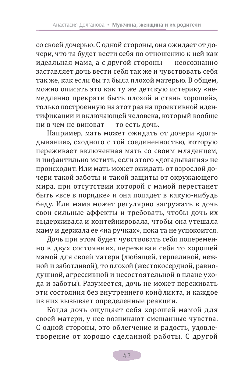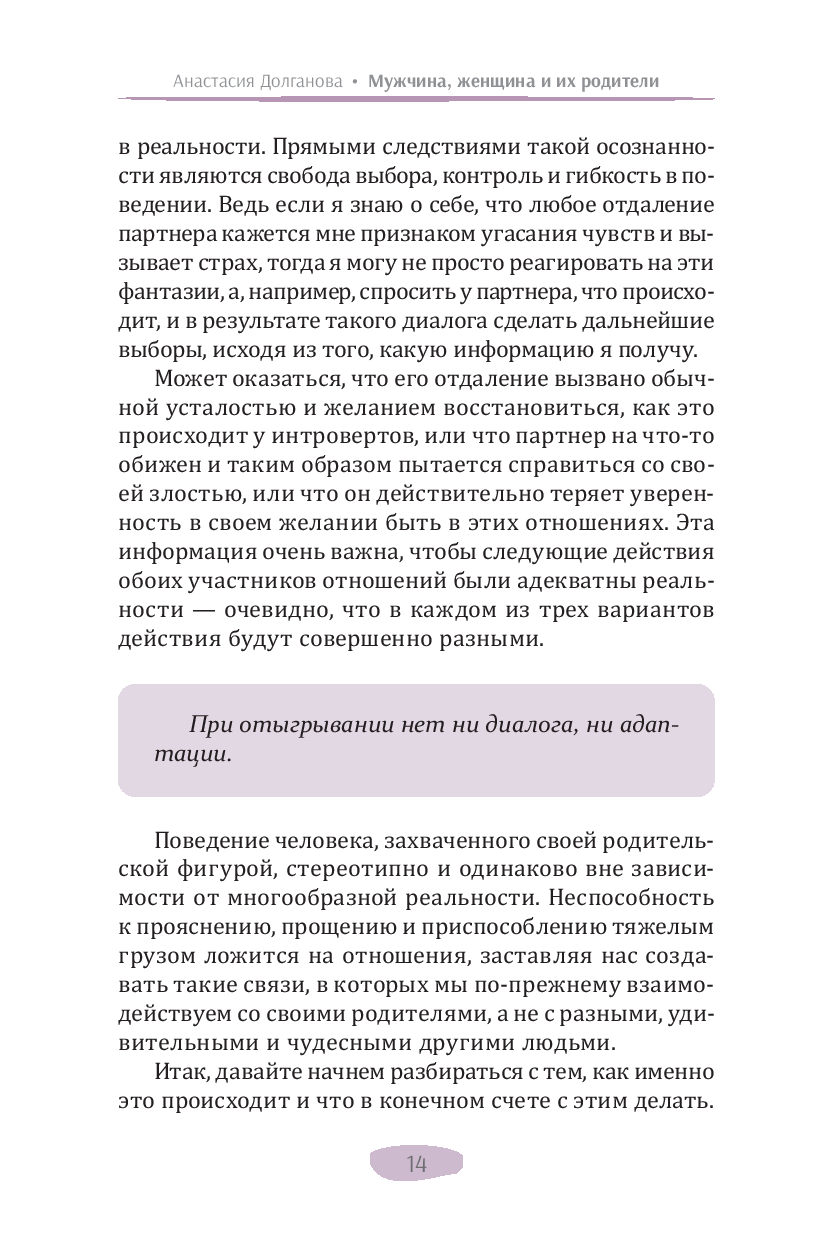 В своей новой книге автор бестселлеров по психологии (дипломированный психолог) Анастасия Долганова описывает влияние раннего детского опыта на уже взрослые взаимодействия. Она подробно объясняет, как выученные в детстве бессознательные реакции мешают нам быть гибкими и адаптивными, нагружают взрослые отношения прошлыми эмоциональными травмами, не дают двигаться вперед. Изучение, осознание и принятие этого опыта помогает выйти из замкнутого круга повторений, дает возможность личностного развития и обретения счастья в отношениях.