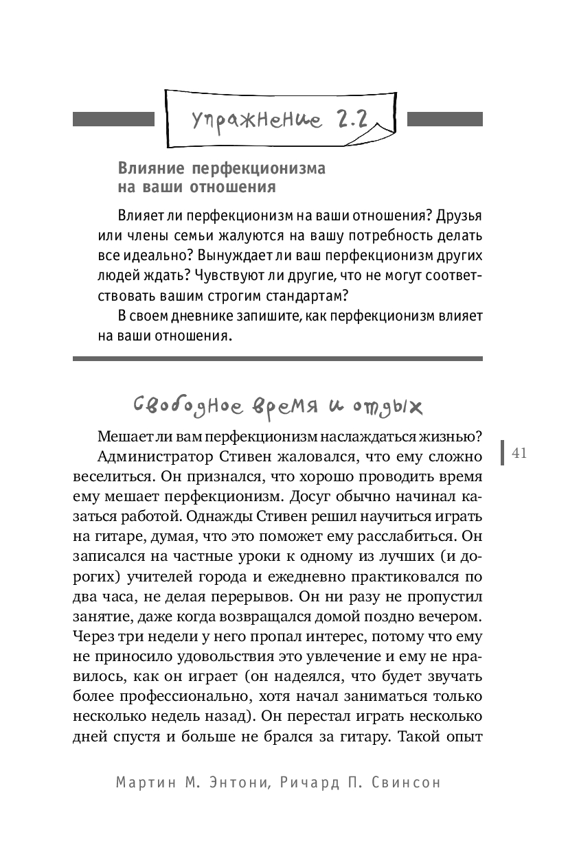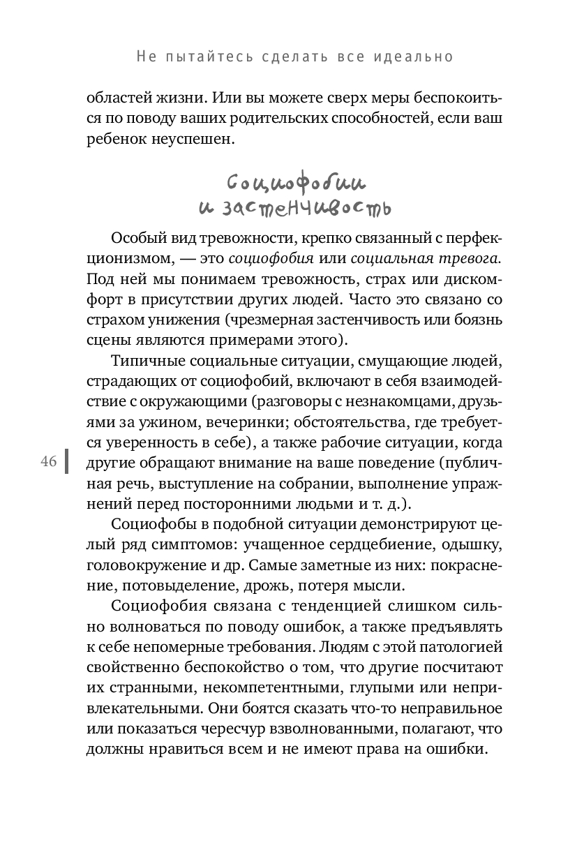 В этой книге вы найдете более 50 практик, которые избавят вас от чрезмерного перфекционизма: помогут лучше распоряжаться своим временем, фокусироваться на важном, научиться "жить с ошибками". Авторы разрабатывали их в течение многих лет и опробовали на себе. Выберите технику, которая подойдет вам лучше всего, и практикуйте не менее двух недель. Предупреждение: даже в этом случае не пытайтесь сделать все идеально. И помните главную фразу анти-перфекциониста: "На сегодня достаточно".