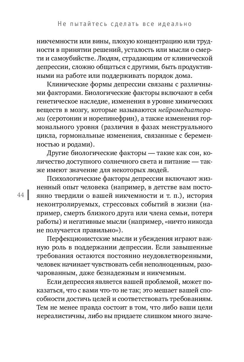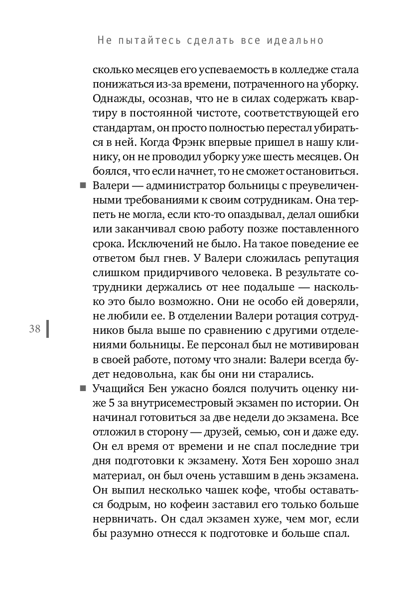 Многие считают перфекционизм главной трудовой добродетелью. "Я перфекционист" – эти слова люди обычно произносят с гордостью. Казалось бы, привычка постоянно находить в себе и своей работе недочёты необходима для личностного и профессионального развития. Но авторы этой книги считают иначе. Они изучали проблему перфекционизма более 20 лет (да и сами в прошлом стремились к "нездоровому совершенству") и убедились: перфекционизм токсичен. Иными словами, перфекционист постоянно себя унижает и заставляет испытывать стресс. Это, в свою очередь, приводит к эмоциональному выгоранию и серьезным заболеваниям. Но обуздать это стремление к сверх-совершенству – очень трудно.