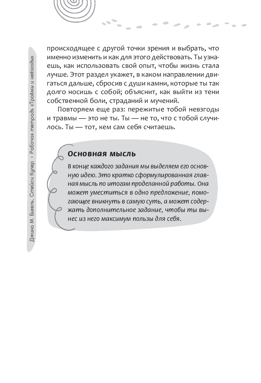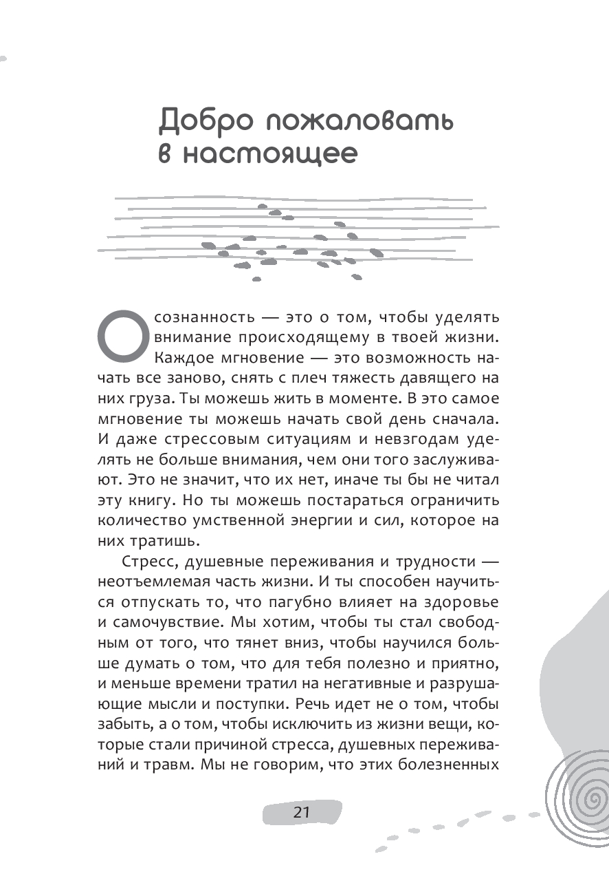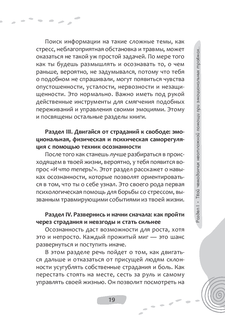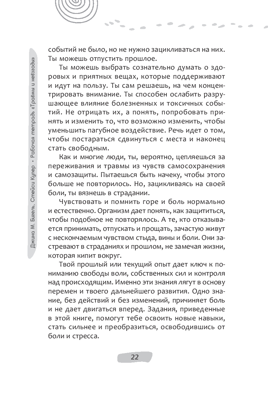 "Твой прошлый или текущий опыт дает ключ к пониманию свободы воли, собственных сил и контроля над происходящим. Именно эти знания лягут в основу перемен и твоего дальнейшего развития. Одно знание, без действий и без изменений, причиняет боль и не дает двигаться вперед. Задания, приведенные в этой книге, помогут тебе освоить новые навыки, стать сильнее и преобразиться, освободившись от боли и стресса".