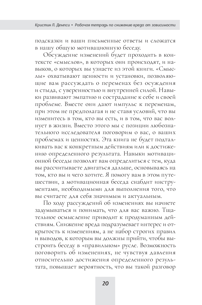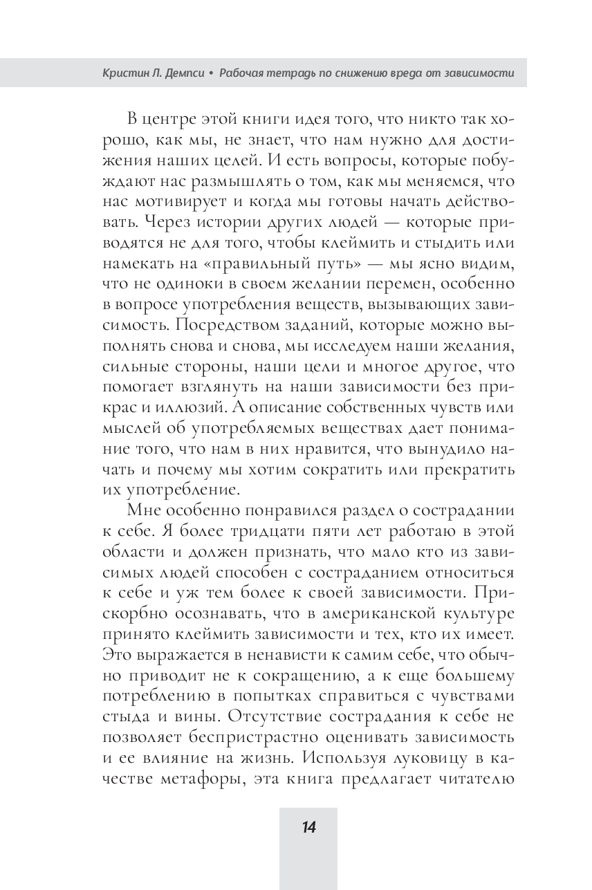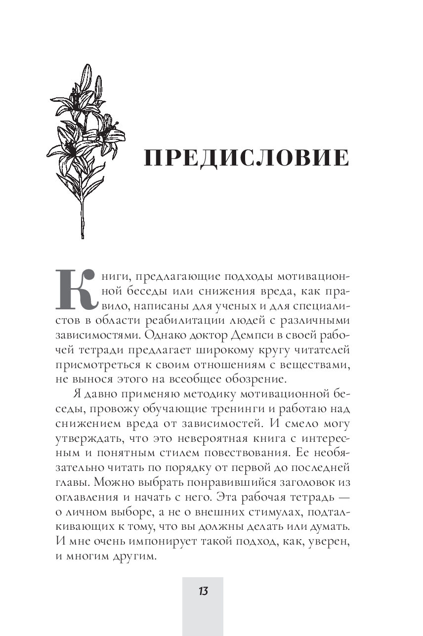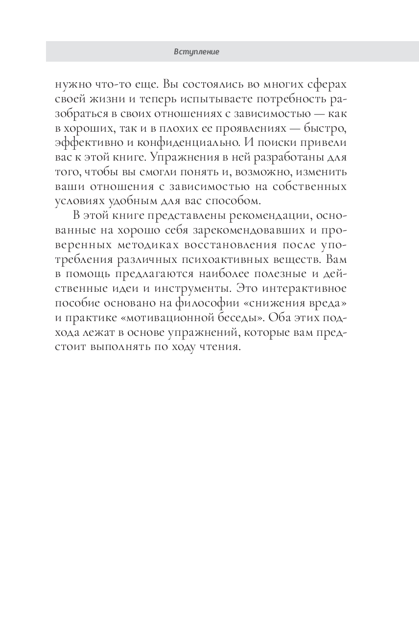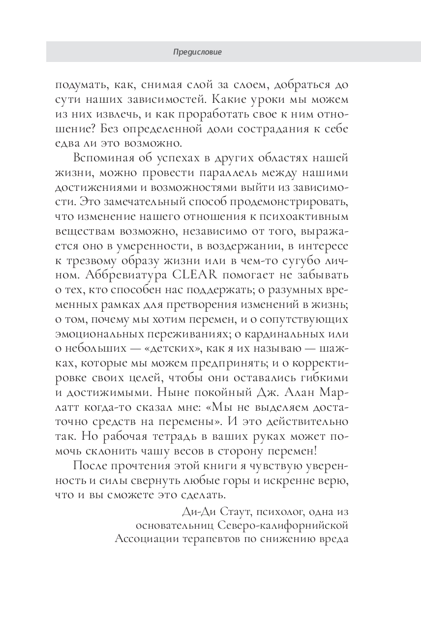 Эта рабочая тетрадь позволит вам изменить привычные паттерны реагирования на стресс, когда вместо деструктивного поведения вы будете выбирать более здоровые способы реагирования. Изюминкой издания является то, что в ней нет однозначных или резких суждений, которые могут мотивировать к переменам (т.е. избавлению от зависимости) лишь из чувства вины. Напротив, прочитав и проработав это издание, вы осознаете свои ценности и поймете, какой подход необходимо применить исходя из вашего опыта и жизненной истории.
