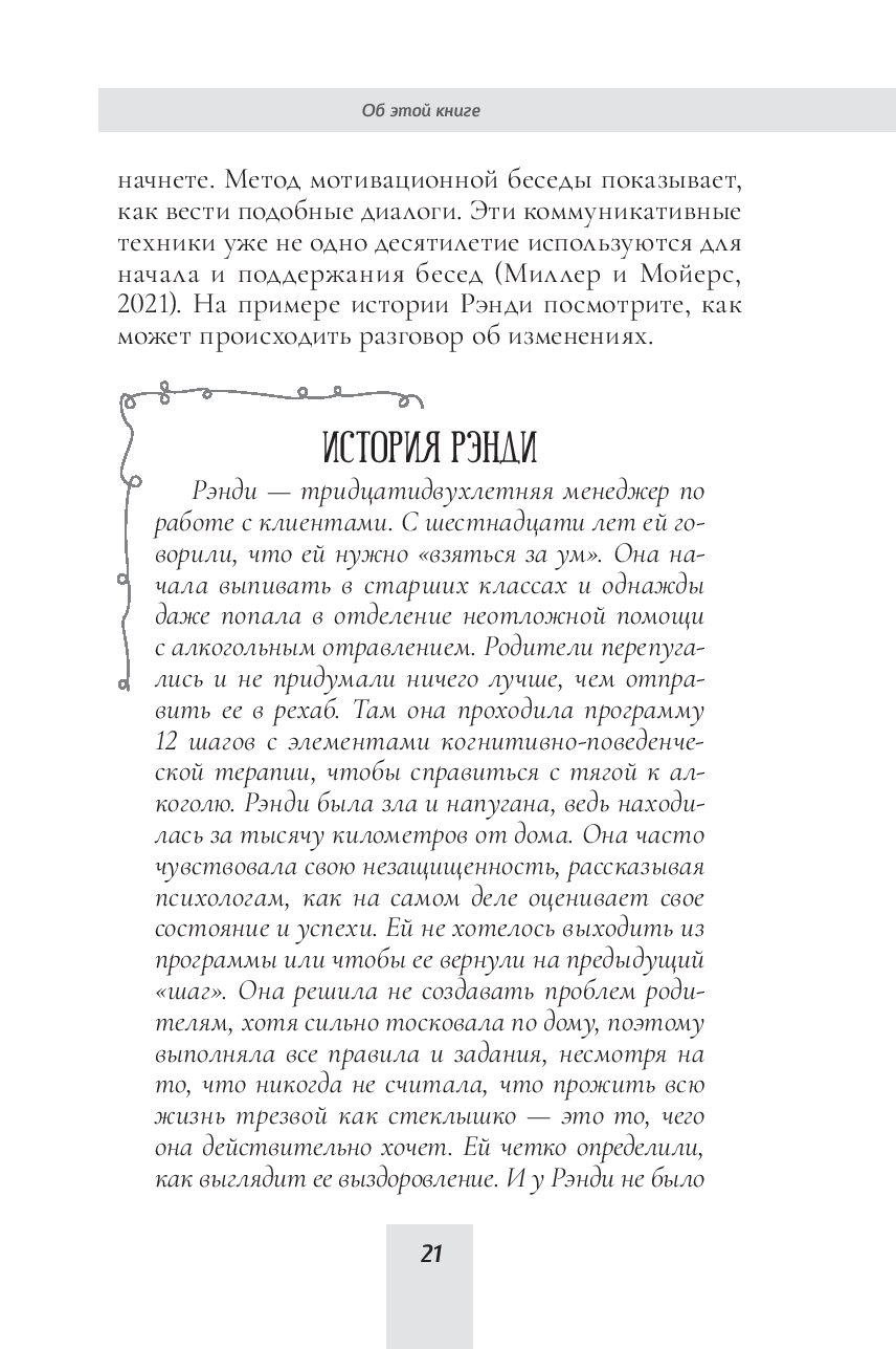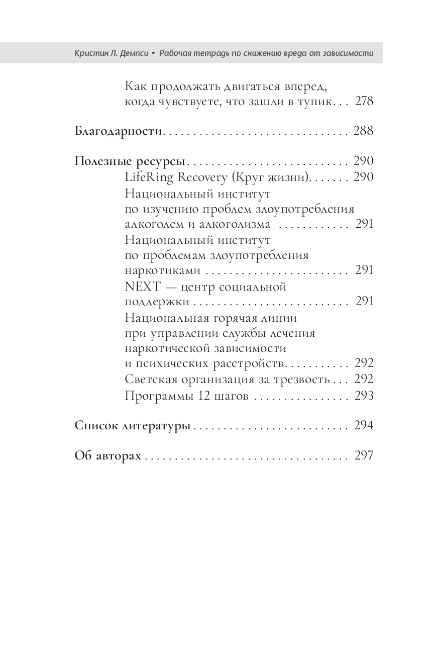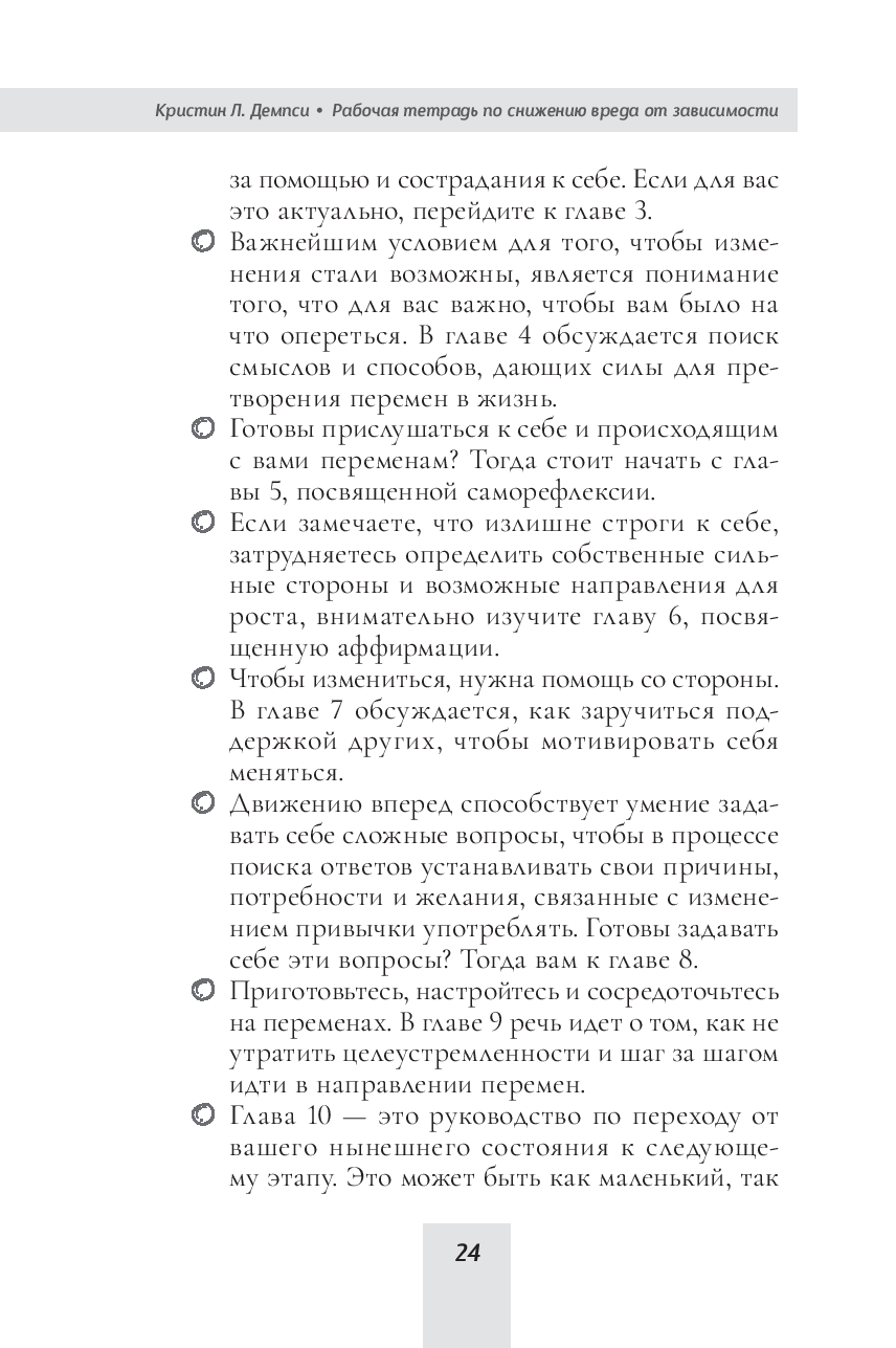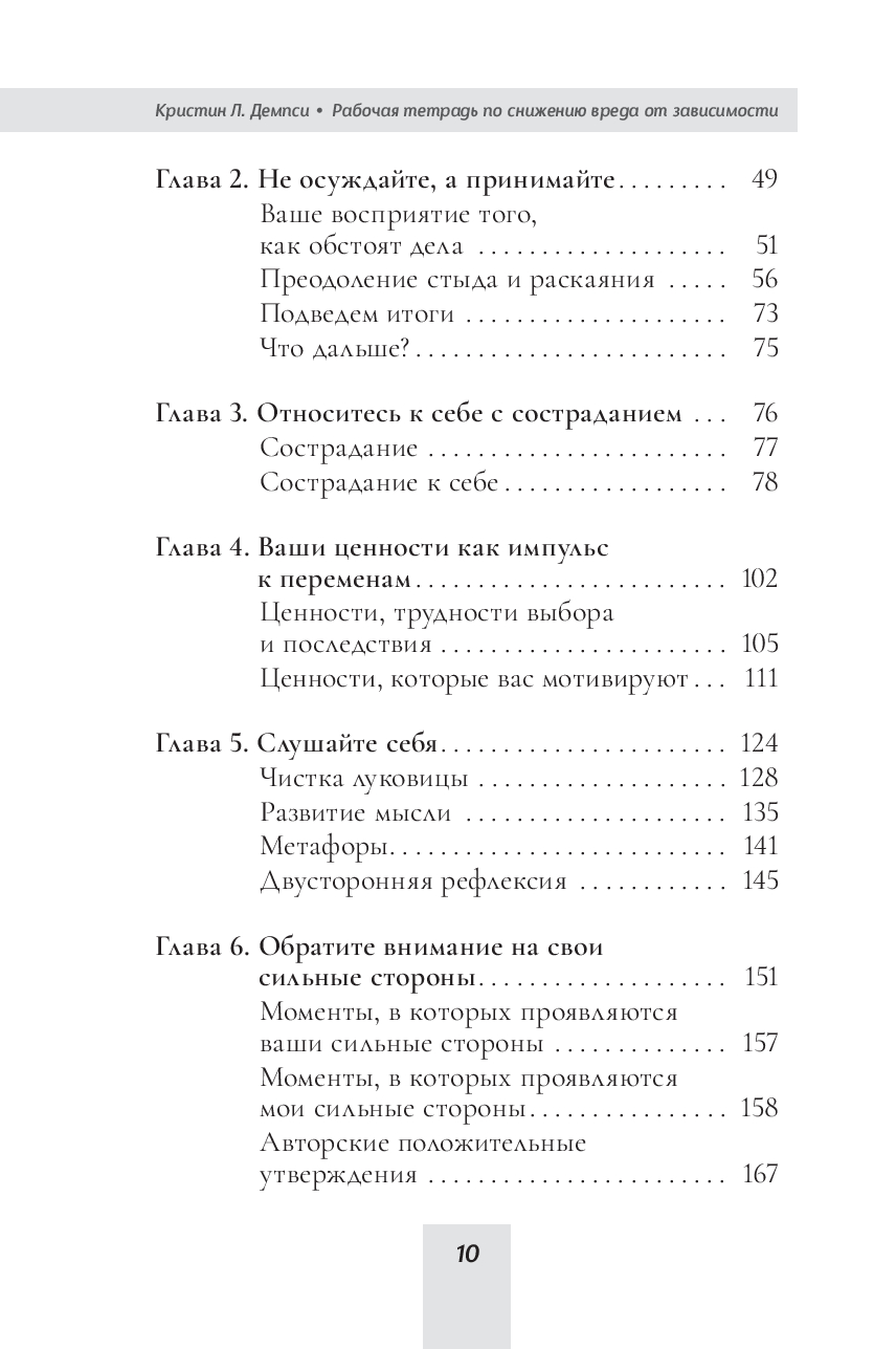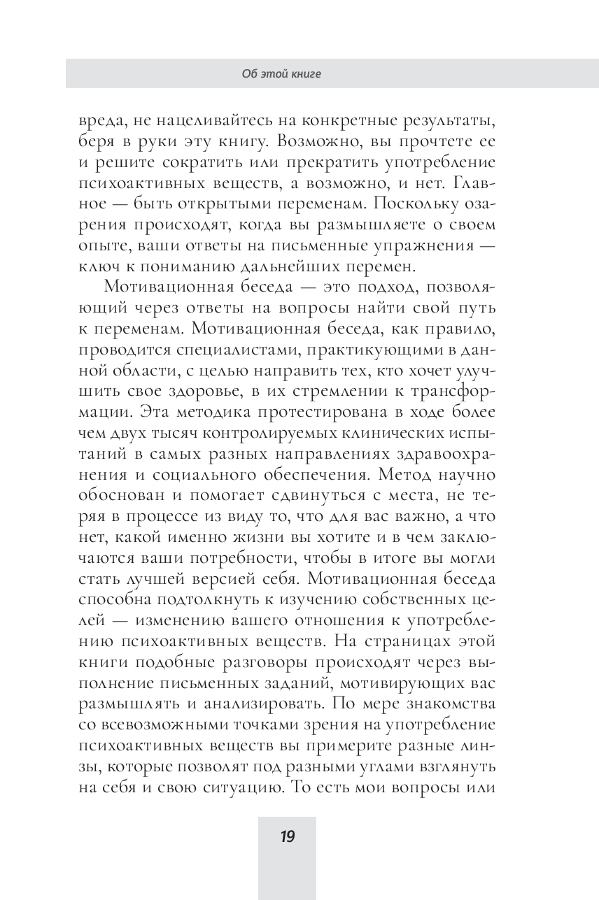 Эта рабочая тетрадь позволит вам изменить привычные паттерны реагирования на стресс, когда вместо деструктивного поведения вы будете выбирать более здоровые способы реагирования. Изюминкой издания является то, что в ней нет однозначных или резких суждений, которые могут мотивировать к переменам (т.е. избавлению от зависимости) лишь из чувства вины. Напротив, прочитав и проработав это издание, вы осознаете свои ценности и поймете, какой подход необходимо применить исходя из вашего опыта и жизненной истории.