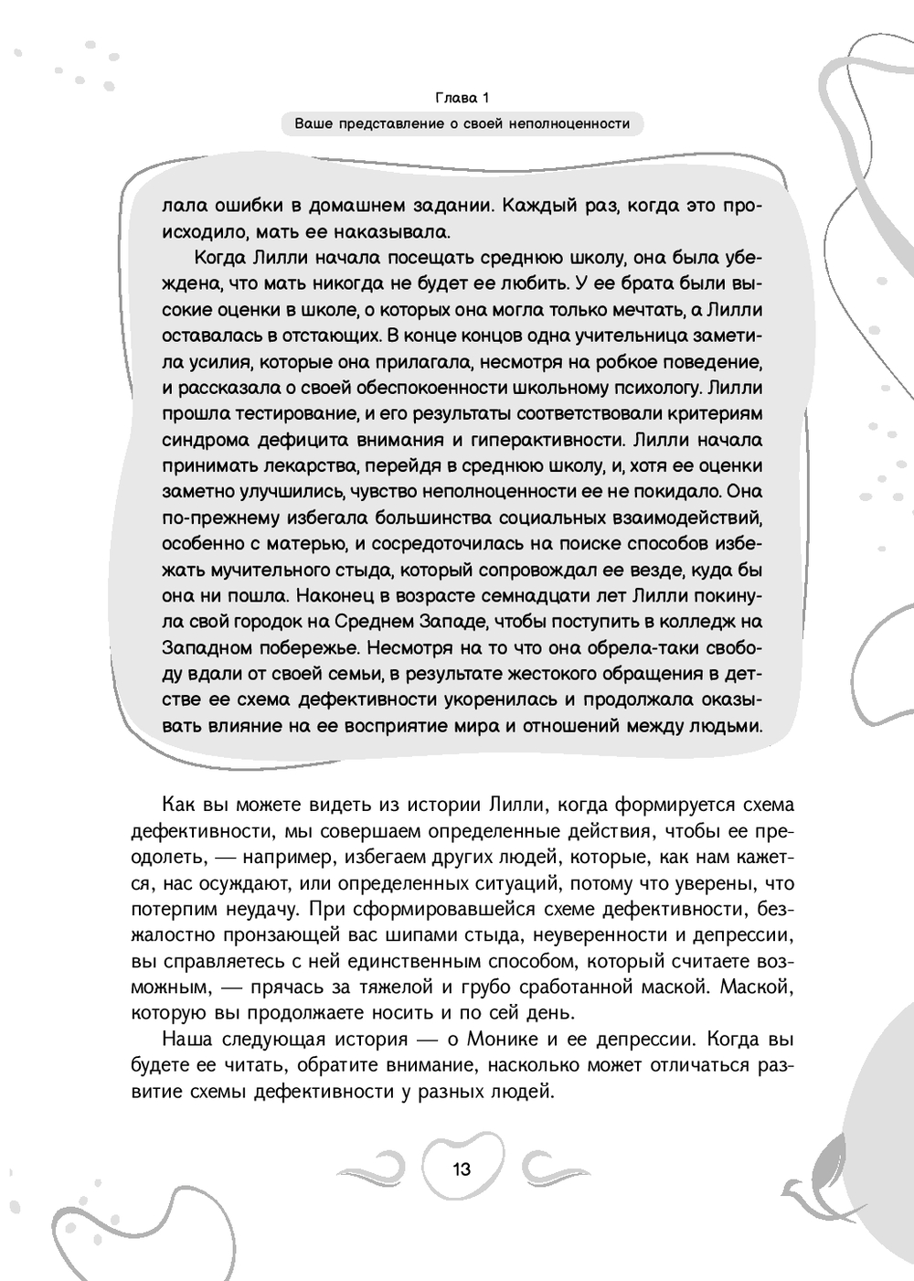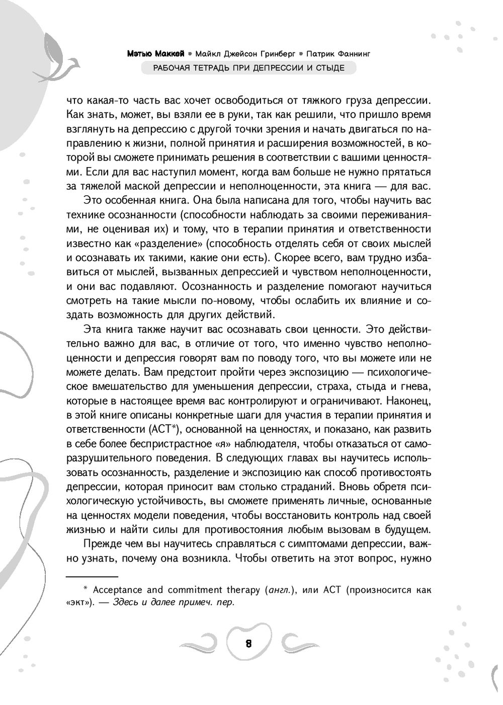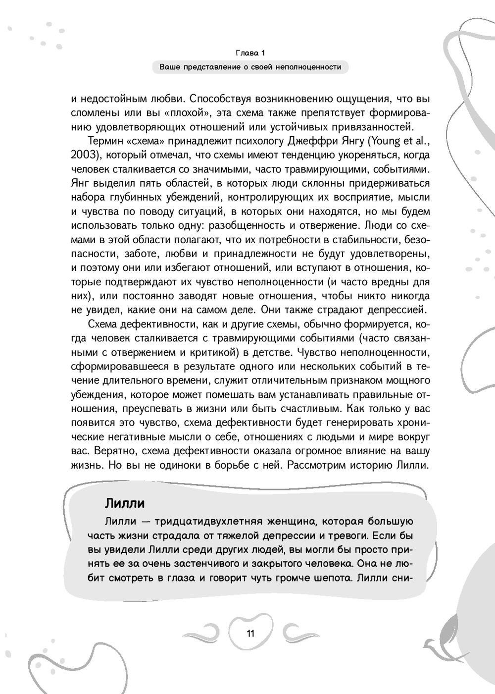 Эта рабочая тетрадь основана на методах терапии принятия и ответственности (ACT – Acceptance Commitment Therapy). Вы найдете в ней инструменты для выявления и преодоления чувства неполноценности, позволяющие построить жизнь, наполненную энергией и смыслом. Откроете для себя способы установления связи со своими ценностями, обнаружите лучшие поведенческие стратегии и научитесь принимать себя во всей своей удивительной сложности – с добротой и состраданием.