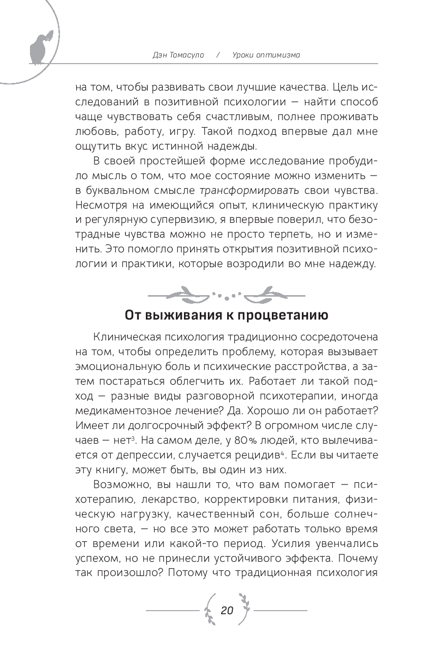 Вдохновляющая книга "Уроки оптимизма" предлагает эффективные техники доказательной позитивной психологии, которые помогут вам прервать депрессивный цикл, повысить жизнестойкость и мотивацию, отпустить чувство отчаяния и безнадежности. Дэн Томасуло не призывает игнорировать реальные страдания и обесценивать их. Он учит, как восстанавливать баланс, повышая осознанность и меняя собственные представления о будущем.