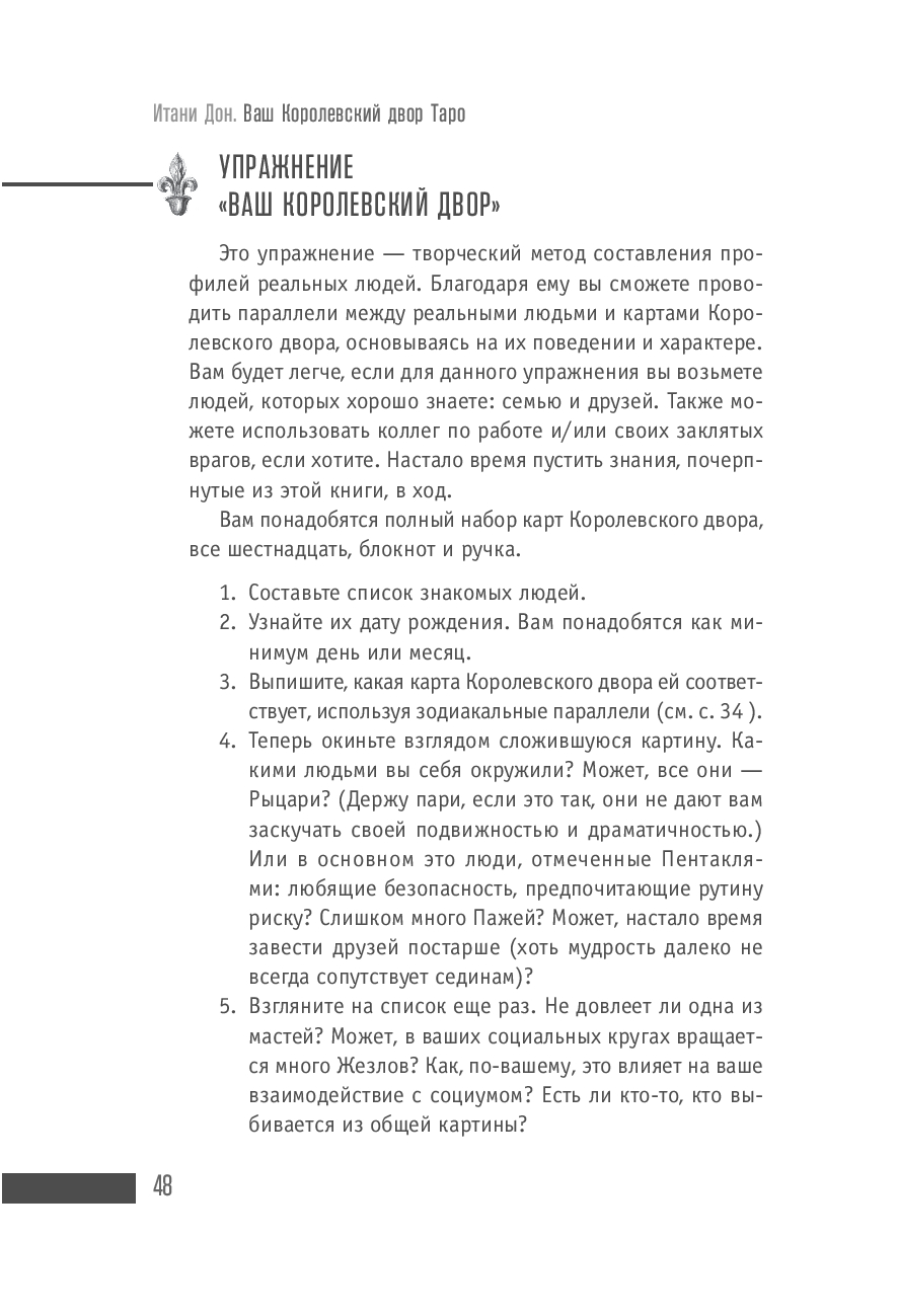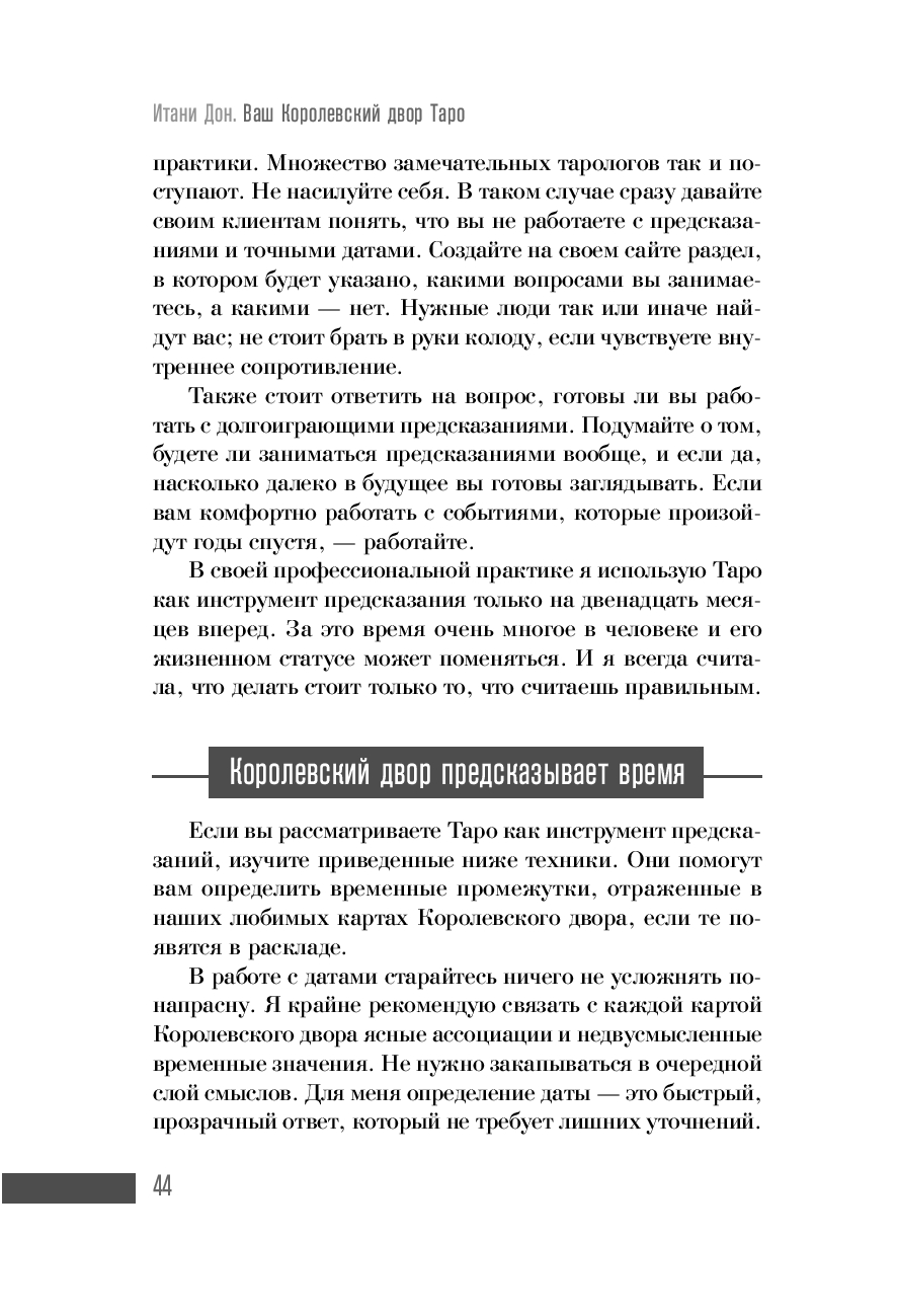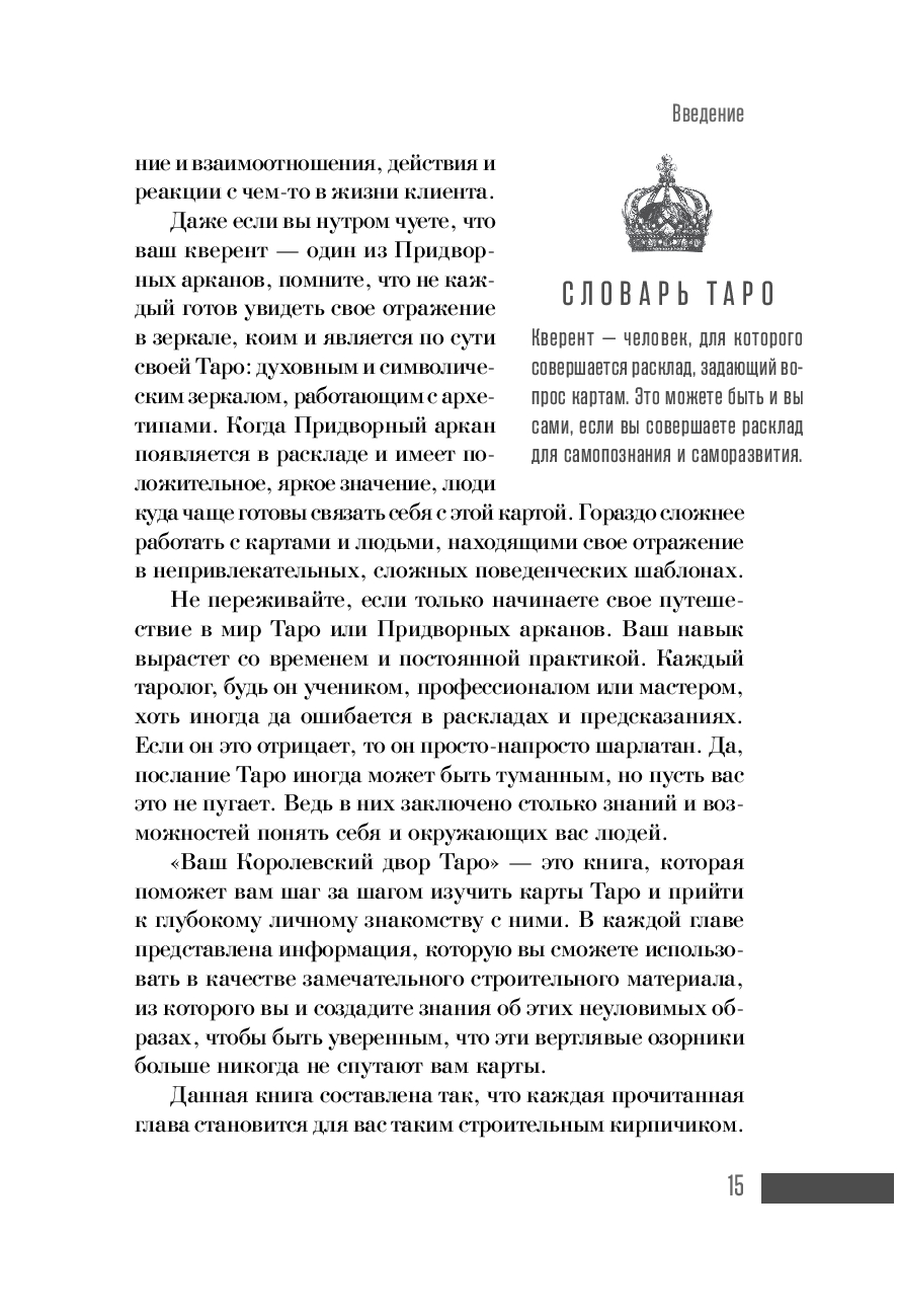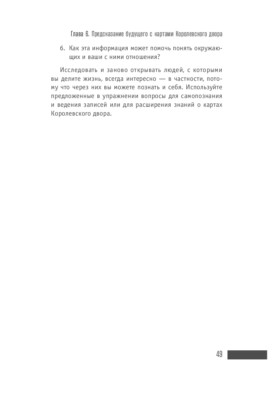У каждой карты Королевского двора есть особый дар. Кто вам ближе – романтичный и страстный Рыцарь Кубков, или практичный и дисциплинированный Король Пентаклей? Справедливая и рассудительная Королева Мечей, или озорной и творческий Паж Жезлов? Каковы бы ни были ваши намерения, книга поможет вам установить глубокие отношения с энергией карт: даже самый сложный расклад больше не будет вызывать у вас затруднений.