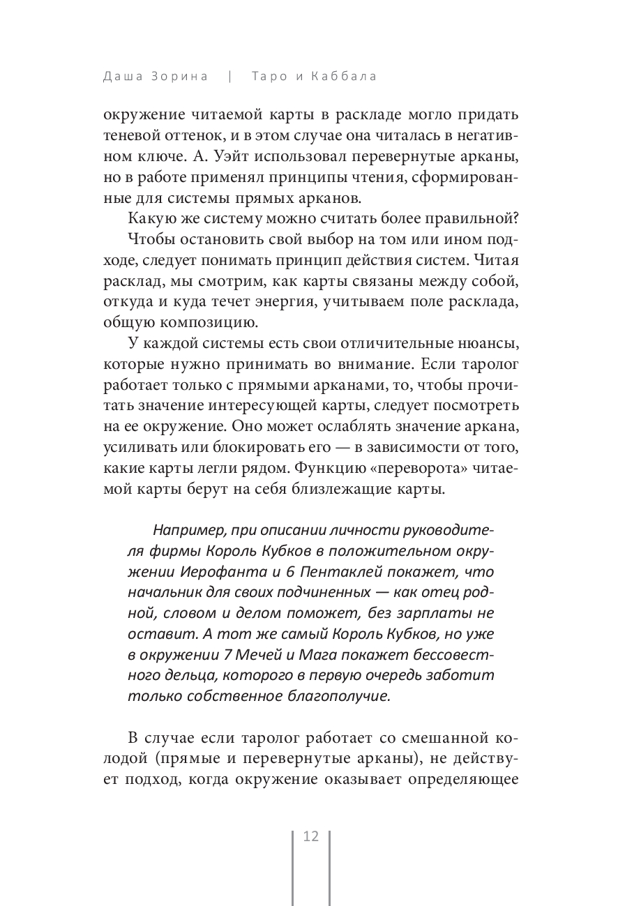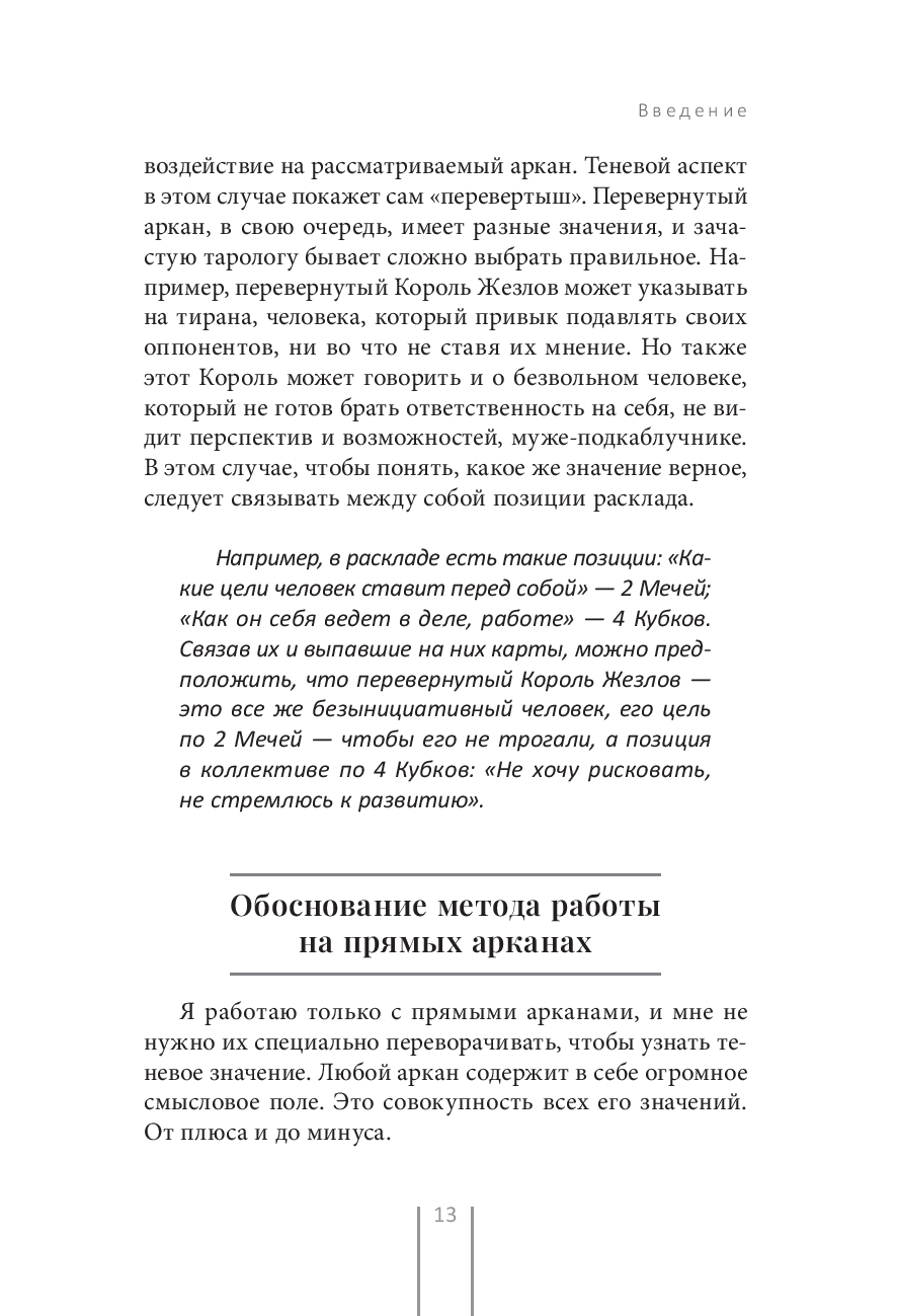 Помимо этого, автор предоставляет не только теорию, но и практику, рассказывая на страницах своей книги о своей работе с клиентами, а также о том, каким образом проигрались в их жизни сделанные расклады. Такая информация – ценный материал как для новичков, так и для профессионалов Таро, которые стремятся оттачивать свои навыки.