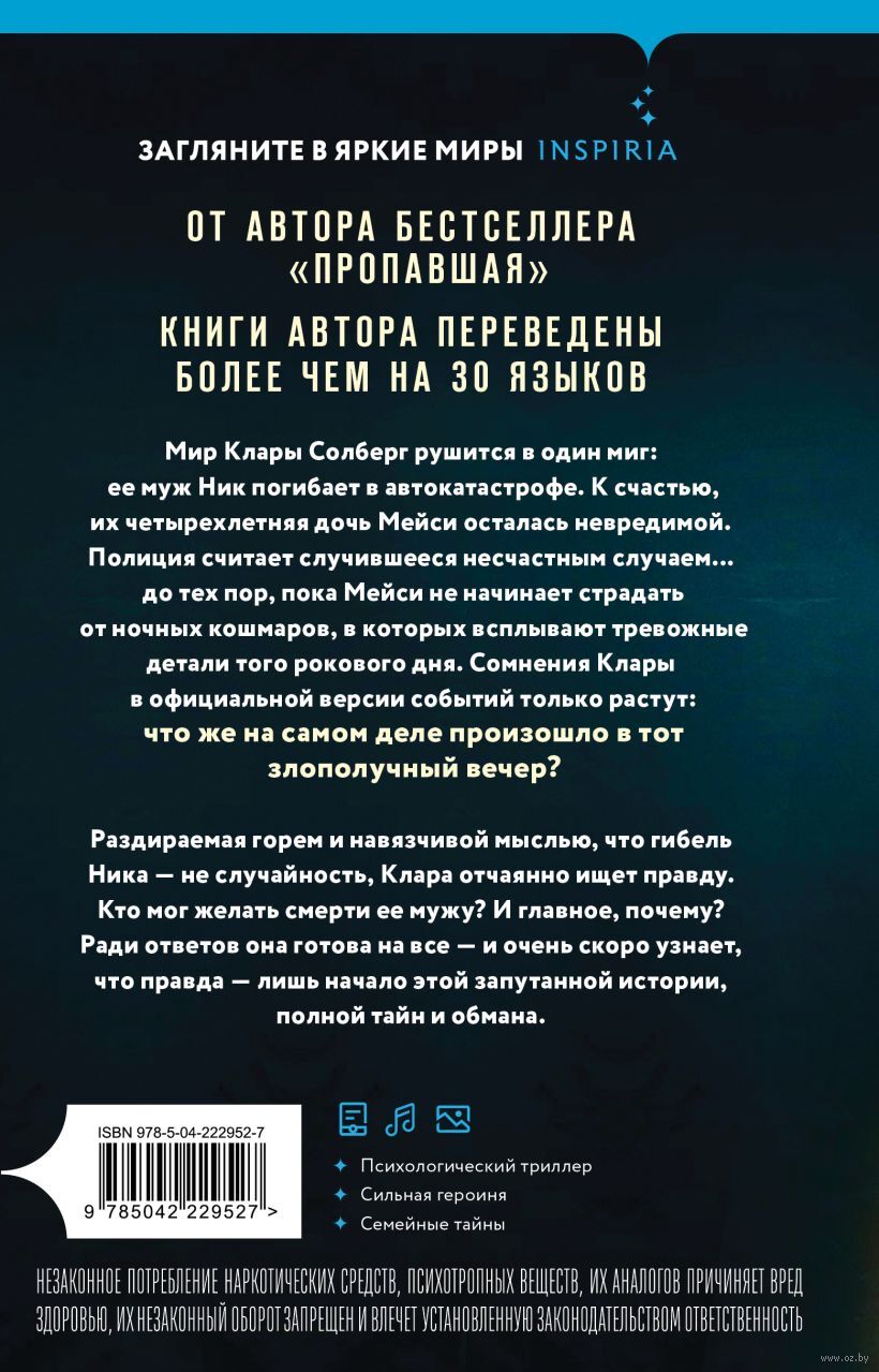 Мир Клары Солберг рушится в один миг: ее муж Ник погибает в автокатастрофе. К счастью, их четырехлетняя дочь Мейси осталась невредимой. Полиция считает случившееся несчастным случаем… до тех пор, пока Мейси не начинает страдать от ночных кошмаров, в которых всплывают тревожные детали того рокового дня. Сомнения Клары в официальной версии событий только растут: что же на самом деле произошло в тот злополучный вечер?