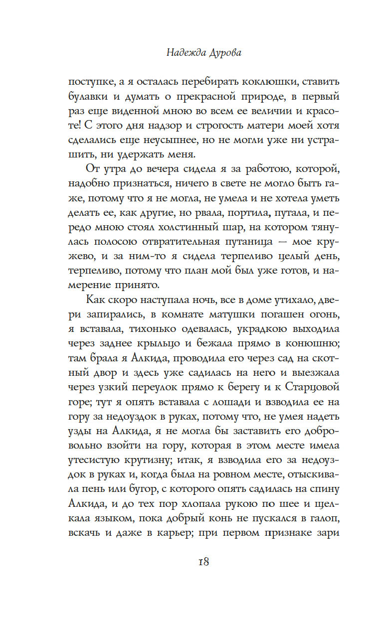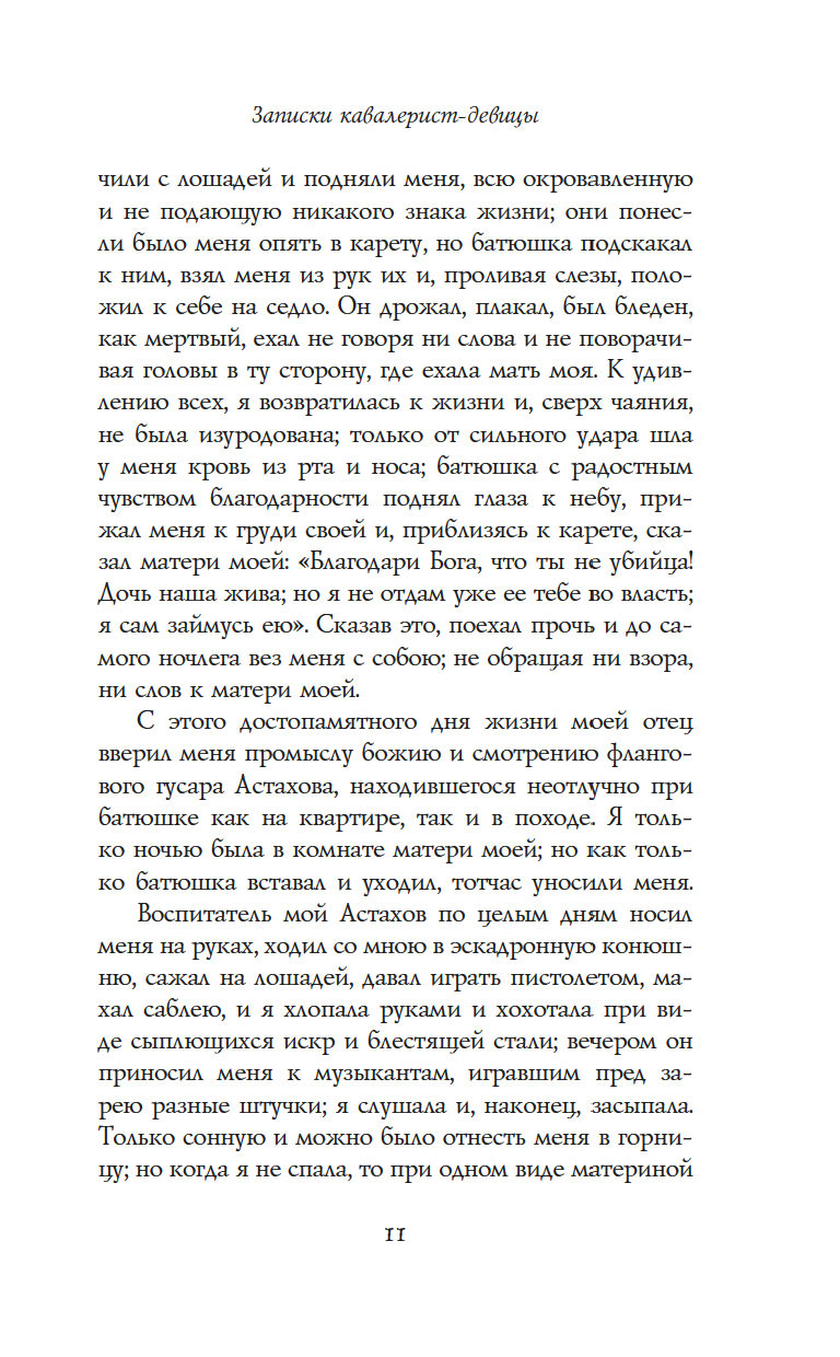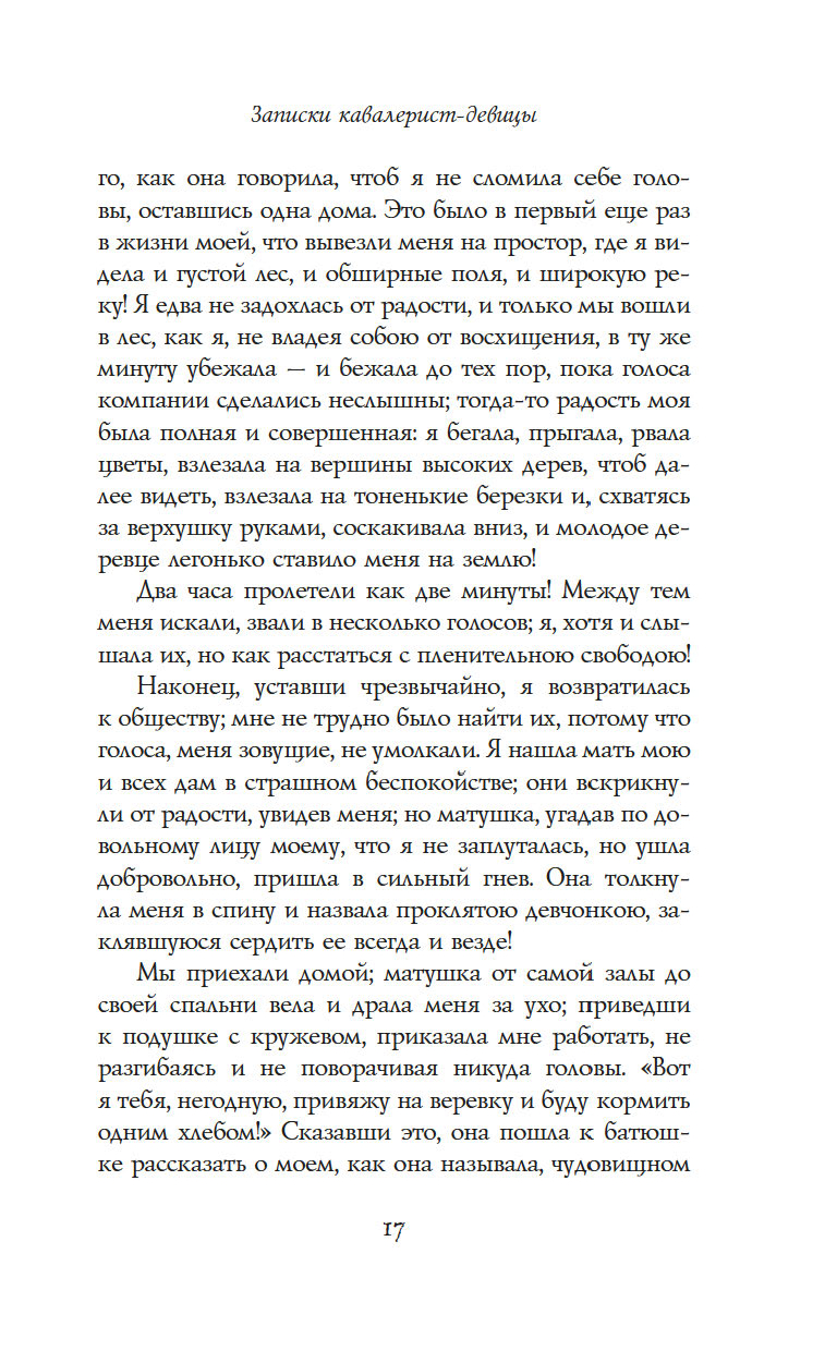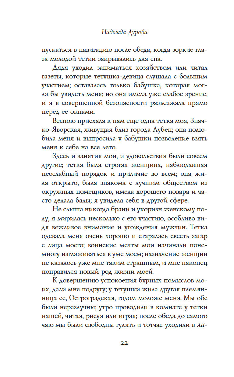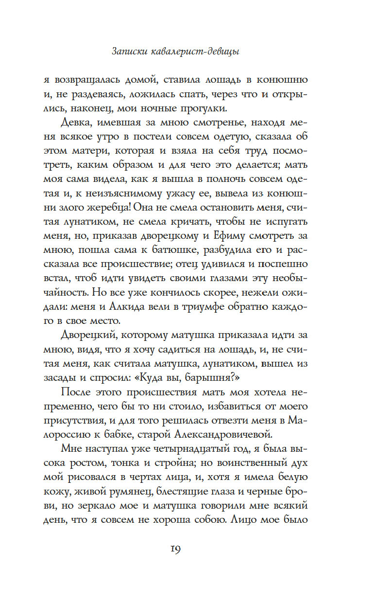 "Записки кавалерист-девицы" – это не только мемуары обладательницы крайне нетипичной судьбы для женщины начала XIX века – судьбы солдата и кавалерийского офицера, но и честная книга о том, как выбрав собственный путь по зову сердца, а не по наставлению родителей и давлению общества, можно стать счастливой и воплотить свои мечты в жизнь.
