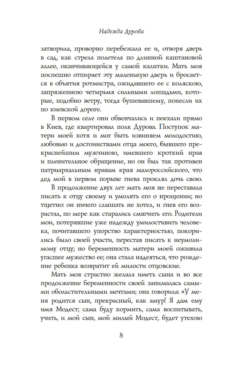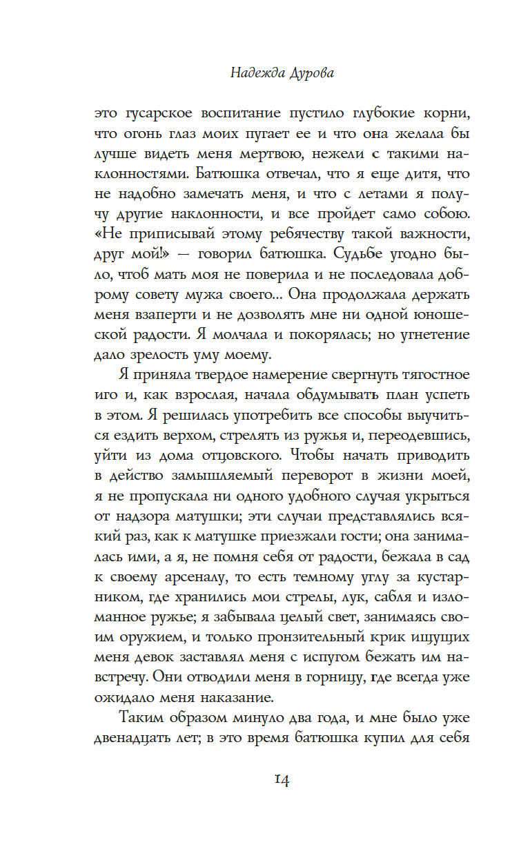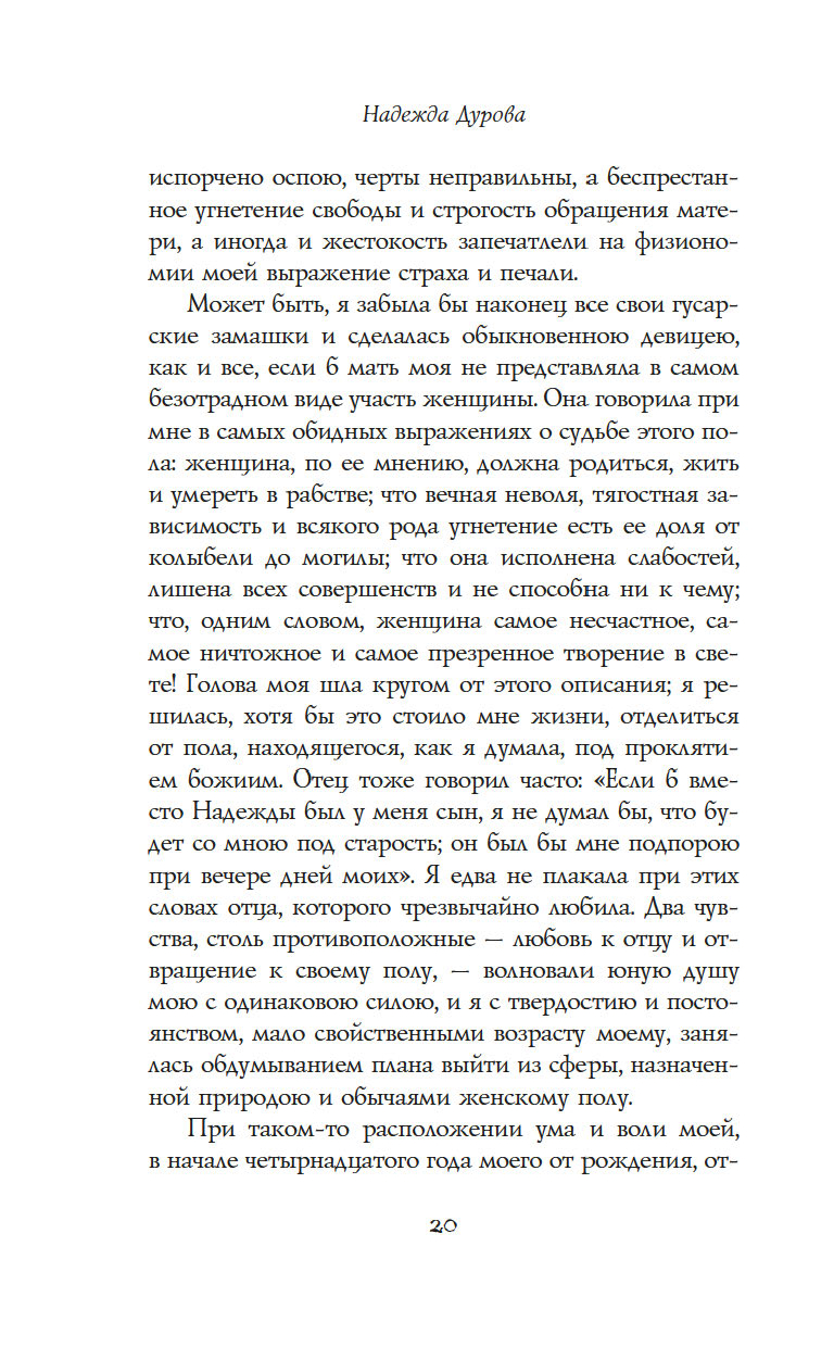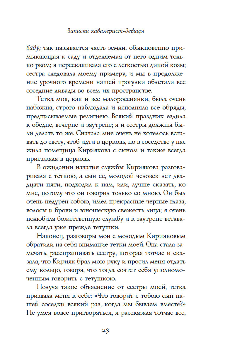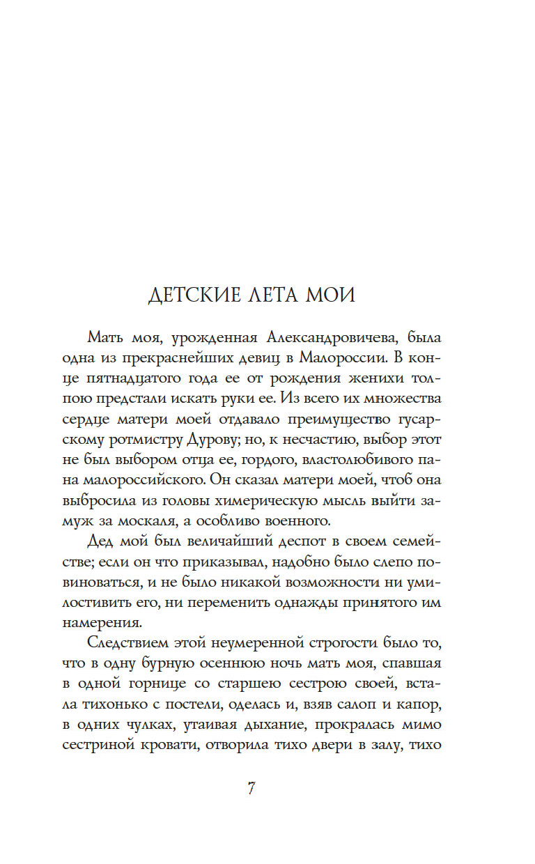 "Записки кавалерист-девицы" – это не только мемуары обладательницы крайне нетипичной судьбы для женщины начала XIX века – судьбы солдата и кавалерийского офицера, но и честная книга о том, как выбрав собственный путь по зову сердца, а не по наставлению родителей и давлению общества, можно стать счастливой и воплотить свои мечты в жизнь.