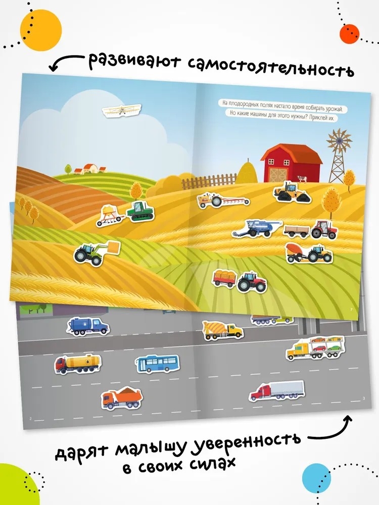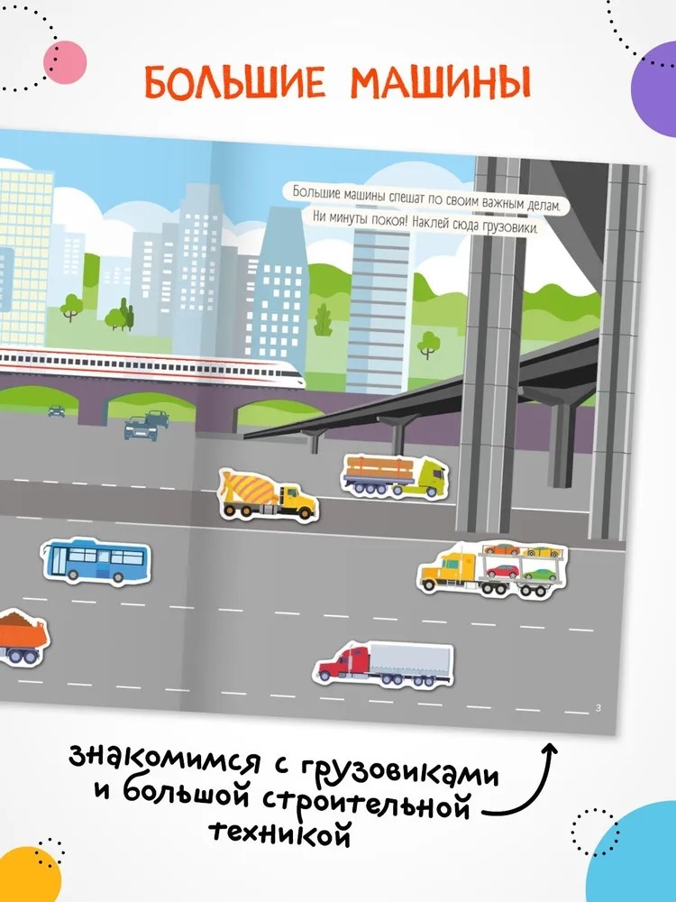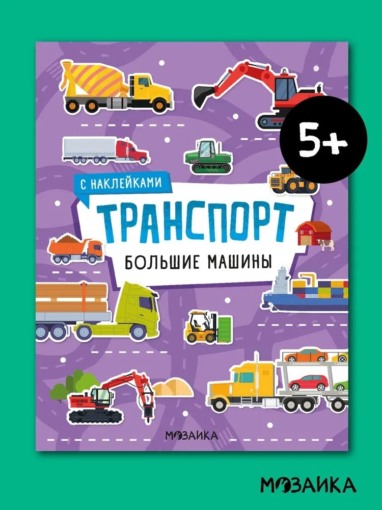 Книга "Большие машины" из серии "Транспорт с наклейками" знакомит детей с разными грузовиками и большой строительной техникой. Эта простая, но полезная книга позволит ребенку заниматься по ней самостоятельно. Не нужно объяснять и помогать – на листе с наклейками указано, куда клеить каждую машинку. Ребенок сам будет с увлечением искать нужную страницу и приклеивать картинку.