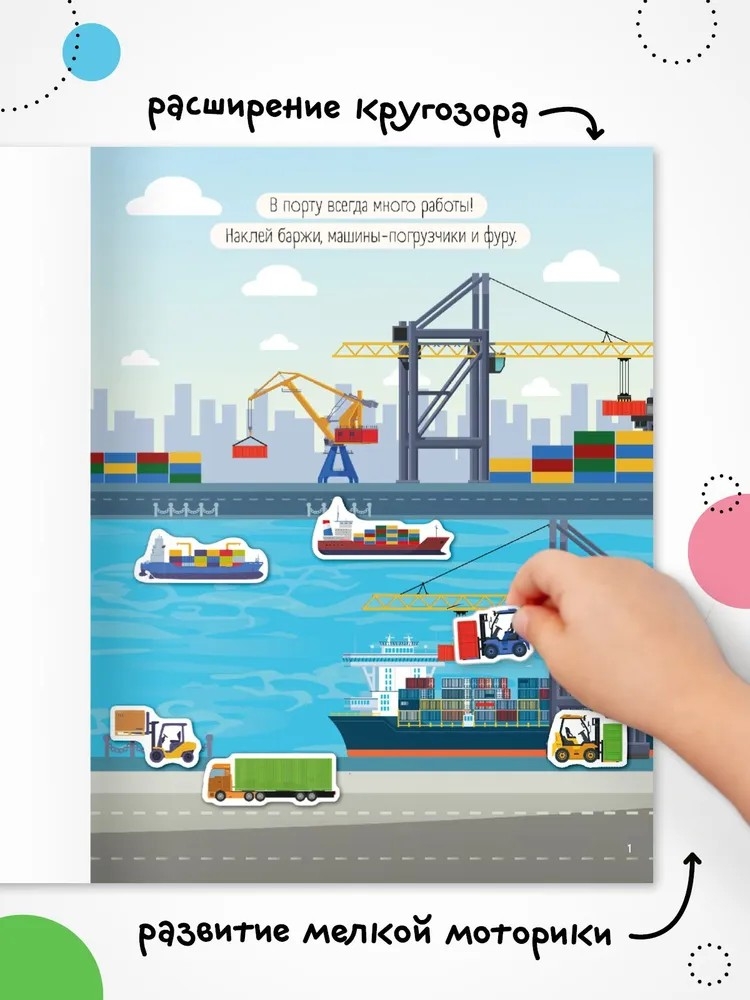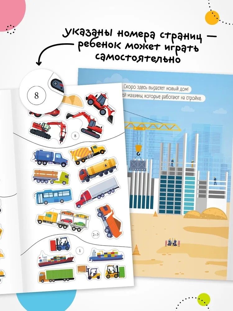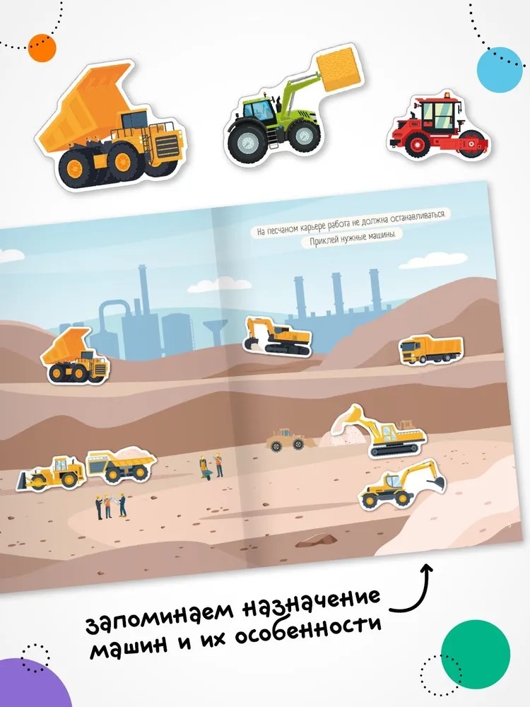 Этот процесс – не просто игра. Наклеивая гигантский самосвал, бетоновоз или карьерный экскаватор, ребенок в игровой форме будет усваивать полезную информацию об их назначении и особенностях. Книга поможет в развитии самостоятельности: малыш будет гордиться, что справился без помощи взрослых. Кроме того, благодаря наклейкам развивается мелкая моторика, внимание и расширяется кругозор.