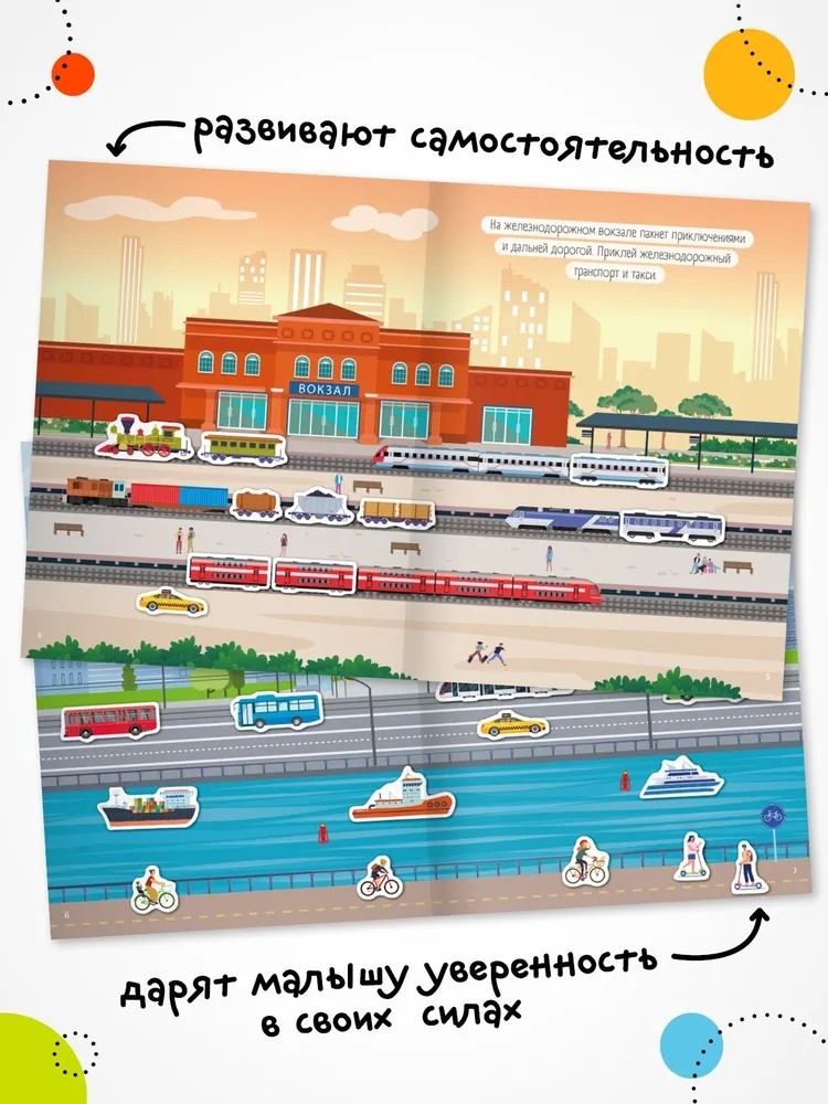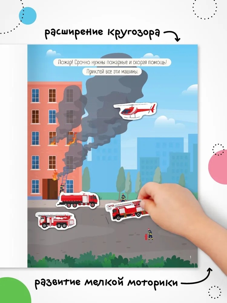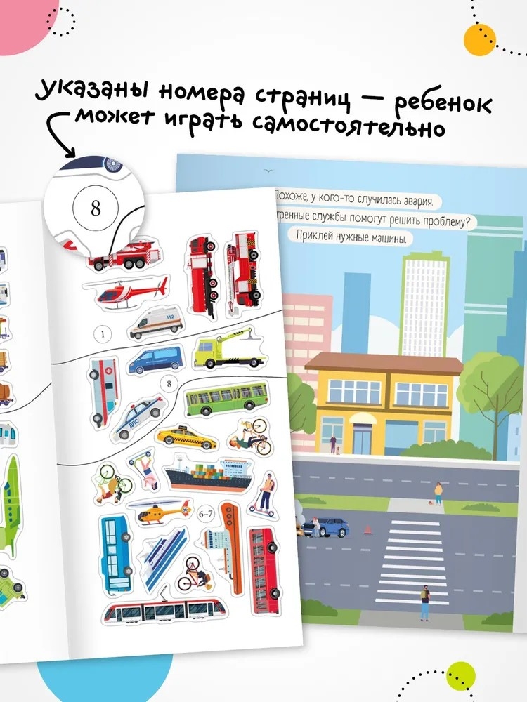 Этот процесс – не просто игра. Наклеивая такси, машину скорой помощи или подъемный кран, ребенок в игровой форме будет усваивать полезную информацию об их назначении и особенностях. Книга поможет в развитии самостоятельности: малыш будет гордиться, что справился без помощи взрослых. Кроме того, благодаря наклейкам развивается мелкая моторика, внимание и расширяется кругозор.