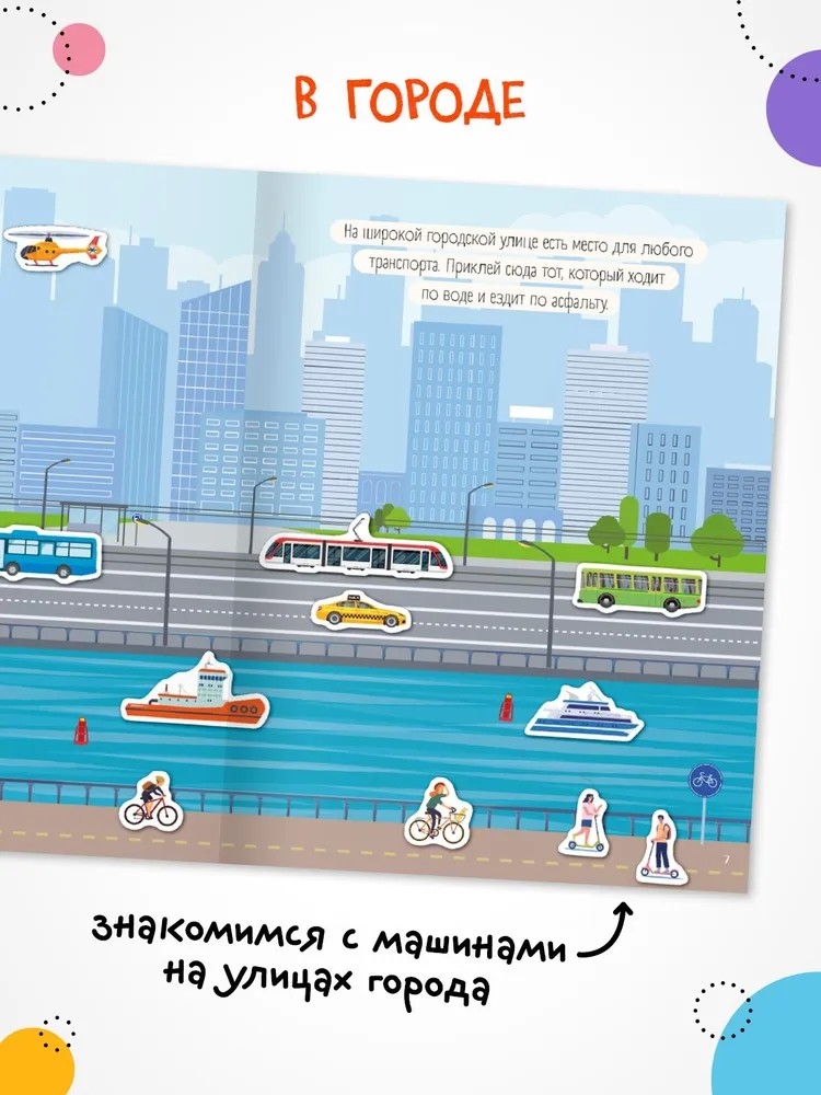 Книга "В городе" из серии "Транспорт с наклейками" знакомит детей с машинами, которые можно встретить в городе каждый день. Эта простая, но полезная книга позволит ребенку заниматься по ней самостоятельно. Не нужно объяснять и помогать – на листе с наклейками указано, куда клеить каждую машинку. Ребенок сам будет с увлечением искать нужную страницу и приклеивать картинку.