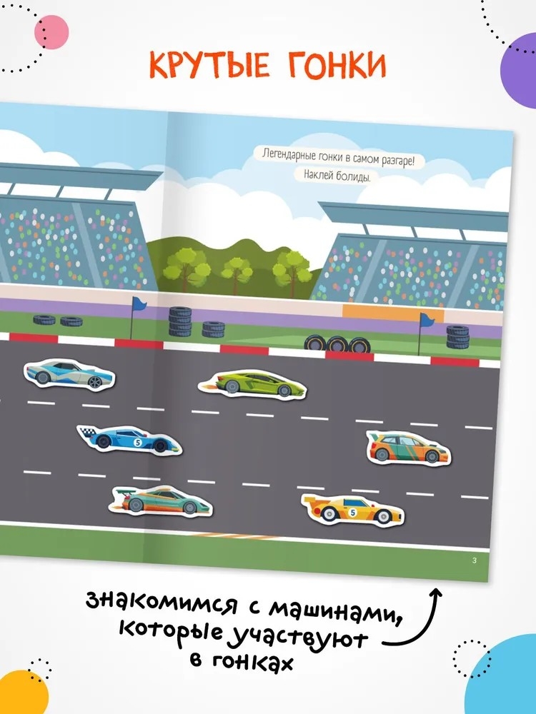 Книга "Крутые гонки" из серии "Транспорт с наклейками" знакомит детей с машинами, которые принимают участие в гонках. Эта простая, но полезная книга позволить ребенку заниматься по ней самостоятельно. Не нужно объяснять и помогать – на листе с наклейками указано, куда клеить каждую машинку. Ребенок сам будет с увлечением искать нужную страницу и приклеивать картинку.