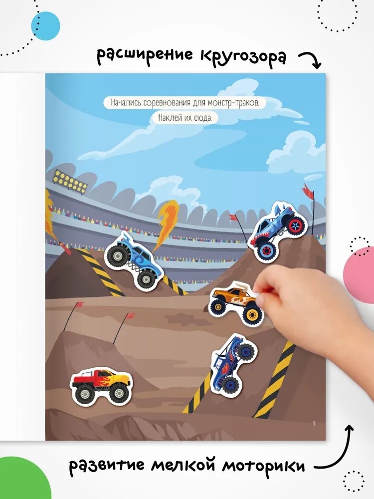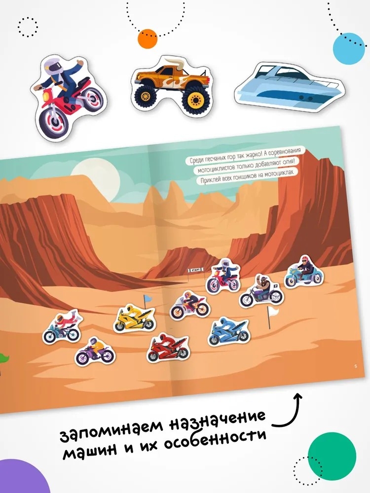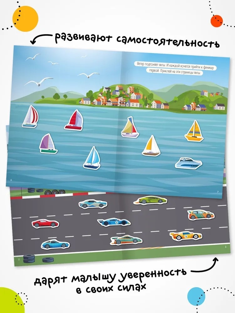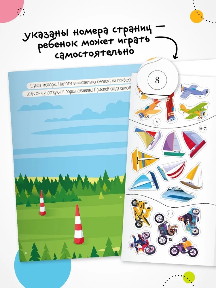 Этот процесс – не просто игра. Наклеивая болиды, мотоциклы или самолеты, ребенок в игровой форме будет усваивать полезную информацию об их назначении и особенностях. Книга поможет в развитии самостоятельности: малыш будет гордиться, что справился без помощи взрослых. Кроме того, благодаря наклейкам развивается мелкая моторика, внимание и расширяется кругозор.
