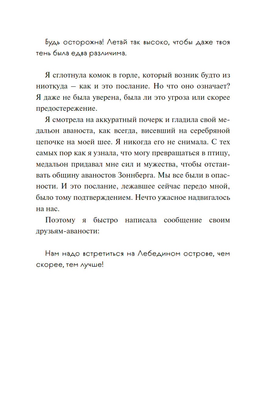 Они обычные люди – но только на первый взгляд. Они бережно хранят свой секрет, ведь если кто-то узнает правду, то их будущее окажется под угрозой. Полёт, свобода и магия – это и есть жизнь аваностов, людей с даром превращаться в птиц. Но однажды над ними нависает смертельная опасность, и спасти их может только одна застенчивая девочка…