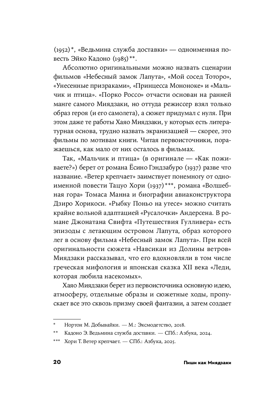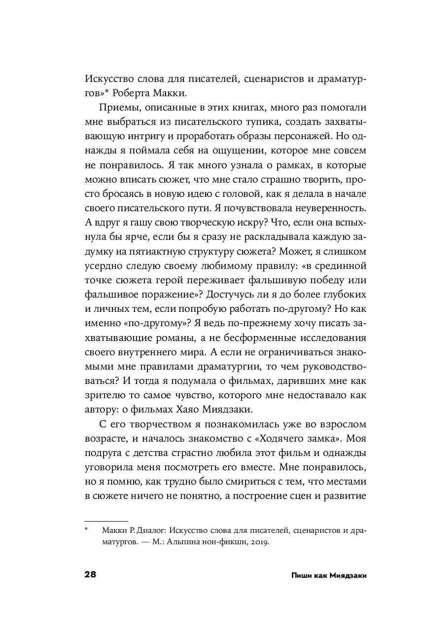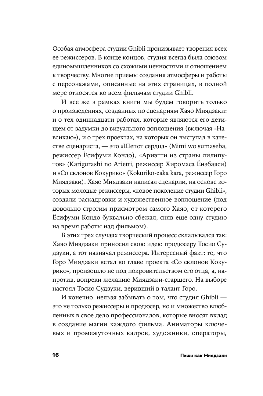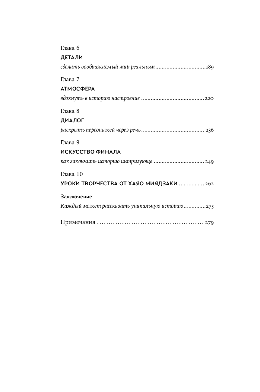Что может вдохновить авторов, которые отважились воплотить свои идеи в прозе или сценарии? Какие приемы выбрать? С чего начать? Екатерина Соболь предлагает решение – обратиться за советом к мастеру. Режиссер и сценарист Хаяо Миядзаки известен и горячо любим далеко за пределами Японии. Его фильмы неизменно приковывают к себе внимание зрителей и критиков. Обаяние работ Миядзаки отчасти кроется в драматургических приемах, которые он использует для создания сюжета и образов персонажей. Его уникальный опыт будет полезен новому поколению авторов, независимо от жанра, которому они отдают предпочтение, а творческие задания помогут воплотить идеи на практике.