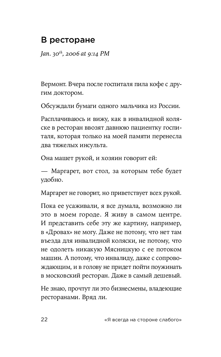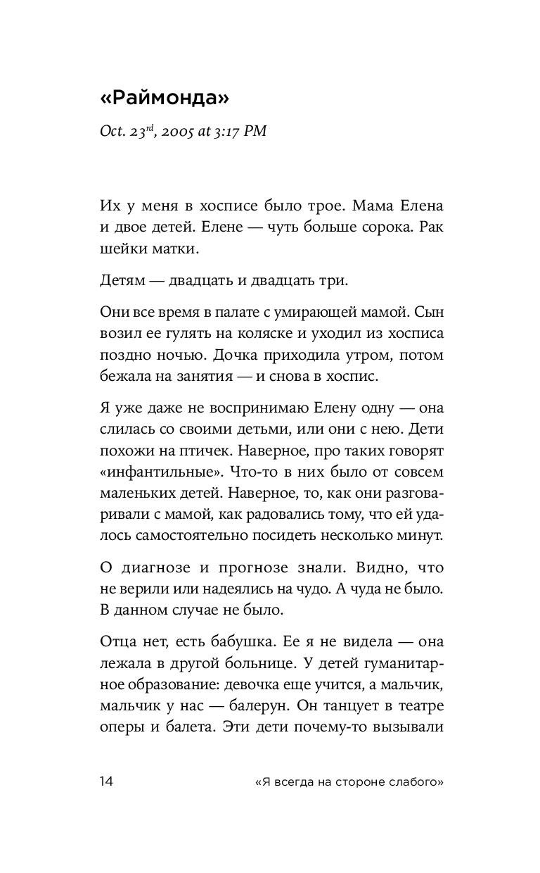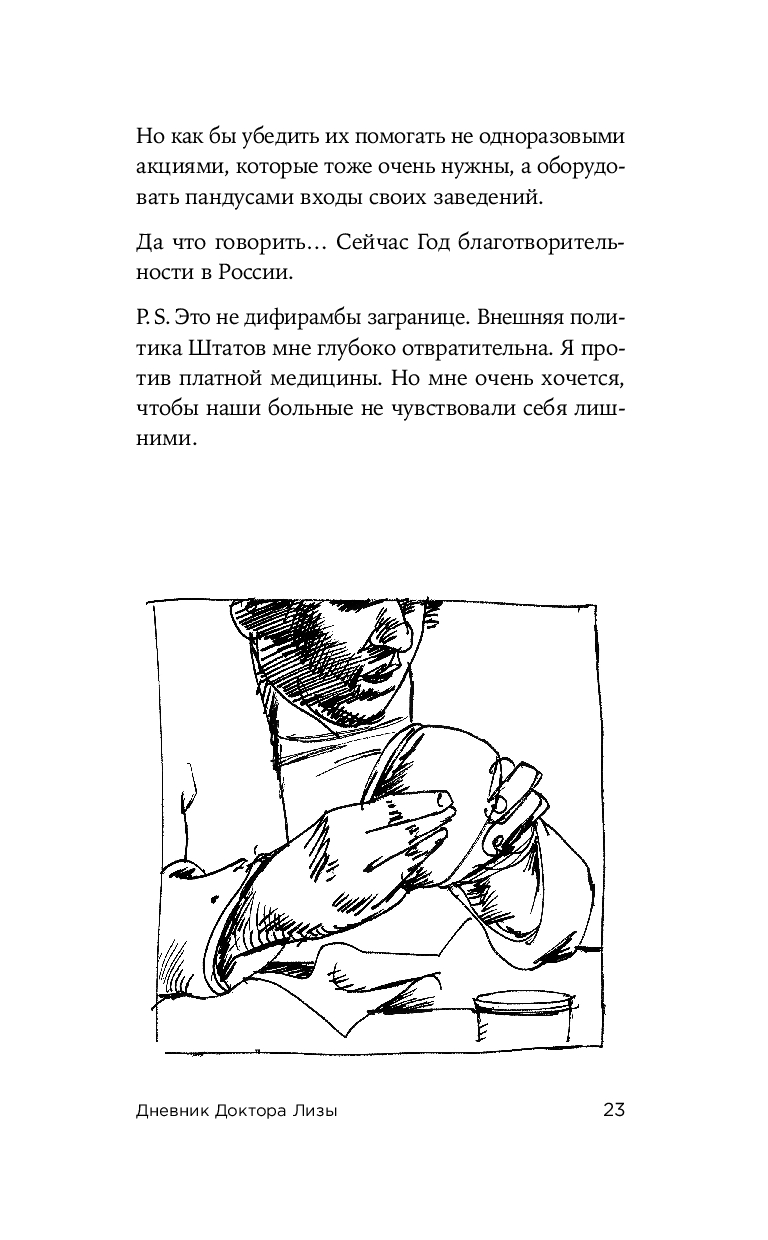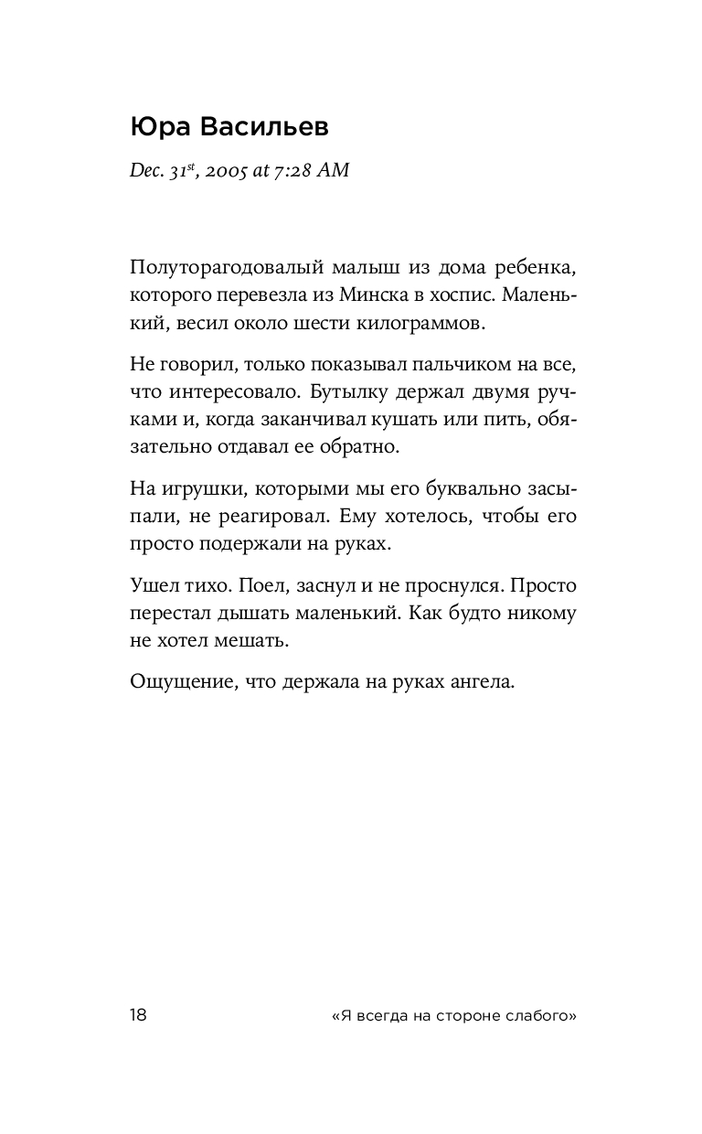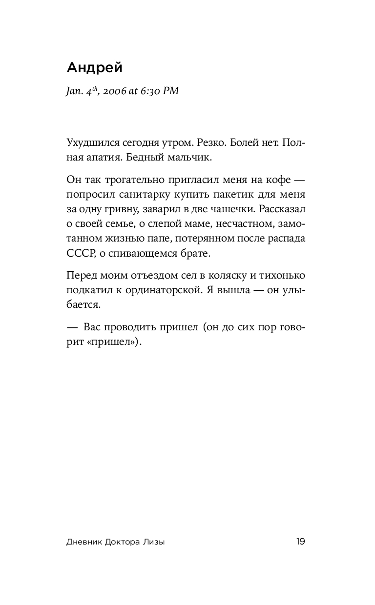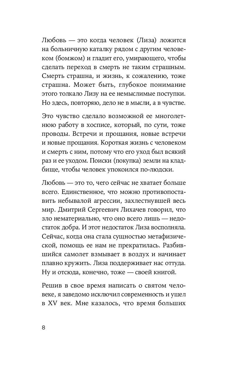 Доктор Лиза посвятила жизнь помощи тем, о ком общество часто забывает: бездомным, неизлечимо больным, одиноким. Книга открывает глаза на жестокую реальность их существования, заставляя задуматься о человечности и сострадании. В основу книги легли дневники доктора Лизы; вторую часть составляют ее интервью, в которых она много говорит о "Справедливой помощи", о своих подопечных и – совсем немного – о себе. В книгу также вошли мемуарный очерк Глеба Глинки и предисловие Евгения Водолазкина.