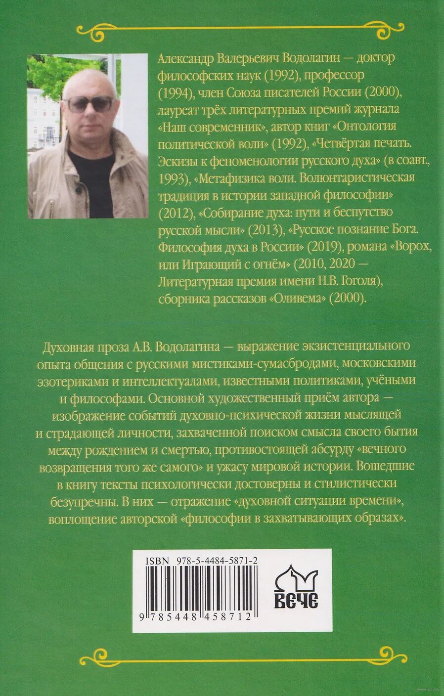 Духовная проза А.В. Водолагина – выражение экзистенциального опыта общения с русскими мистиками-сумасбродами, московскими эзотериками и интеллектуалами, известными политиками, учеными и философами. Основной художественный прием автора – изображение событий духовно-психической жизни мыслящей и страдающей личности, захваченной поиском смысла своего бытия между рождением и смертью, противостоящей абсурду "вечного возвращения того же самого" и ужасу мировой истории. Вошедшие в книгу тексты психологически достоверны и стилистически безупречны. В них – отражение «духовной ситуации времени», воплощение авторской "философии в захватывающих образах".