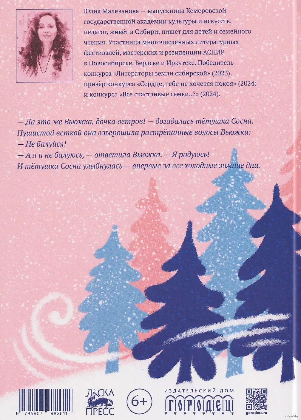 В новой книге Юлии Малевановой мы знакомимся с целым семейством зимних ветров: папа Северный Ветер, мама Вьюга, дедушка Мороз, бабушка Метелица и, конечно же, их дочка-внучка – девочка Вьюжка. Они гуляют по сибирским лесам, посещают города, дружат с зайцами и соснами. А главное – никогда не теряют хорошего настроения.