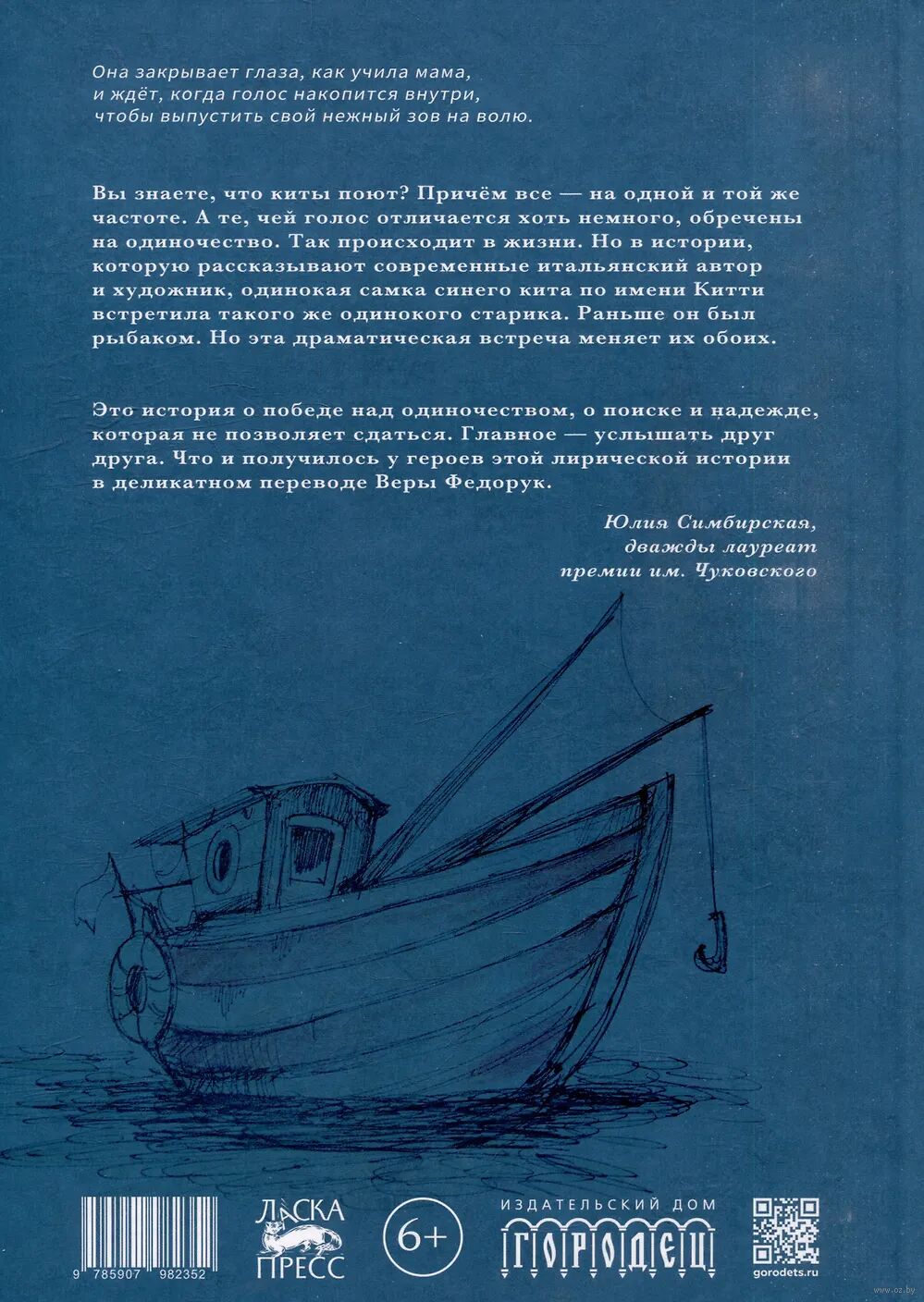 Киты тоже "поют". Причём все представители одного вида поют на одной частоте. А тех, чьё пение хоть немного отличается, их сородичи просто не слышат. Это научный факт‚ отталкиваясь от которого современные детский писатель и иллюстратор из Италии создают яркую запоминающуюся притчу об отчуждении и о возможности его преодоления – несмотря ни на что.