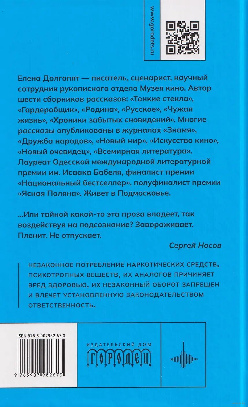В короткой и невероятно кинематографичной прозе Елены Долгопят высокое не схлестывается с обыденным, а становится естественной средой обитания ее персонажей. Литературные сюжеты, знакомые со школьной скамьи каждому, продолжают свое развитие в московских переулках. Здесь есть место мистике в ее гоголевском и булгаковском изводе, события подчиняются логике волшебной сказки, трагедии же героев, вполне современных, соизмеримы с чеховскими и толстовскими.