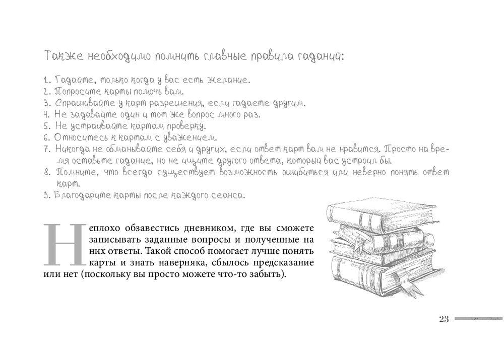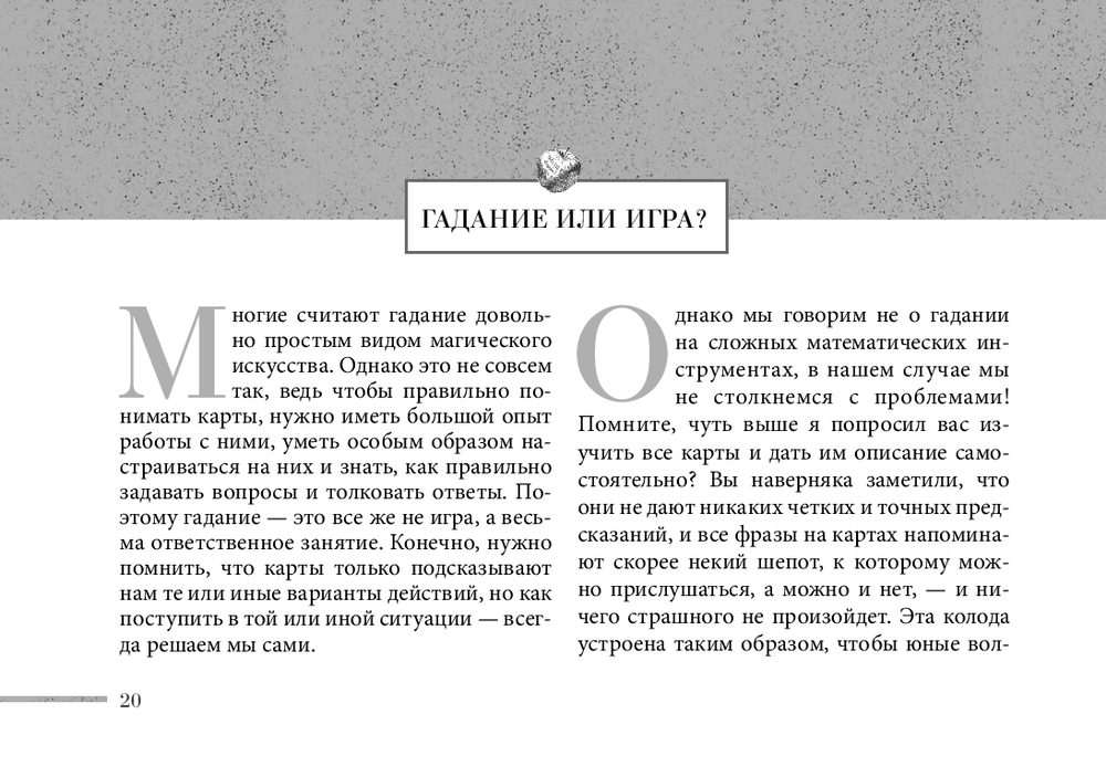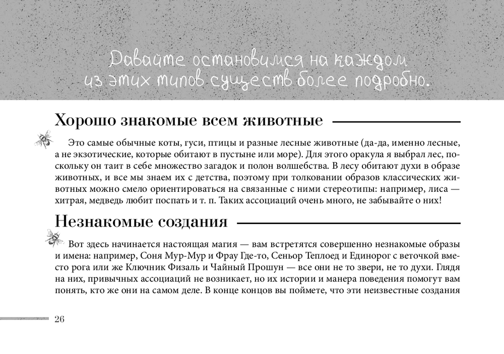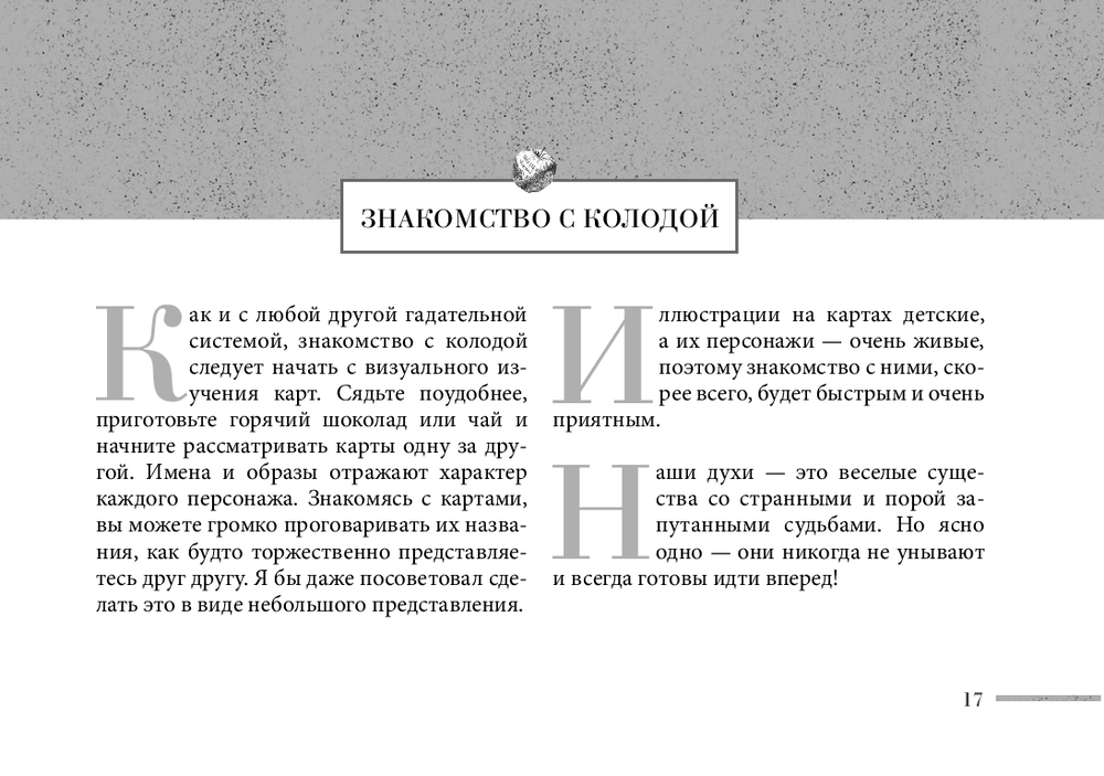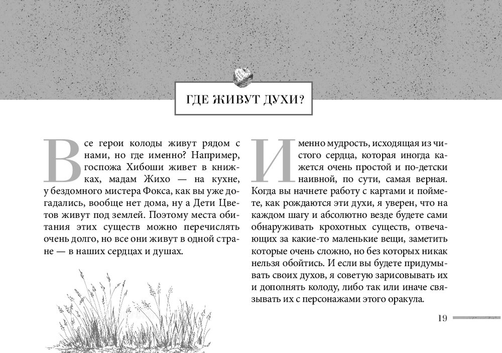 Кто рисует сны и где хранятся теплые воспоминания? Куда пропадают упавшие звезды? Кто сушит листья после дождя? А кто кладет подарки под елку? Об этом и многом другом вам расскажут герои оракула – Мадам Жихо, Соня Мур-Мур, Единорог Флорис, Доедашка Ням-Ням или прочие милые создания, живущие в самых неожиданных местах. Каждая карта сопровождается небольшими вопросами и заданиями: эти легкие и веселые практики помогут вам лучше познакомиться с колодой и научиться применять мудрость карт в собственной жизни. Они учат быть вежливыми, скромными и позитивными, ценить дружбу, радоваться обыденным вещам, узнавать новое – и многому-многому другому.