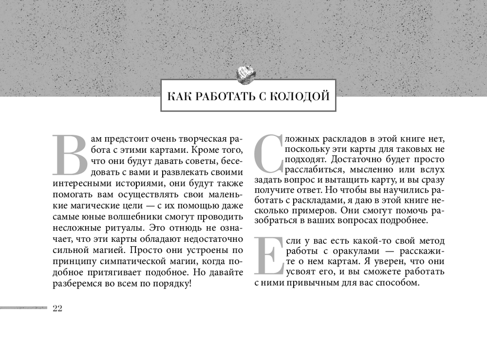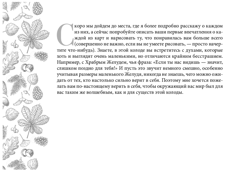 "Работая над созданием этого оракула, я попытался показать, как знакомый нам мир мог бы выглядеть, если бы мы оставались в душе детьми. Несмотря на то, что эта колода предназначена для маленьких и юных волшебников, я надеюсь, что она понравится и тем взрослым, которые исследуют различные таинственные миры. Если вы готовы отправиться со мной в путешествие в этот удивительный мир, где все наполнено жизнью, светом и любовью, то вам нужно лишь перевернуть страницу и ступить на путь магии и волшебства!"