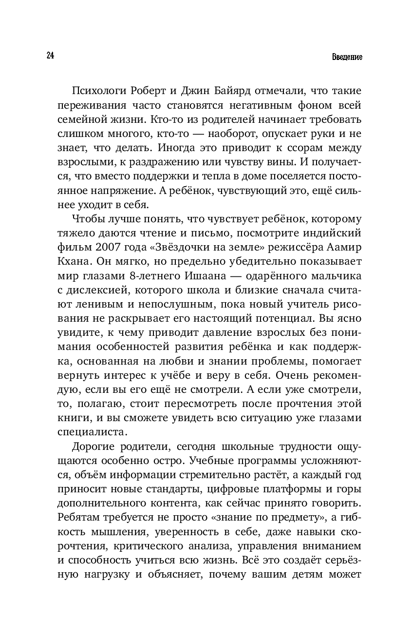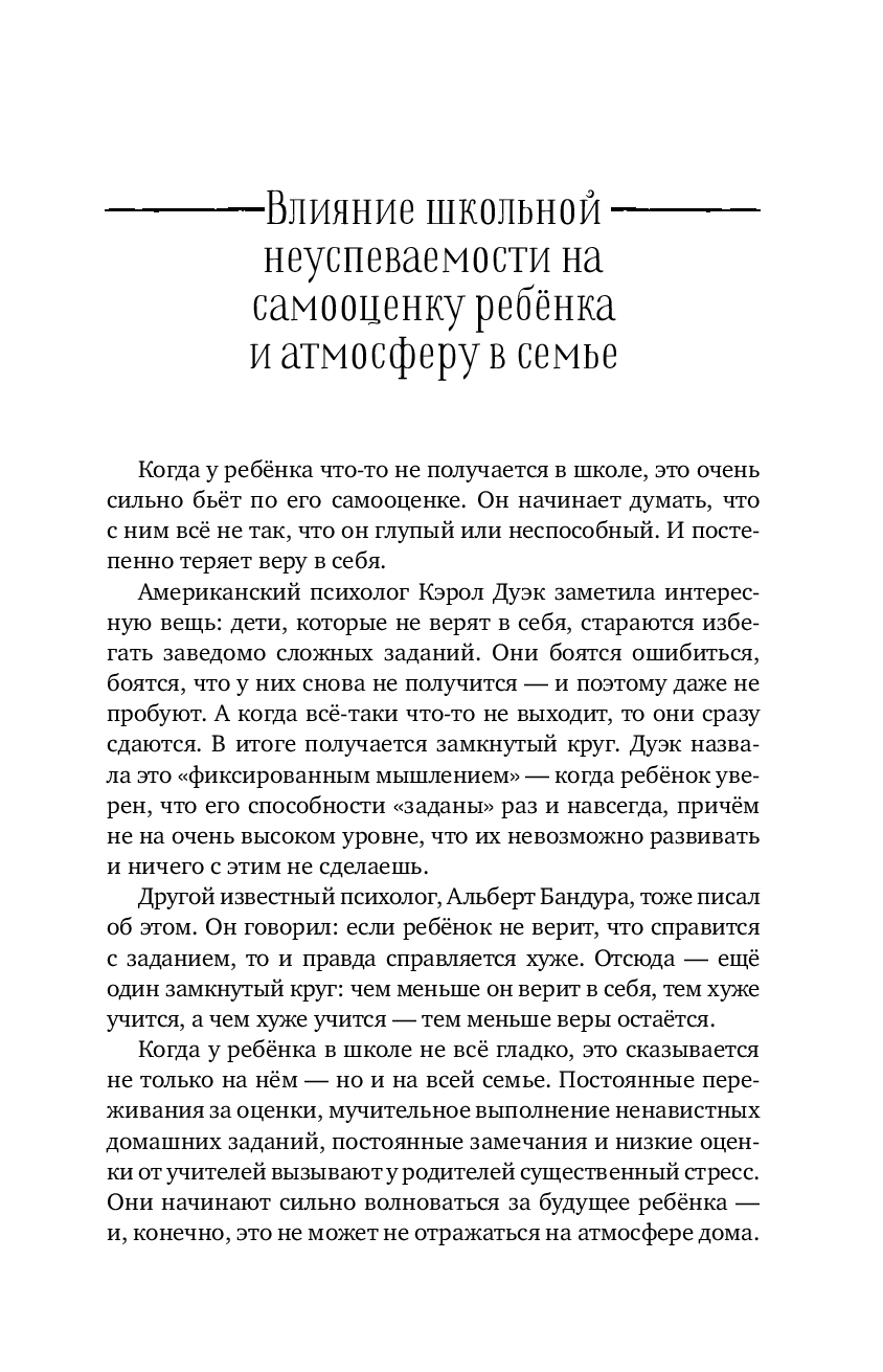 В своей книге автор приводит важные доводы и рассказывает читателю простым, можно сказать дружеским, языком, что "безнадёжных" детей не бывает, а бывают неподходящие методы поддержки и коррекции. Развенчивает мифы о "ленивых" и "неспособных" учениках, даёт научно обоснованные, но теплые и мотивирующие рекомендации, помогая сохранить уверенность и доверительные отношения с ребёнком.