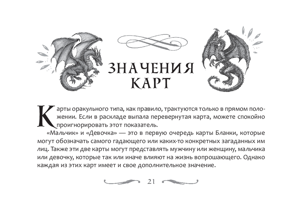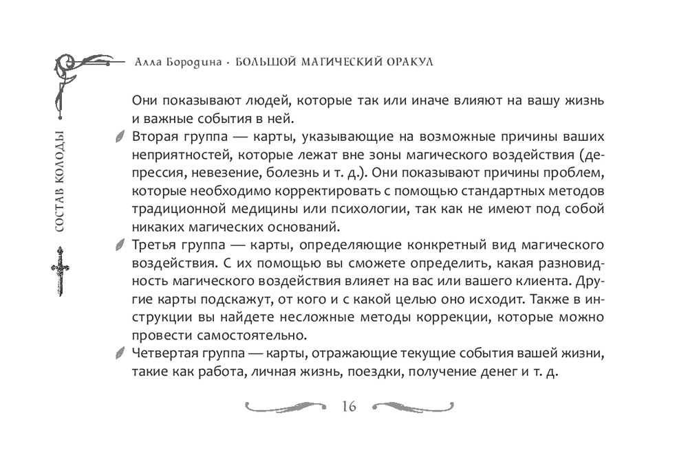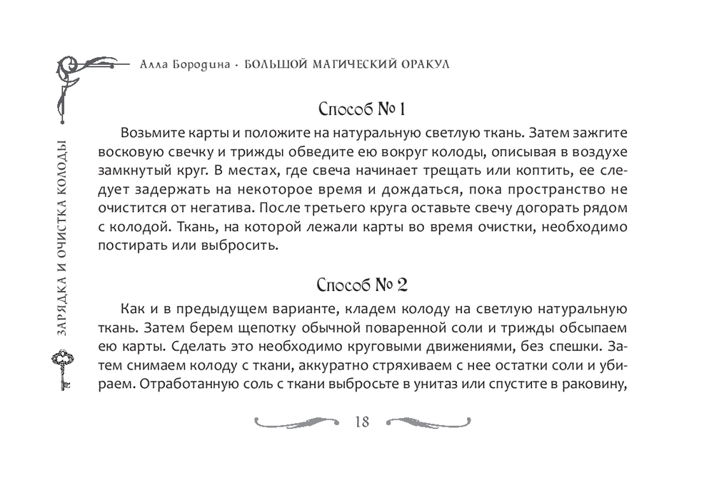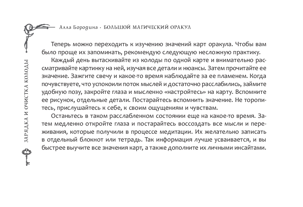К набору прилагается брошюра: в ней собраны значения всех карт, описаны семь раскладов – от простых до многоуровневых, даны практические рекомендации и советы по тому, как скорректировать негативный расклад, зарядить колоду, очистить свою энергетику и помещение.